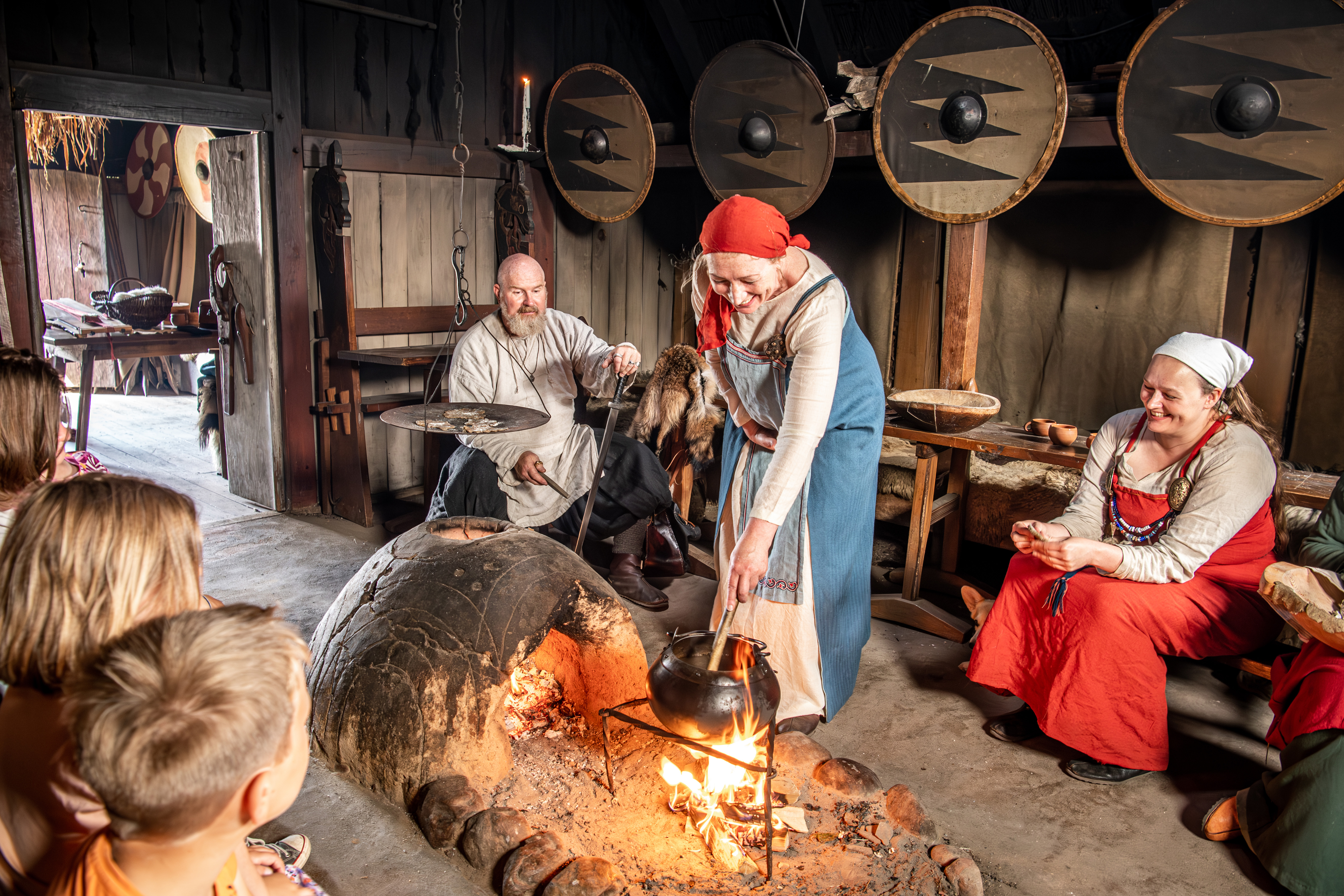 Wer Hunger hat, kann sich in der Wikingerhalle niederlassen und eine leckere Mahlzeit genießen - inspiriert von den Zutaten der Wikingerzeit. – ihr könnt auch draußen in der Sonne sitzen, oder lieber im Schatten in den neuen, offenen Speisehallen. Falls ihr euer eigenes Essen mitgebracht habt, sucht ihr einfach einen Tisch, der für Familien reserviert ist, die sich selbst versorgen.