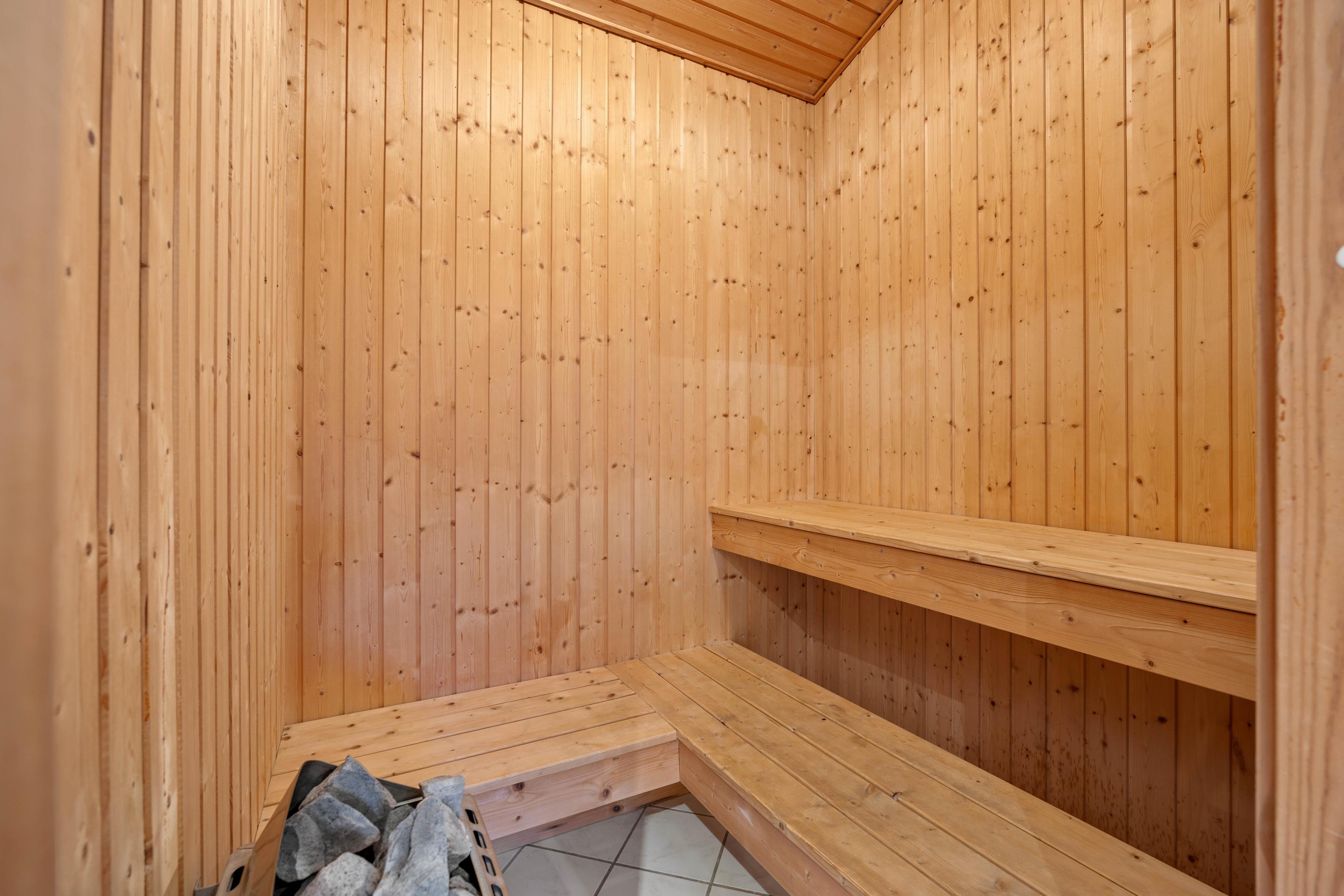 Lesesessel und Sofas im Wohnbereich laden zum gemütlichen Beisammensein, Lesen oder Spielen ein. Währendessen könnt ihr den Blick durch die Fensterfront, die für Helligkeit im Innenraum sorgt, in den grossen Garten schweifen lassen. Nach einem langen Spaziergang oder Strandtag lässt es sich im Whirlpool und der Sauna besonders gut entspannen. Mit der energiesparenden Wärmepumpe habt ihr es drinnen auch an kälteren Tage wohlig warm.