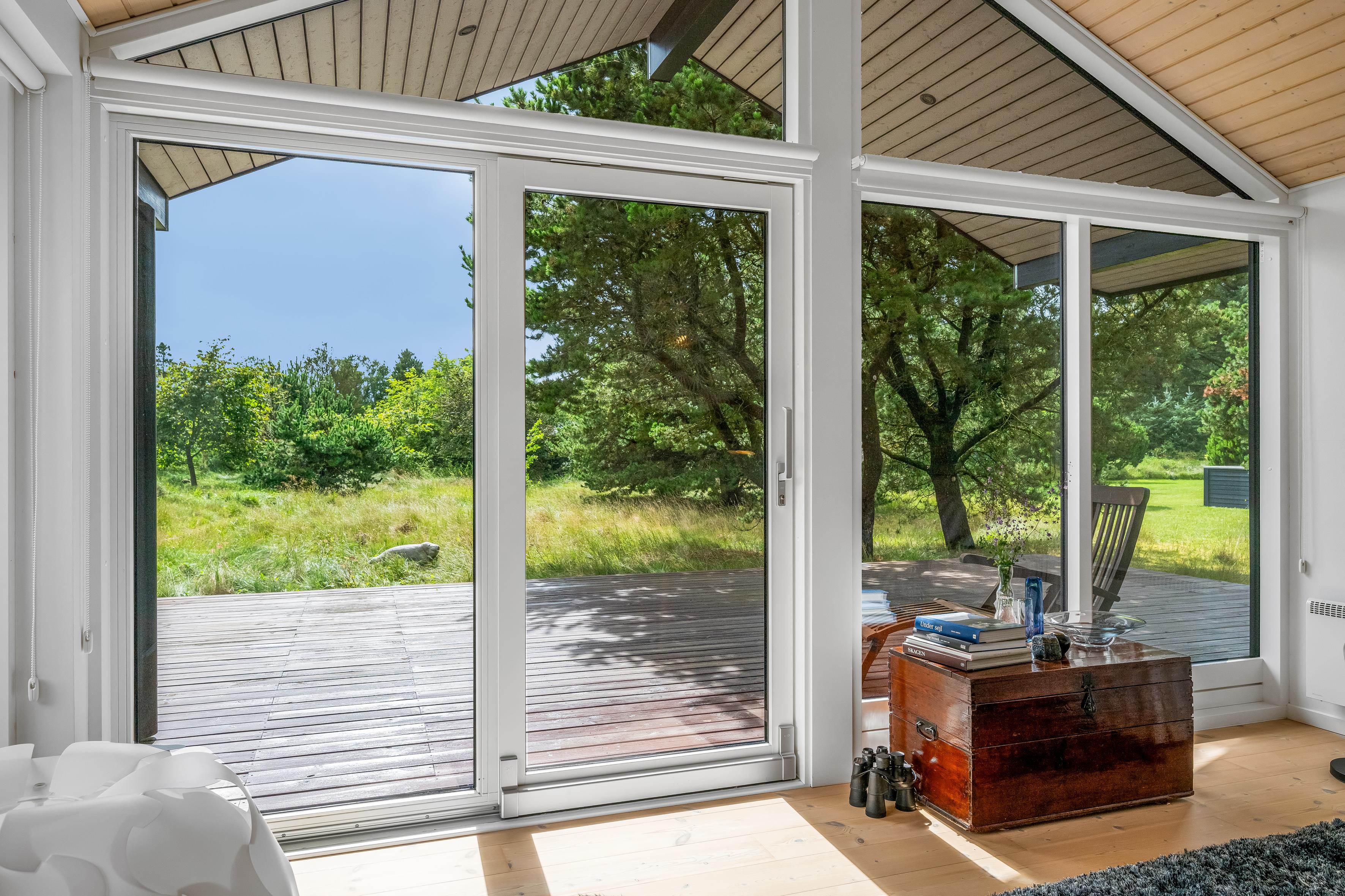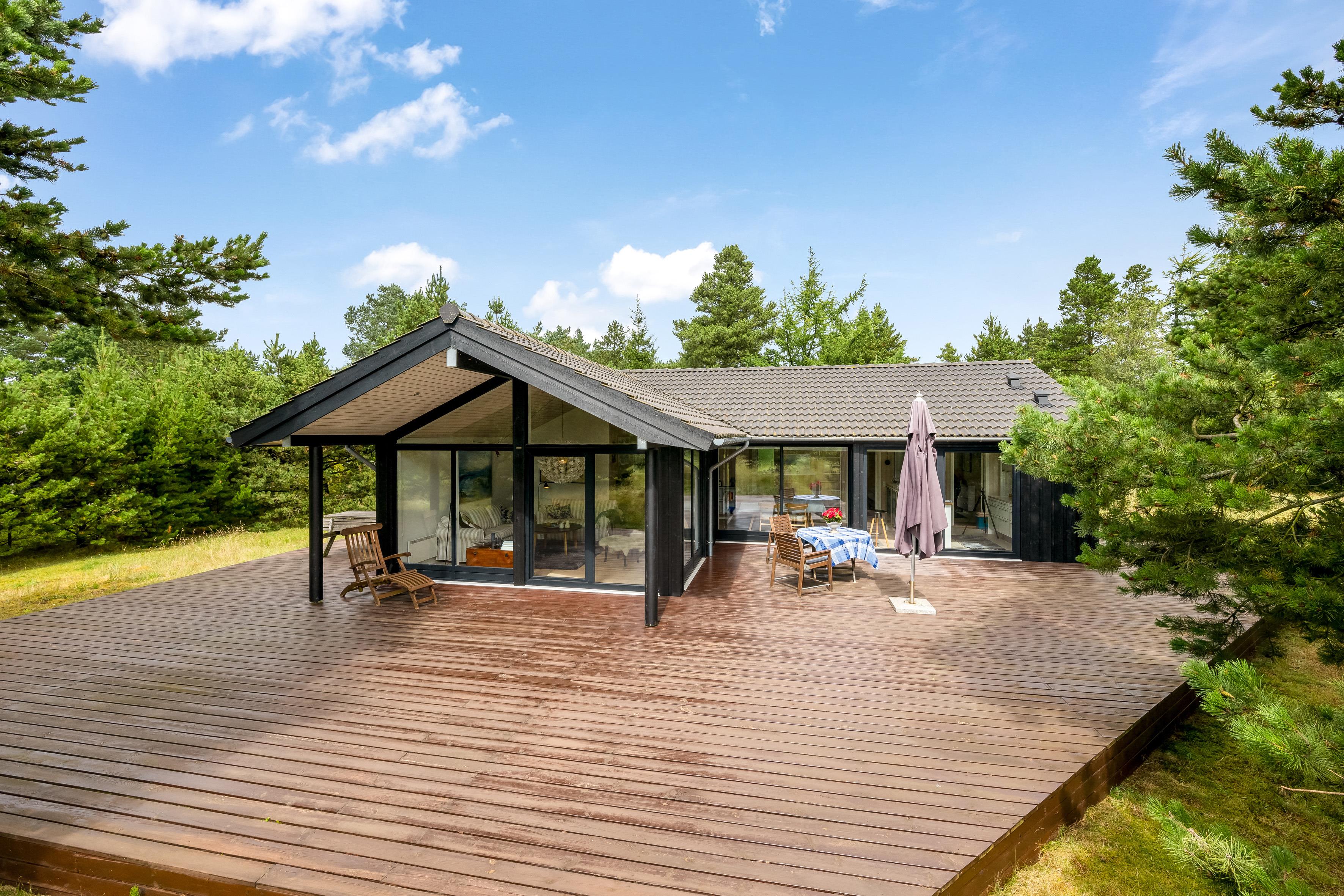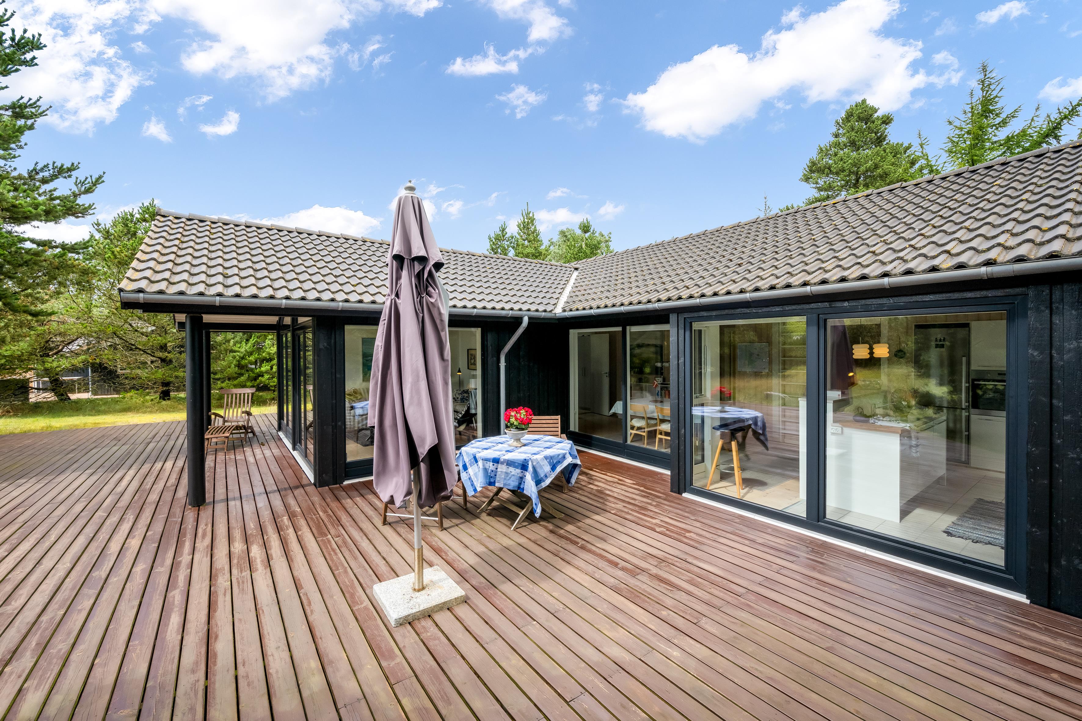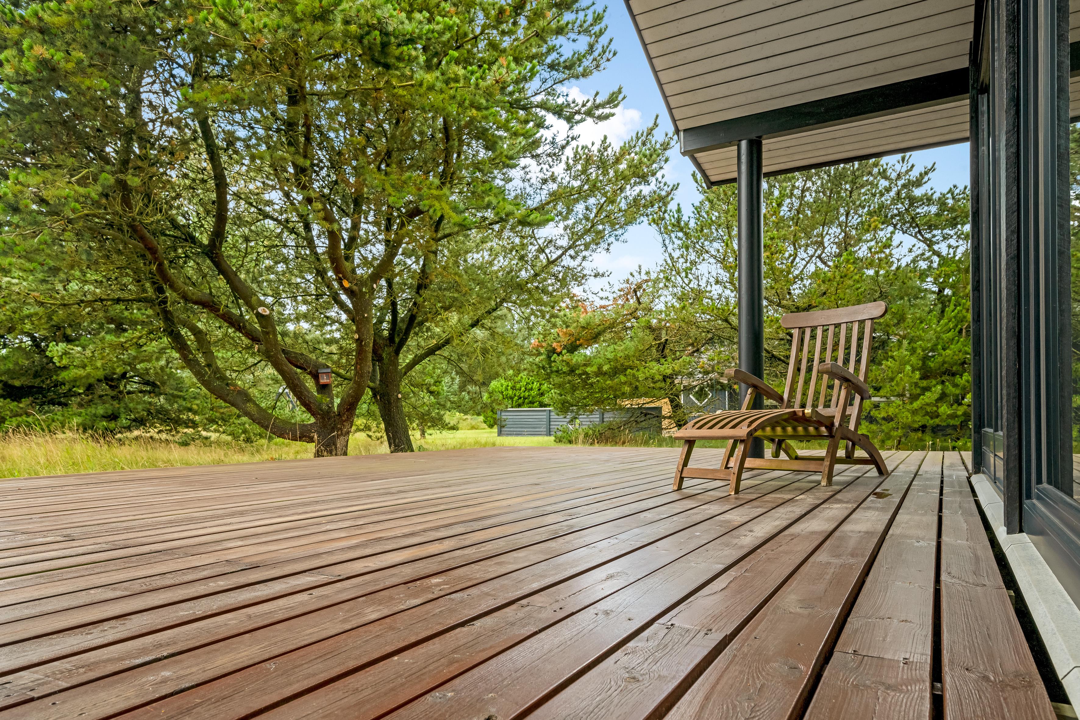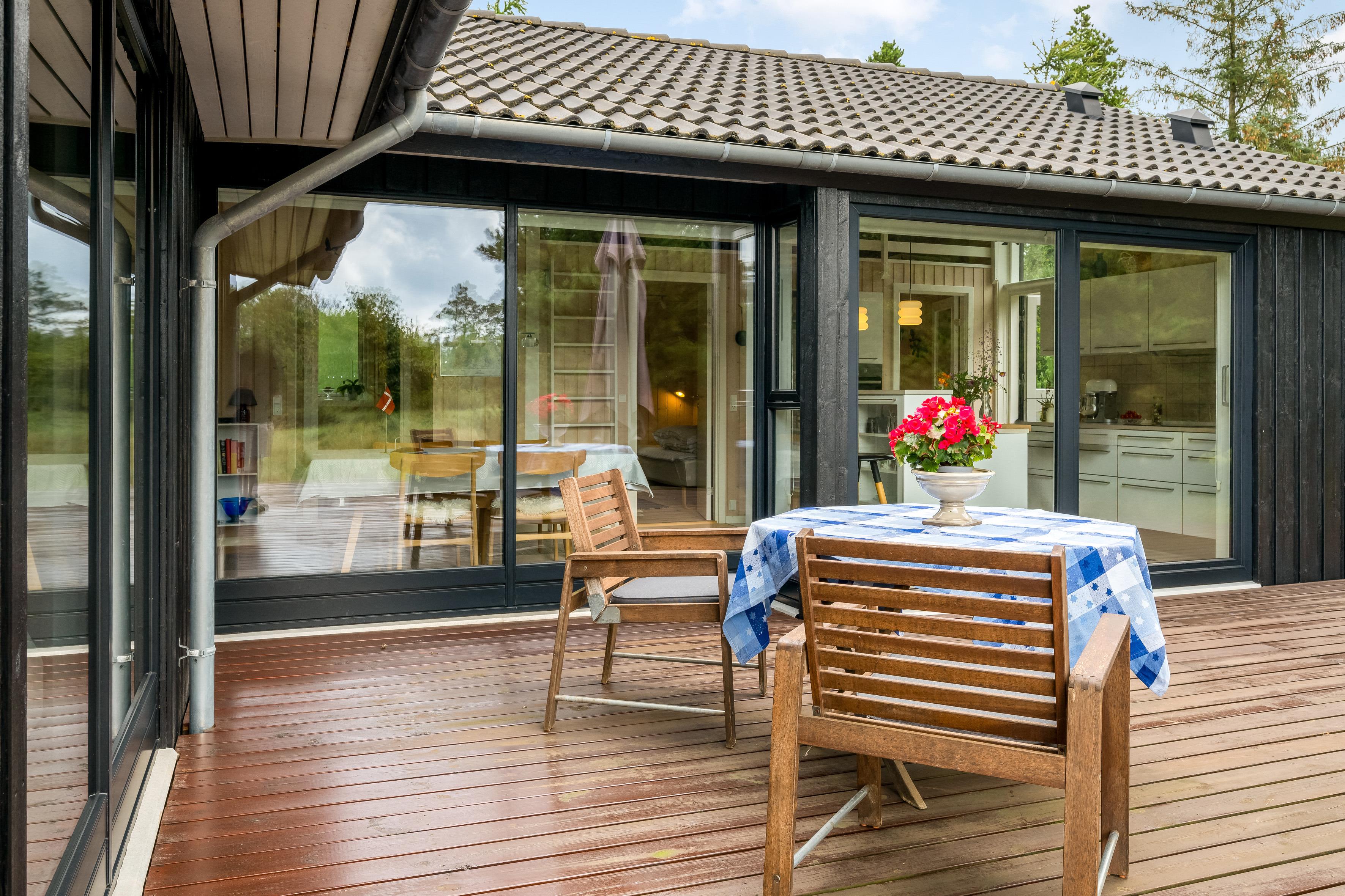 Die großzügige, teils überdachte und teils abgeschirmte Terrasse verläuft an drei Seiten des Ferienhauses und ist ideal, um sowohl Sonnenstrahlen als auch kühle Schattenplätze zu finden. Hier könnt ihr die frische Luft und die wunderbare Natur genießen und die Seele baumeln lassen.