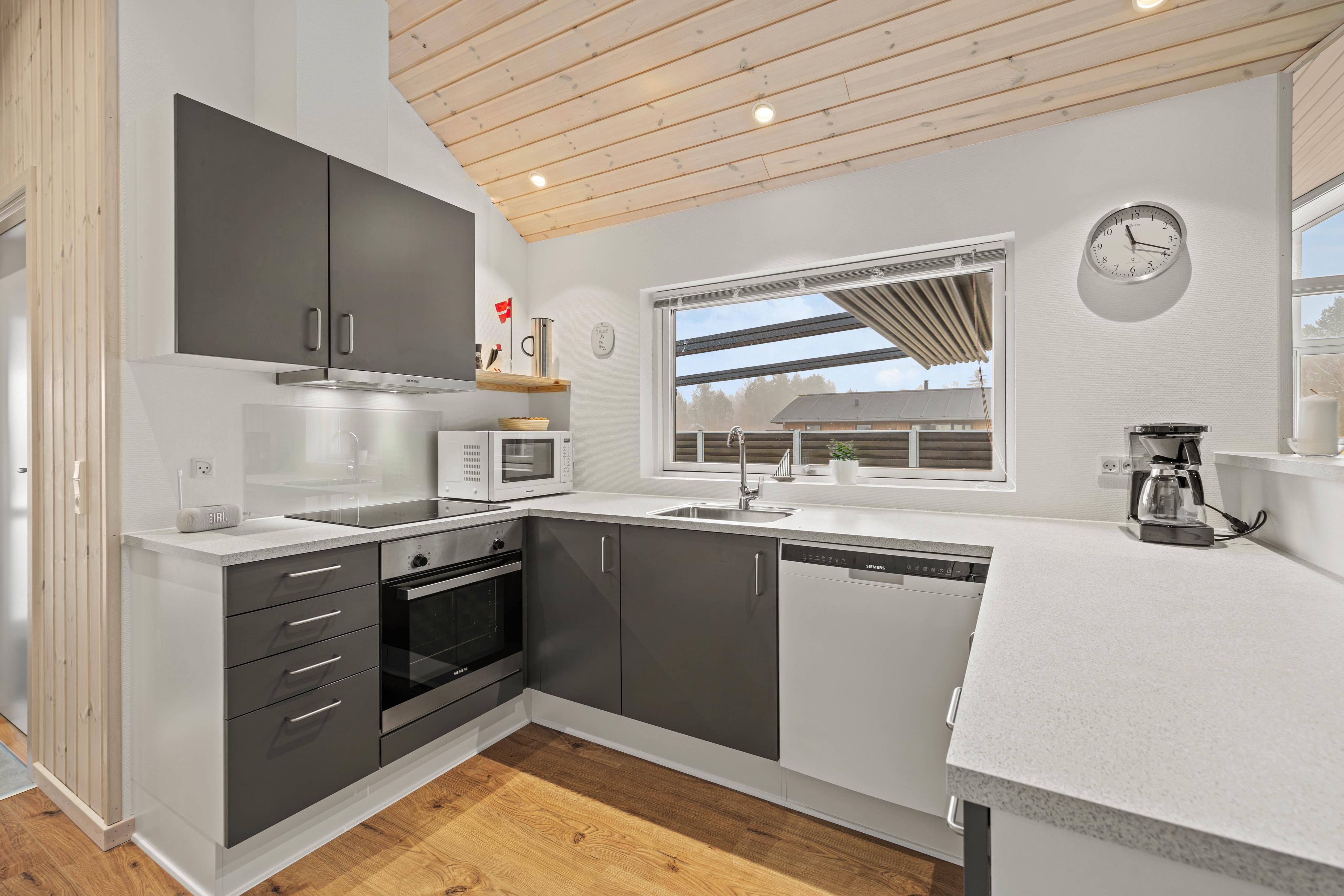 Die offene Küche lässt keine Wünsche offen und verfügt über einen Induktionsherd, eine Spülmaschine, eine Mikrowelle sowie einen Kühlschrank mit 70 l Gefriermöglichkeit. Hier könnt ihr euch bei geselligen Kochabenden austoben und leckere Mahlzeiten kreieren.