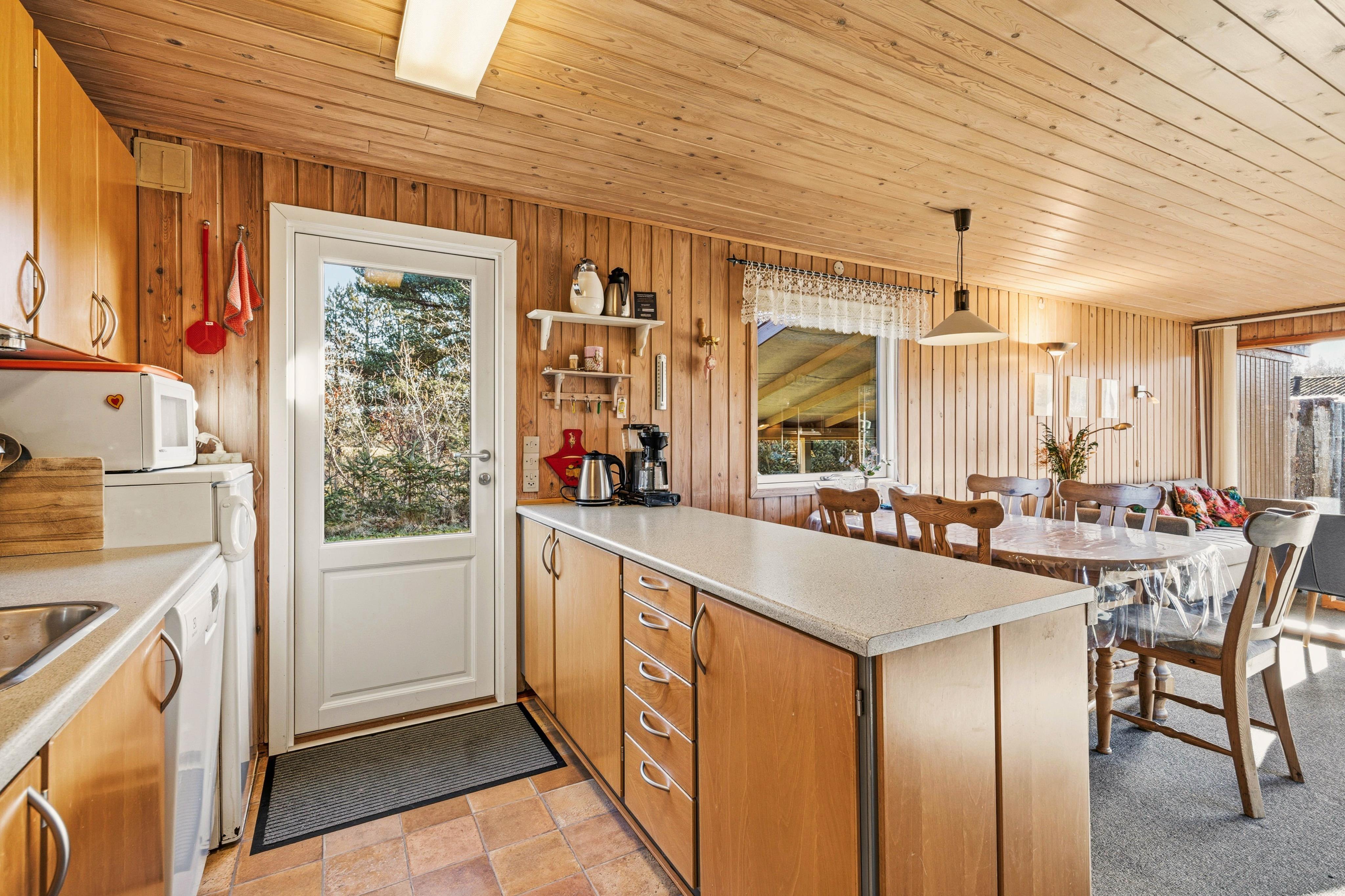 Die offene Küche ist funktional ausgestattet, damit ihr ohne großen Aufwand kochen könnt: Spülmaschine, Mikrowelle, Elektroherd sowie ein Kühlschrank mit Gefrierfach sind vorhanden. Zusätzlich gibt es eine extra 200 l Gefriermöglichkeit – ideal für die Angler unter euch, die ihren Fang oder Vorräte bequem lagern möchten.