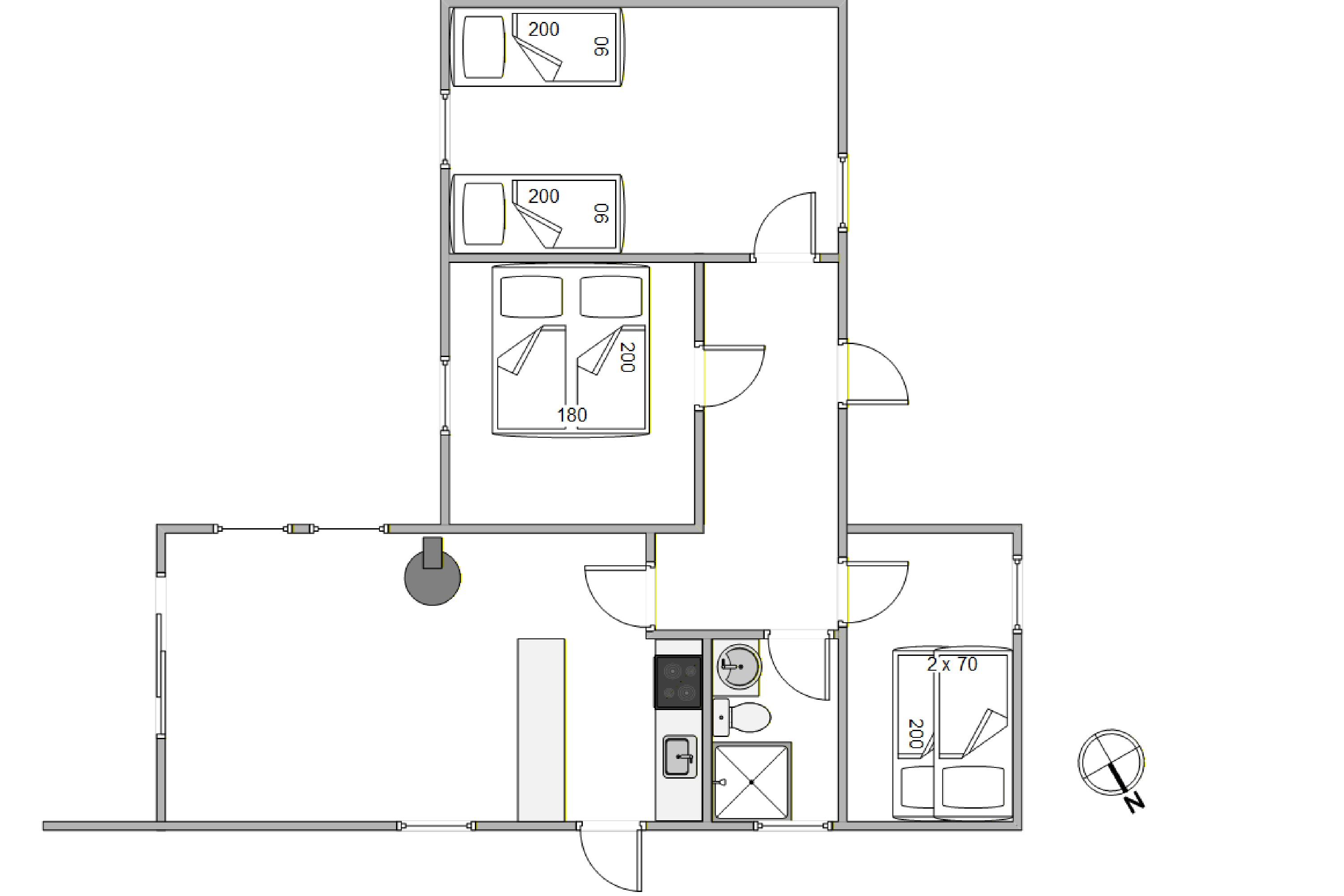 Auch im Alltag punktet das Ferienhaus: Im Bad sorgt die Fußbodenheizung für angenehmen Komfort, und mit Waschmaschine sowie Trockner bleibt ihr selbst bei längeren Aufenthalten flexibel. Für die Nachtruhe stehen euch 3 Schlafzimmer zur Verfügung: 1 Schlafzimmer mit Doppelbett (180 × 200 cm), 1 Schlafzimmer mit 2 Einzelbetten (2 × 80 × 190 cm) und 1 Schlafzimmer mit Hochbett (2 × 70 × 190 cm).