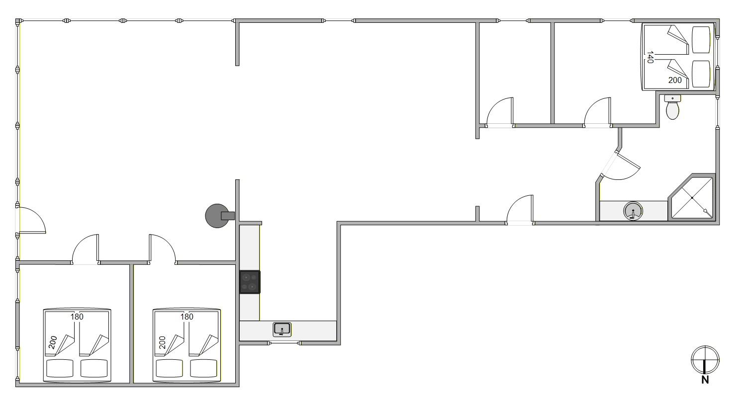 Die Raumaufteilung umfasst außerdem 3 gemütliche Schlafzimmer mit Doppelbetten, ideal für bis zu 6 Personen. Das Badezimmer mit Dusche sorgt dank Fußbodenheizung für zusätzlichen Komfort. Zudem steht im Ferienhaus eine Waschmaschine zur Verfügung, die euren Aufenthalt noch angenehmer macht.