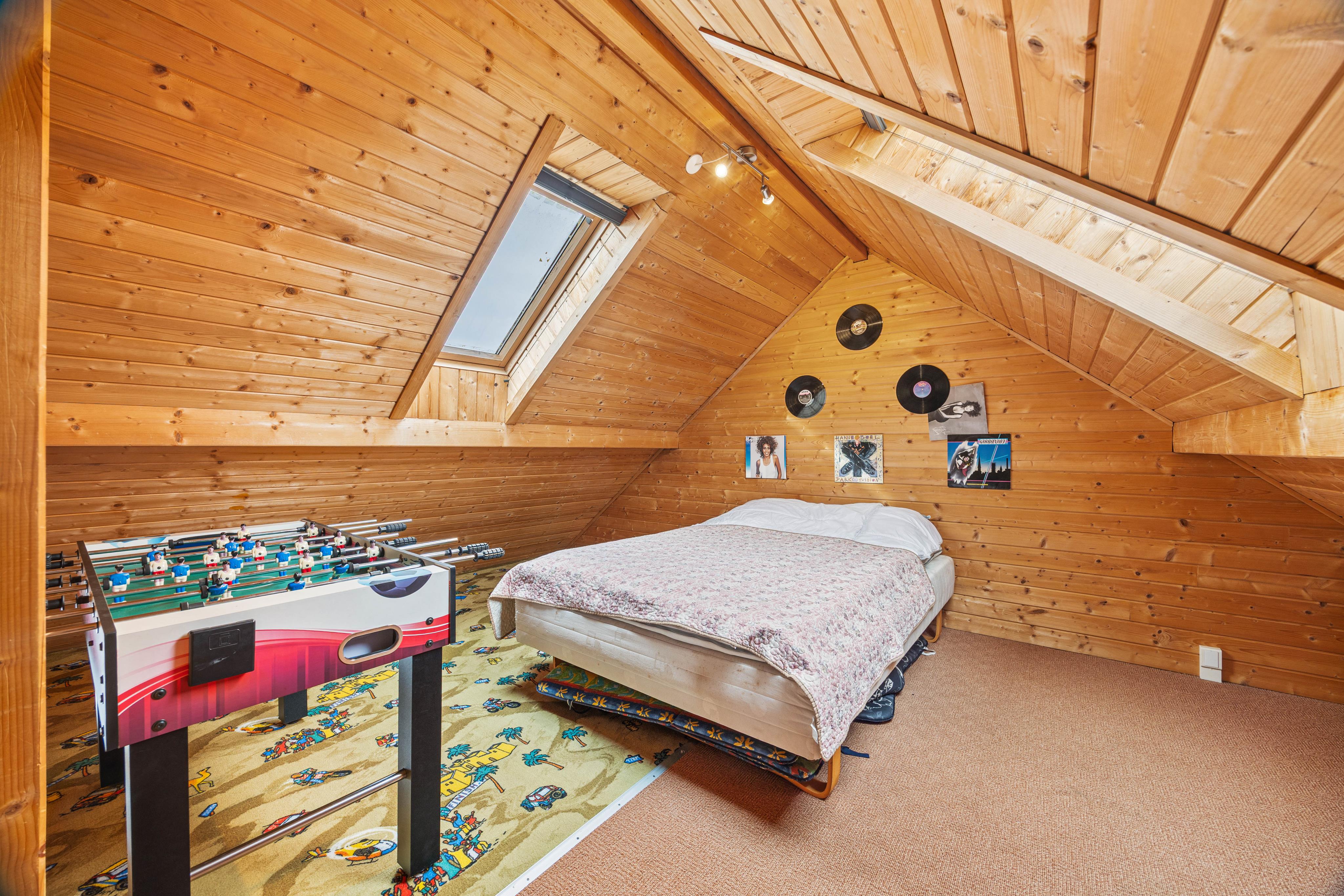Der große Dachboden bietet zusätzlichen Platz zum Entspannen und für Unterhaltung, und ist unter anderem mit einem Sofa und einem Tischfußballspiel ausgestattet. Es ist der perfekte Ort für ungezwungene Gemütlichkeit, wo ihr Tischfußball spielen oder einfach nur mit einem guten Buch entspannen könnt. Der Dachboden schafft einen zusätzlichen Raum, der als toller Rückzugsort für Kinder und Erwachsene dient.