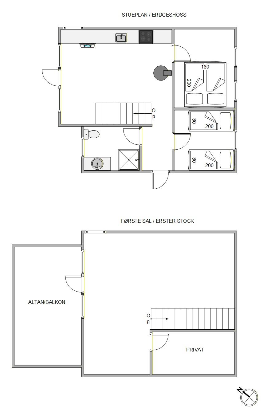 Im Erdgeschoss befinden sich sowohl die offene Küche, der Essbereich als auch die beiden schönen Schlafzimmer. Eines ist mit einem Doppelbett und das andere mit 2 Einzelbetten ausgestattet. Das kleine Bad verfügt über eine Dusche und Fußbodenheizung. Außerdem gibt es eine Waschmaschine, sodass ihr flexibler packen könnt und trotzdem das Praktische im Griff habt. Auf der 1. Etage befindet sich das gemütliche Wohnzimmer mit Zugang zum Balkon – ideal für ein abendliches Glas Wein oder einen gemeinsamen Fernsehabend.