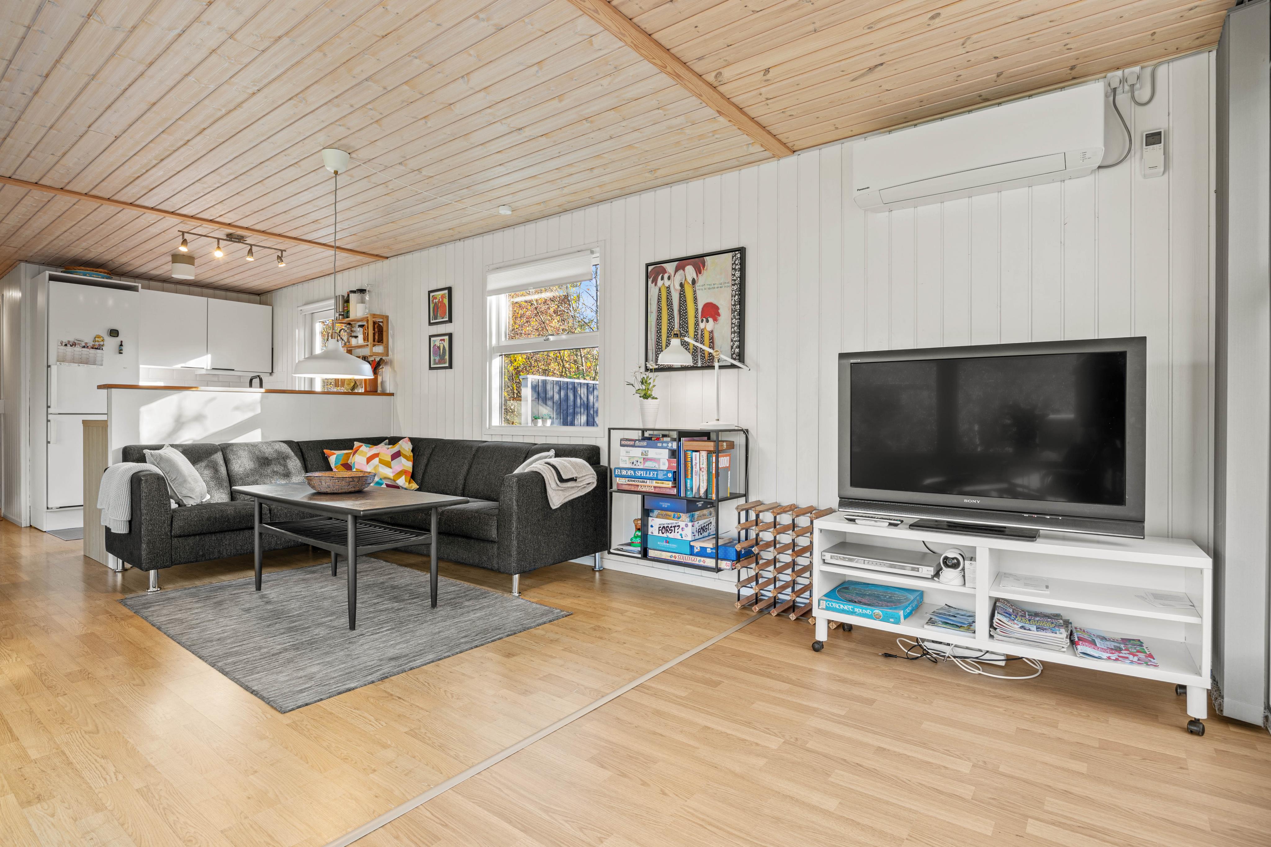 Im Inneren erwartet euch ein schöner, heller Wohnraum mit Holzboden, der mit liebevollen Details gestaltet ist, um dem Raum eine gemütliche und einladende Atmosphäre zu verleihen. Zur Unterhaltung stehen euch ein Fernseher und ein DVD-Player zur Verfügung. Macht es euch auf dem Sofa bequem und macht einen DVD-Abend mit der Familie und selbstgemachtem Popcorn.