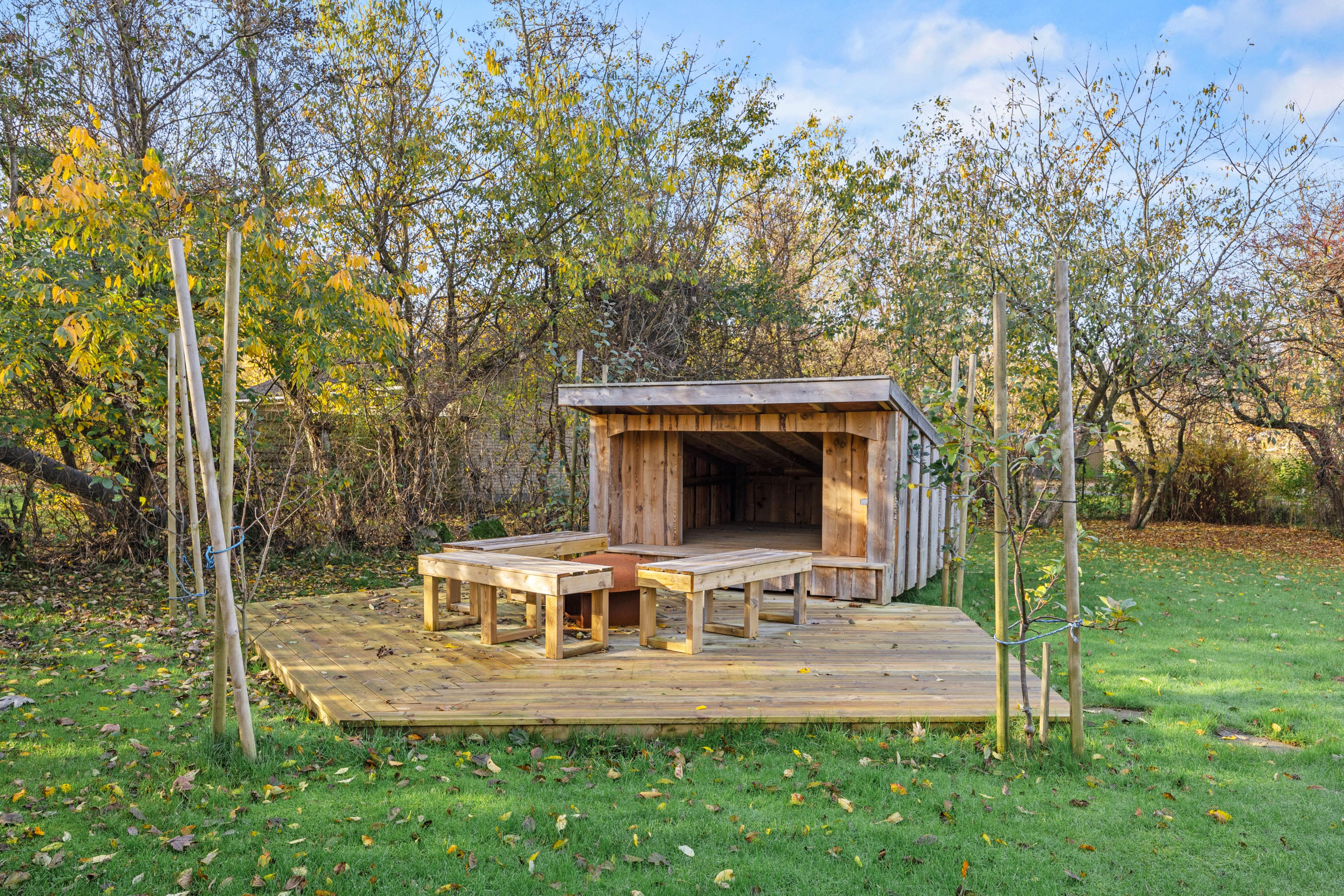 Die verschiedenen Terrassenbereiche – teils überdacht und teils abgeschirmt – bieten vielfältige Möglichkeiten, die Natur zu genießen und gesellige Stunden im Freien mit der Familie zu verbringen. Ein Shelter steht für Übernachtungen im Freien ebenfalls zur Verfügung.