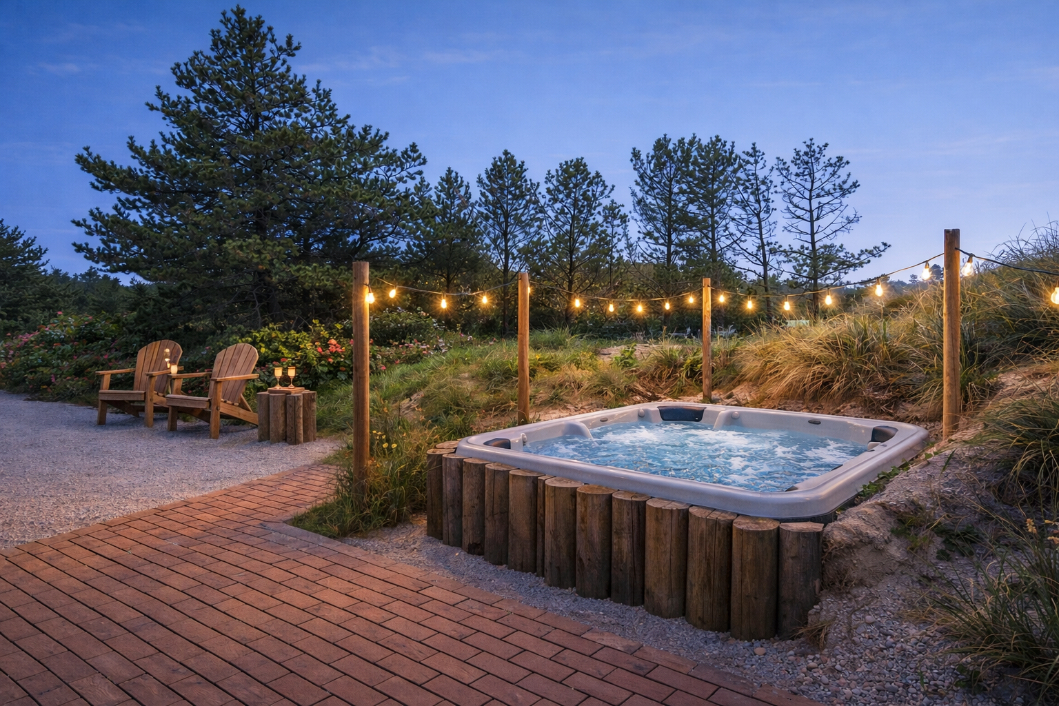 Der Außenwhirlpool sorgt für besonders viel Entspannung und hyggelige Gefühle, mit der Lichterkette und den Holzbalken wirst du dich hier sicher direkt wohlfühlen und den alltag hinter dir lassen.