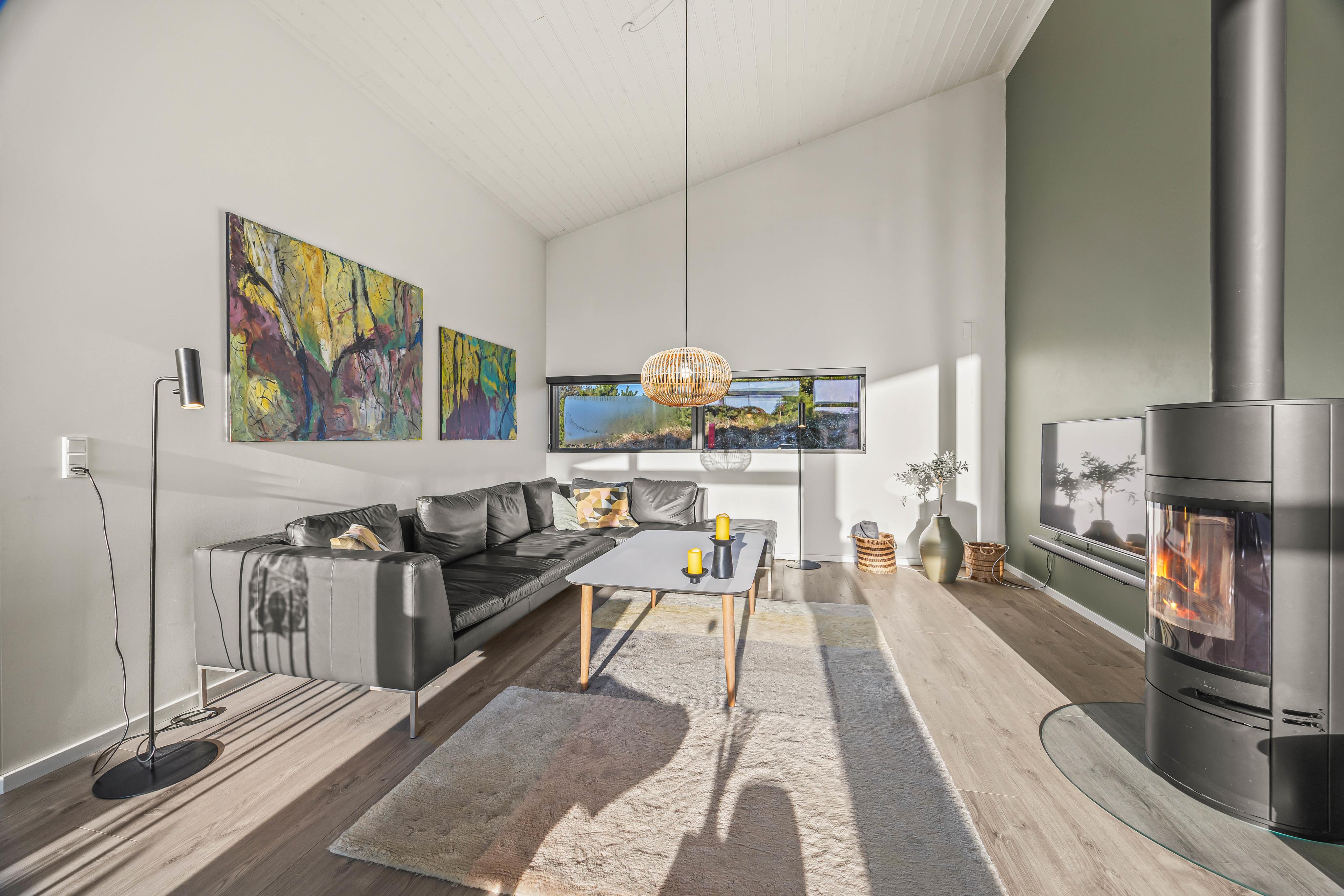Das Zentrum eures Feriendomizils bildet der helle, freundliche Wohnbereich mit hohen Decken und großer Fensterfront. Hier könnt ihr es euch in den komfortablen Sitzmöbeln bequem machen und gemeinsam fernsehen oder dem Knistern des Kaminofens lauschen. Von hier habt ihr auch eine schöne Aussicht auf die euch umgebenden Dünen.