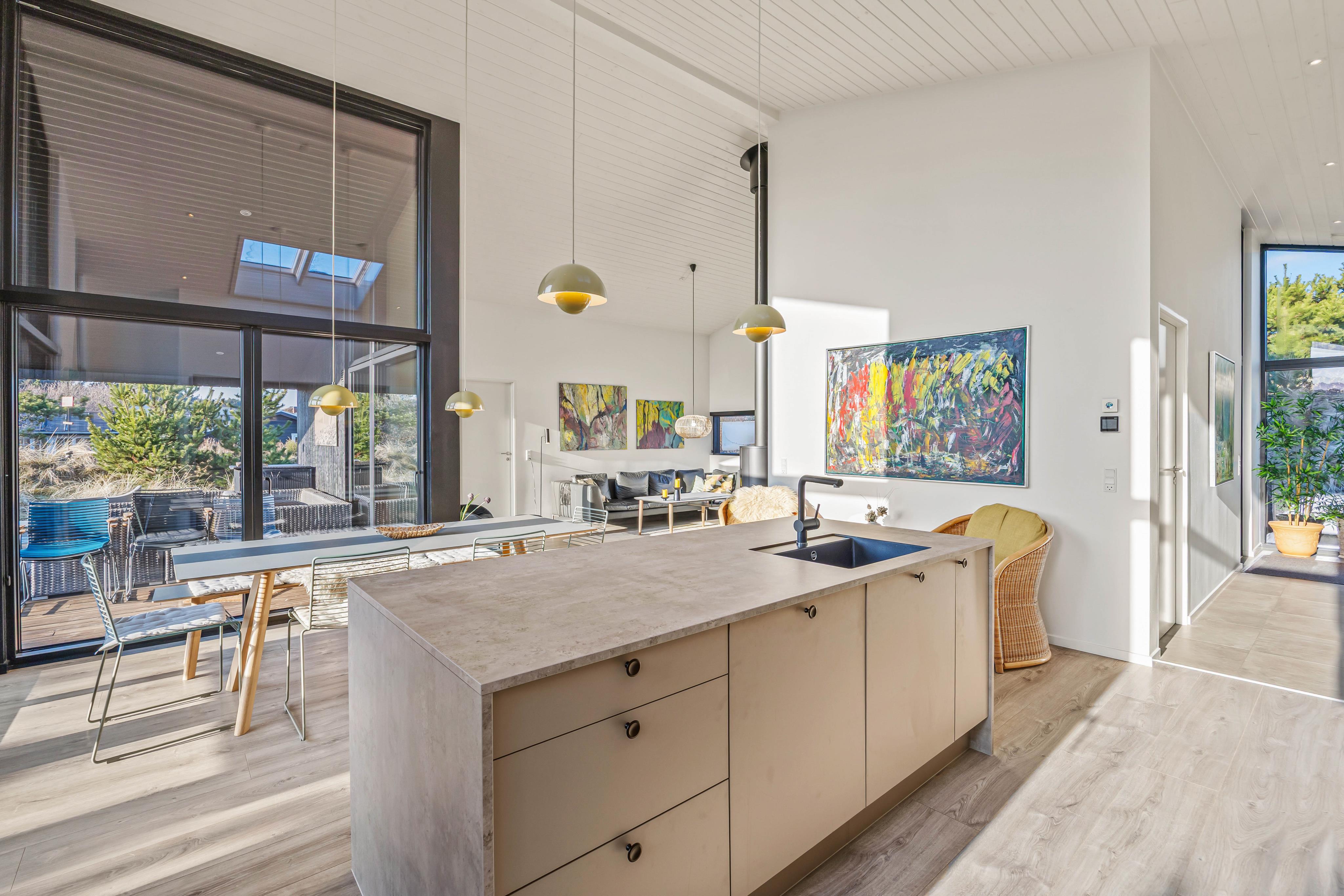 Das Ferienhaus verfügt über eine Fußbodenheizung, die mit einer Wärmepumpe betrieben wird. So könnt ihr Energie und somit Kosten einsparen. Der Wohnbereich geht in die Küche mit Essplatz über. Die offene Küche mit Insel, ist mit modernen Elektrogeräten ausgestattet. Sogar an einen Weinkühlschrank wurde gedacht.
