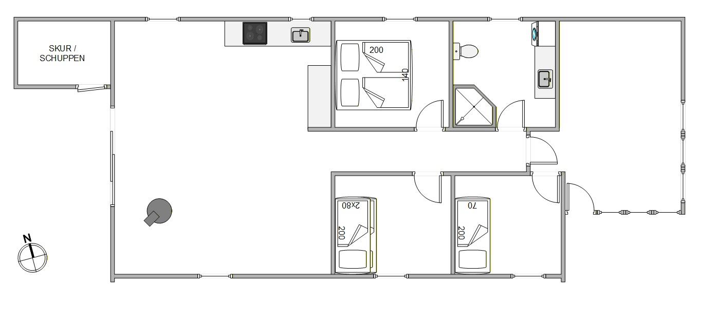 Die fünf Schlafplätze verteilen sich auf drei Schlafzimmer, eines mit einem Doppelbett, eines mit einem Etagenbett und eines mit einem Einzelbett. Der Wintergarten mit einem Alkoven unterstreicht den typischen Ferienhauscharme dieses Hauses.