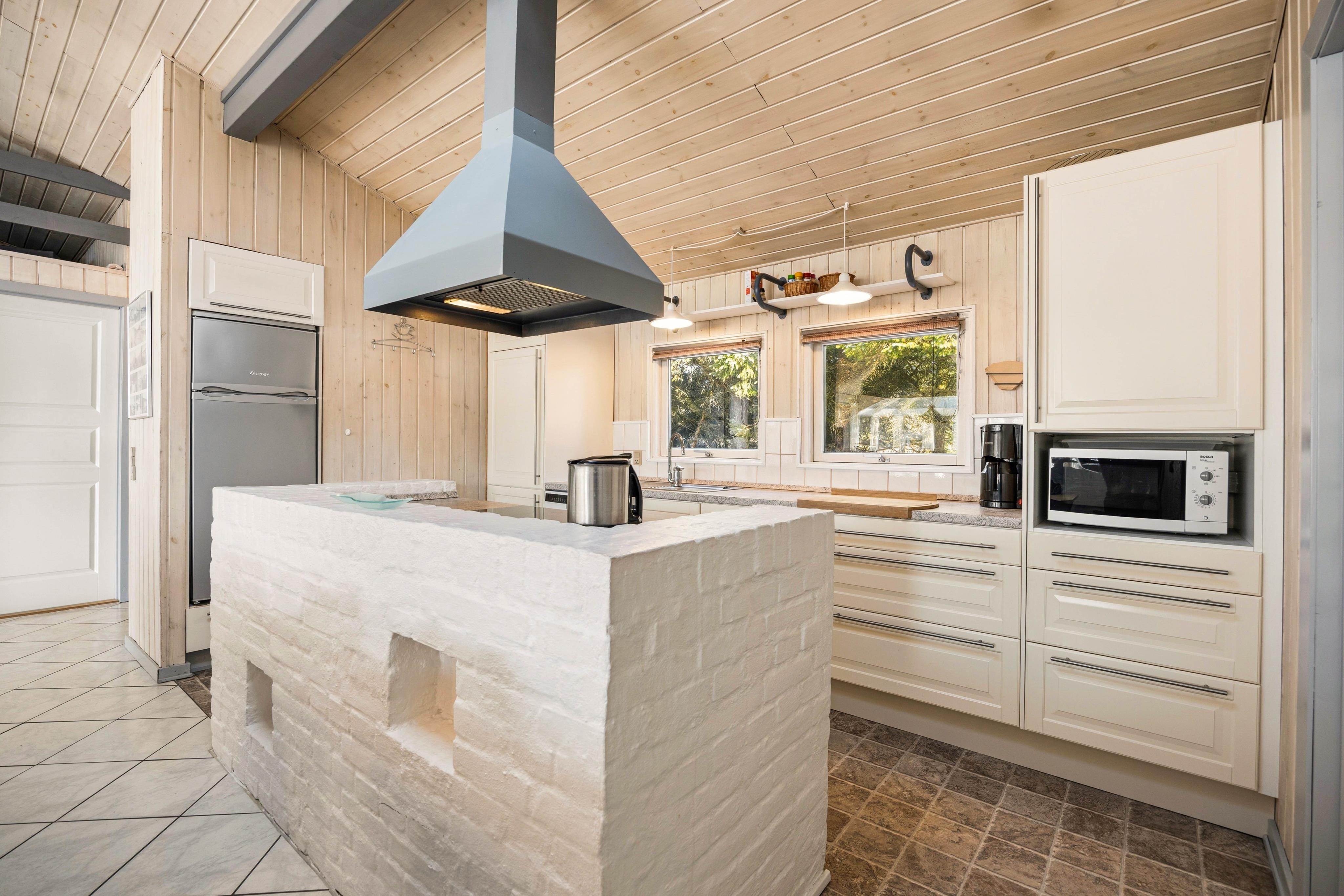 Von der hellen Küche aus, habt ihr nicht nur einen schönen Blick nach draußen, sondern auch das gesamte Geschehen im Wohnbereich im Auge. Die Küche ist mit allem ausgestattet, was ihr zu eurem kulinarischen Vergnügen im Dänemark Urlaub braucht. Gemeinsam gegessen, gemalt oder Spiele gespielt, werden am Esstisch, der Küche und Wohnbereich voneinander trennt.