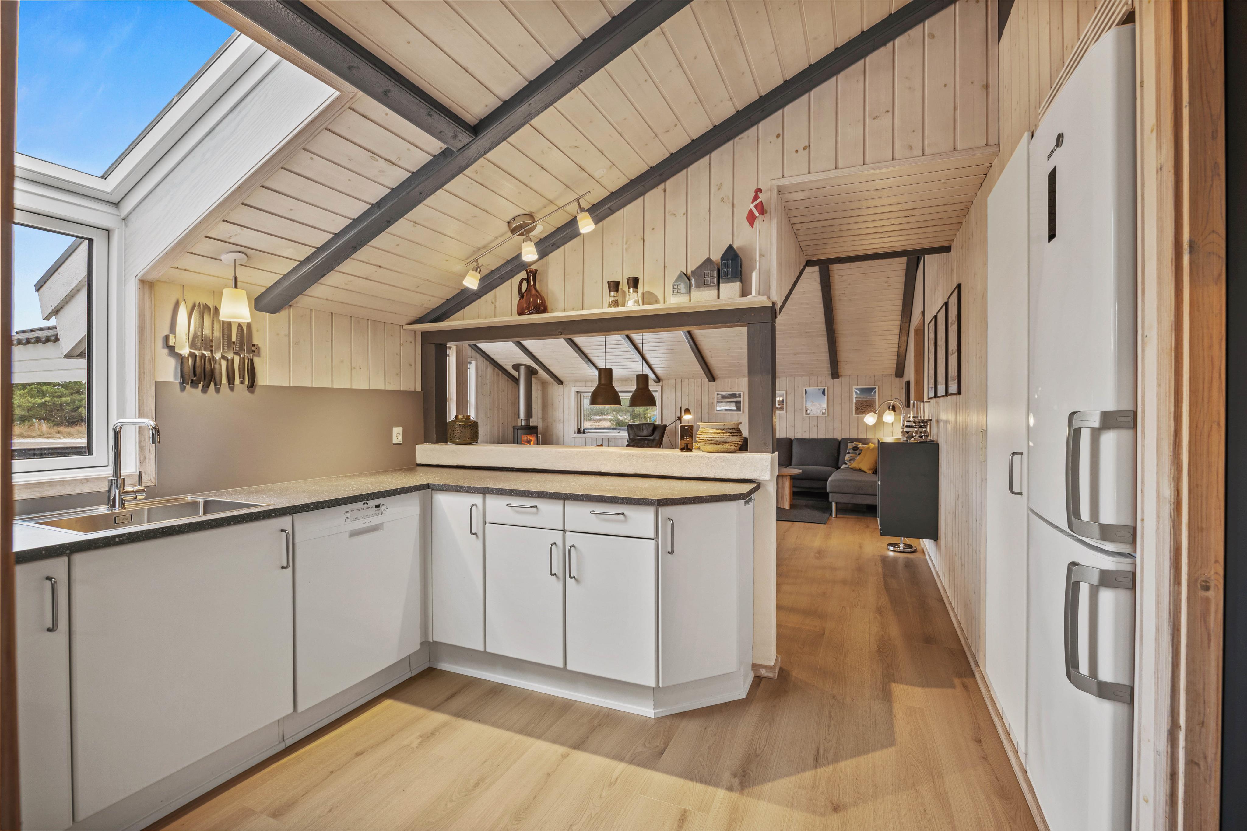 Die Küche ist mit allem ausgestattet, was ihr zu eurem kulinarischen Vergnügen im Dänemark Urlaub braucht. Durch eine Wand mit einer Durchreiche ist die sie vom Wohnbereich etwas abgetrennt.