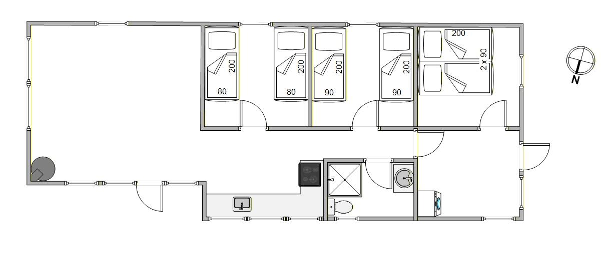 Das Ferienhaus verfügt über 3 Schlafzimmer – eines mit 2x90cm und 2 weitere mit jeweils 2 Einzelbetten. Insgesamt bietet das Ferienhaus Platz für 6 Personen und eignet sich damit sowohl für Familien mit Kindern als auch für Ferien mit Freunden. Das Badezimmer ist schlicht und funktional eingerichtet, und eine Waschmaschine steht euch ebenfalls zur Verfügung, sodass ihr bei Bedarf auch Wäsche waschen könnt.