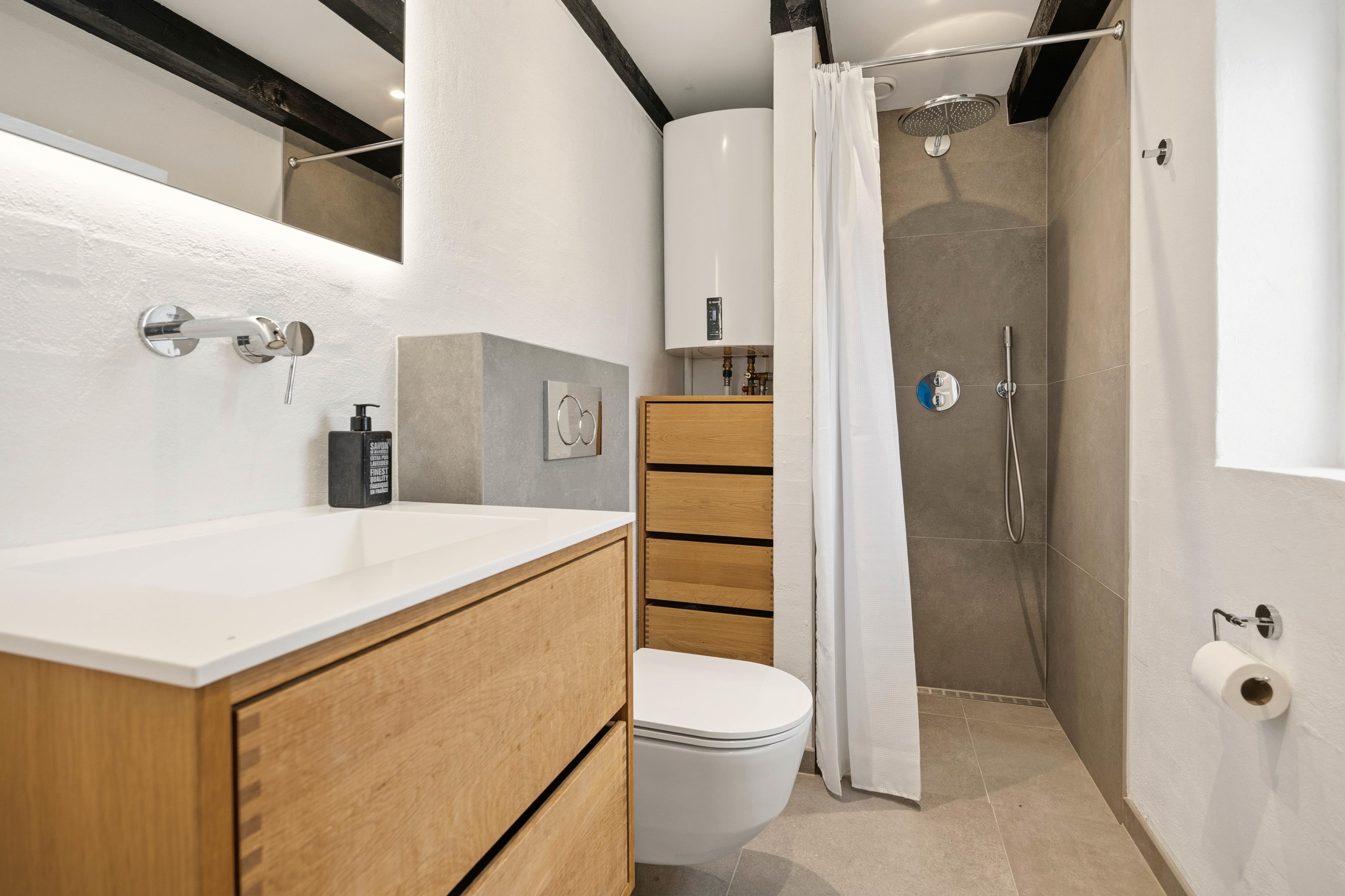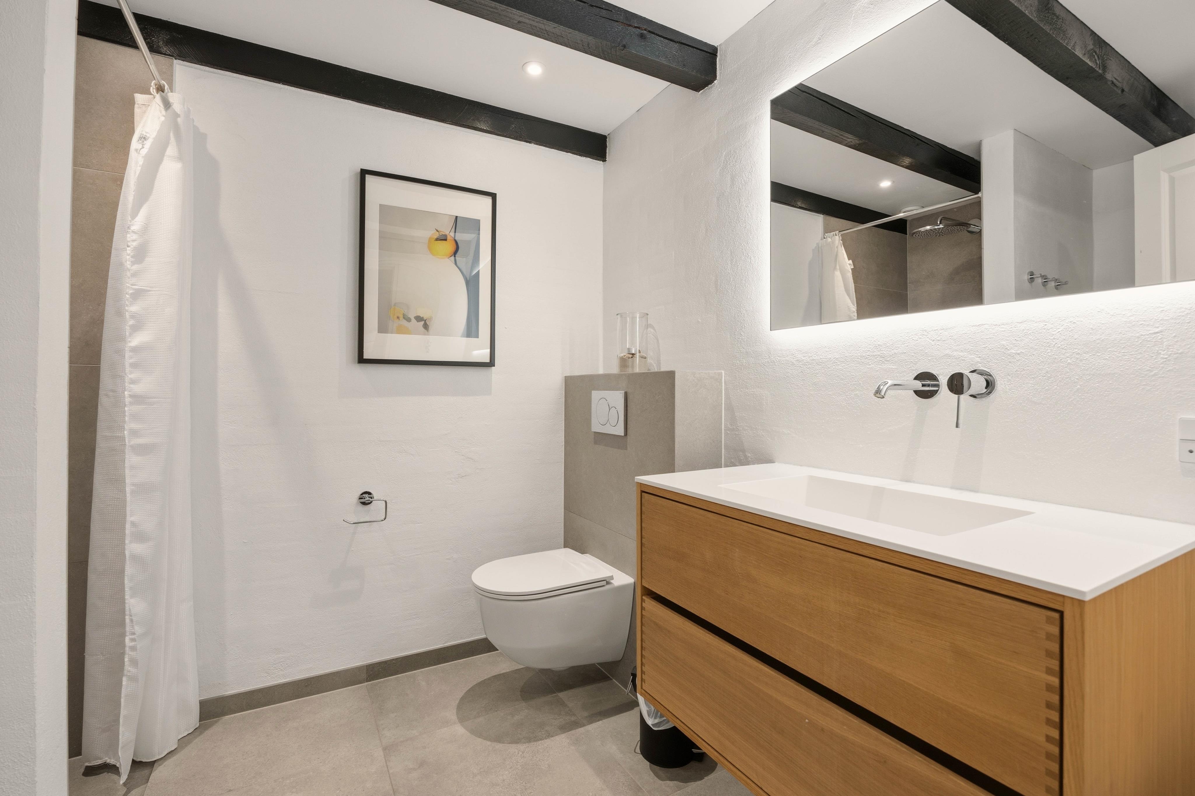 Im 1. Stock befinden sich zwei der insgesamt 3 Schlafzimmer, welche alle mit einem Doppelbett ausgestattet sind (200x180). Ein Schlafzimmer findet ihr im Erdgeschoss mit eigenem Bad. Im Erdgeschoss findet ihr auch ein zweites grösseres Badezimmer, einen großen Wohn- und Essbereich sowie die gut ausgestattete und in 2020 erneuerte Küche.