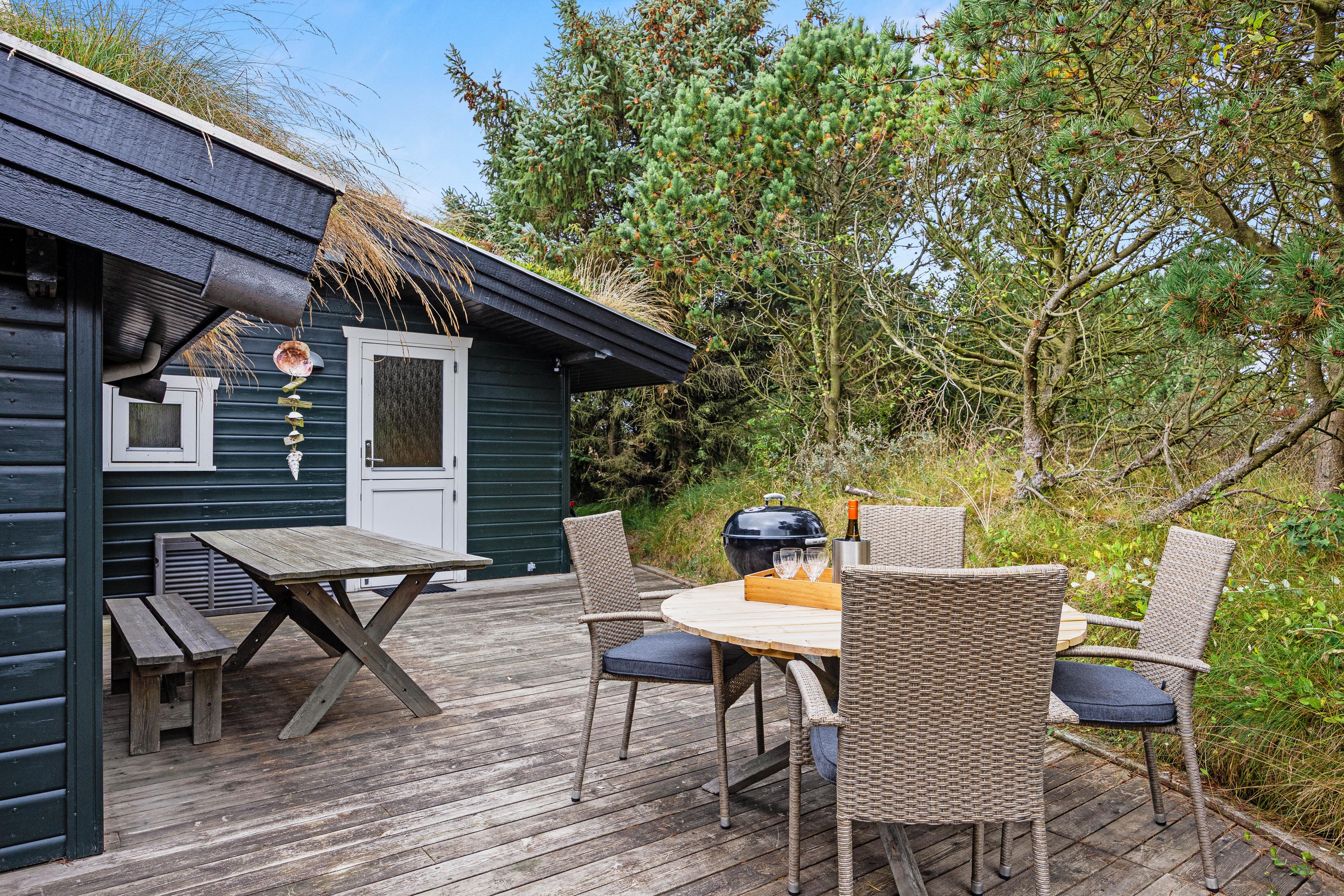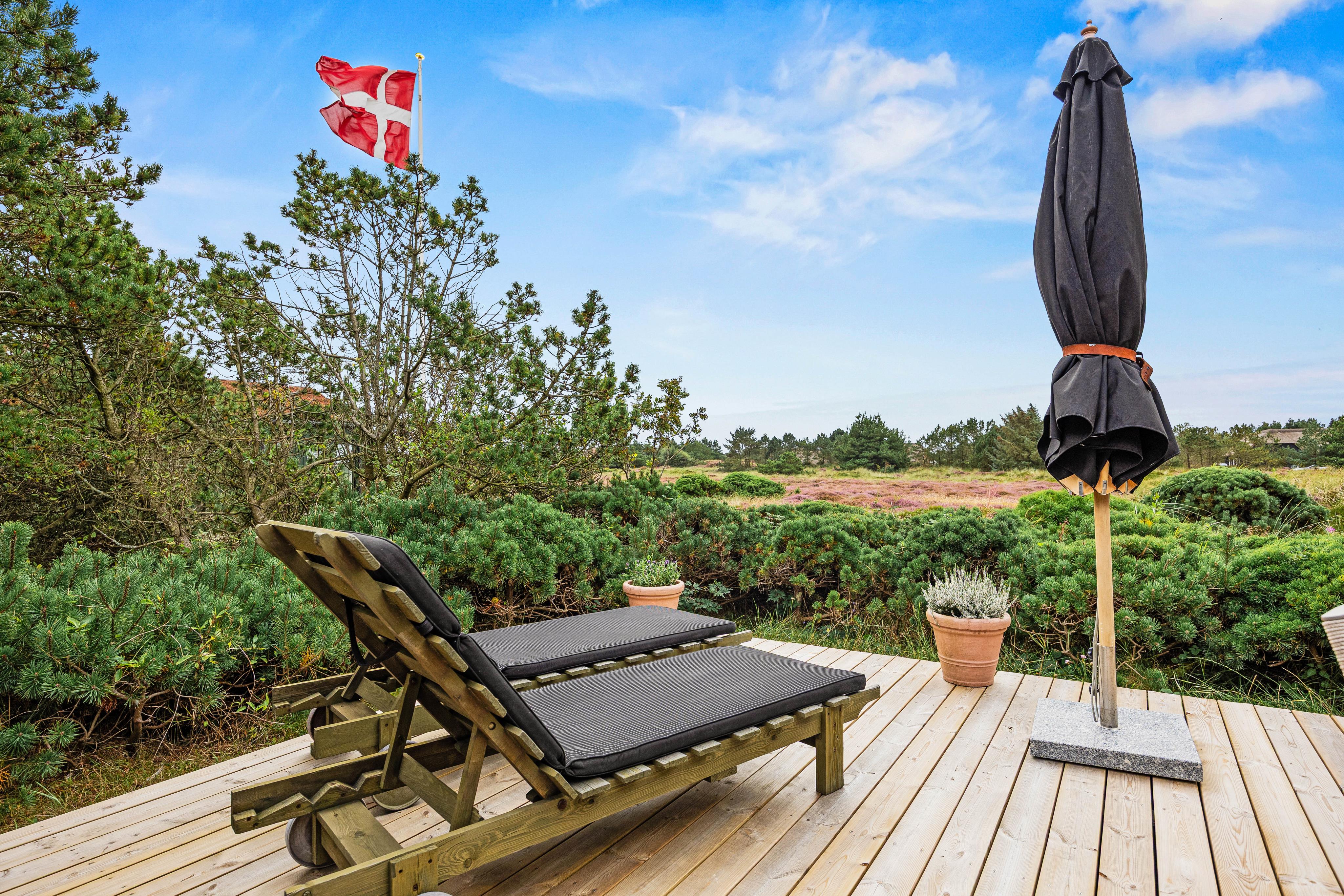 Wenn ihr etwas aus dem Schatten der Bäume und Büsche, welche das Haus und die Terrasse gut schützen, heraustretet, habt ihr einen einzigartigen Blick auf das Wahrzeichen Blåvands. Ganz am Horizont seht ihr den Leuchtturm Blåvands Huk, was gerade in den Abendstunden ein faszinierendes Erlebnis darstellt. Denn dann sendet der Leuchtturm seinen Lichtkegel über die Küste, um wie in früheren Tagen den Seefahrern den Weg um Horns Reff zu weisen.