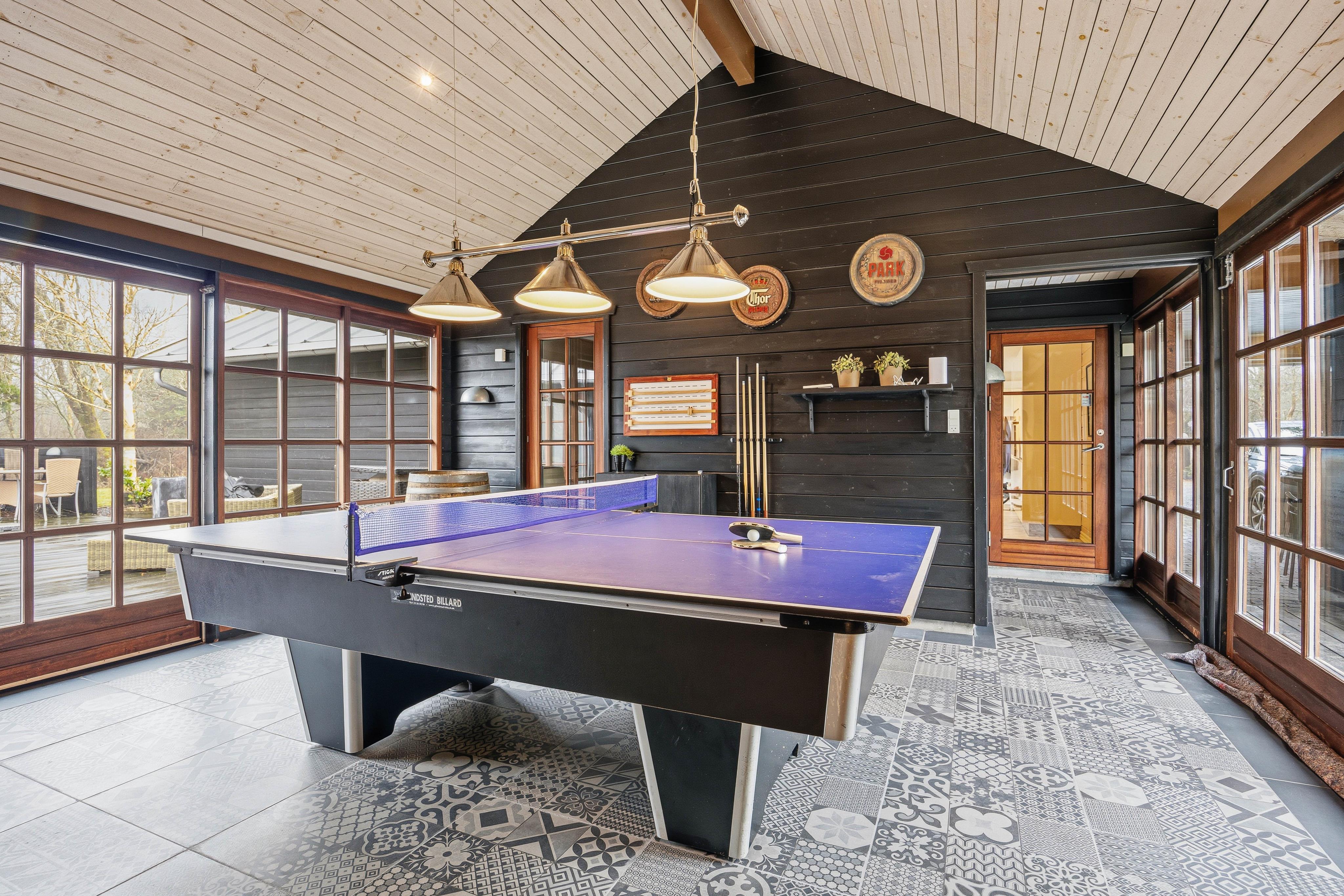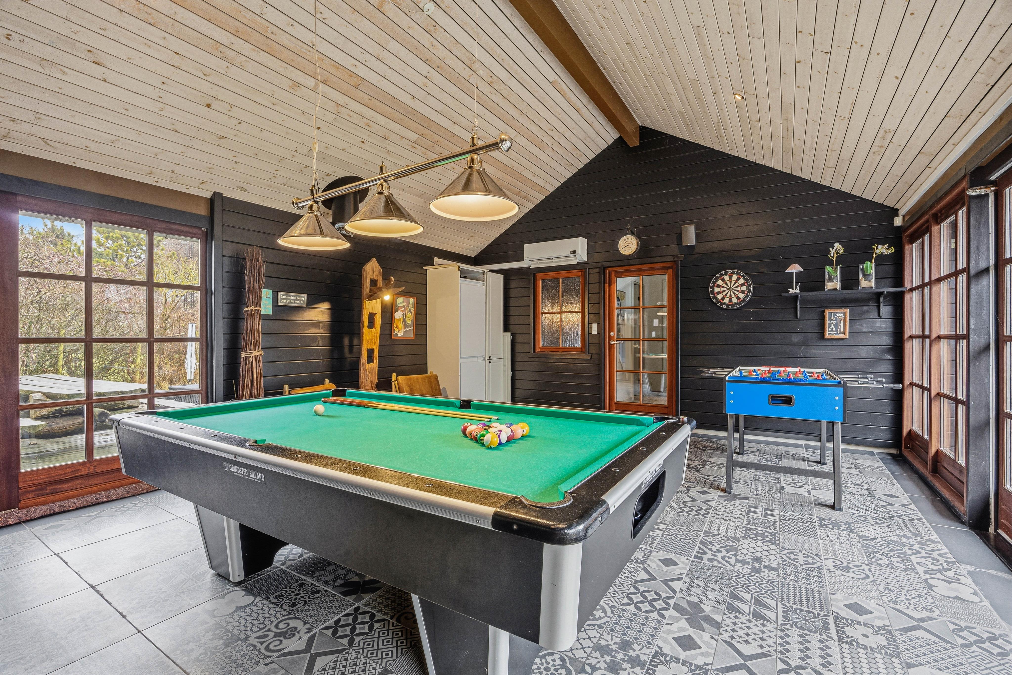 Zwischen Wohnbereich und Pool Haus liegt der Aktivitätsraum. Auf beiden Seiten sind große Fensterschiebetüren, die ihr weit öffnen könnt. Bei einer Partie Poolbillard, Dart, oder Tischfußball weht euch die herrlich, frische Luft um die Nase. Anschließend könnt ihr von hier aus direkt in den Außenwhirlpool hüpfen, und im warmen, sprudelnden Wasser unter freiem Himmel die Seele baumeln lassen.
