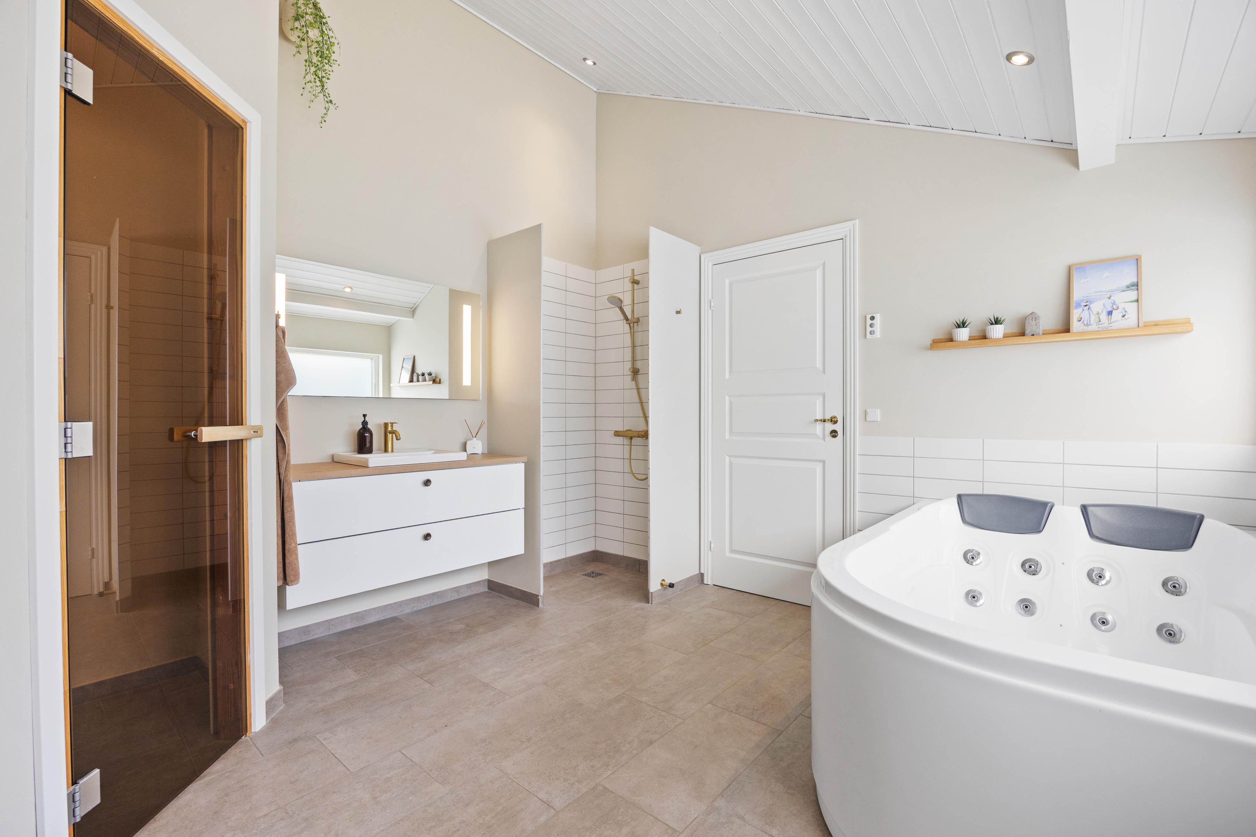 Das Haus verfügt über drei schöne Badezimmer, von denen eines Teil des brandneuen Poolbereichs ist. Im größten Badezimmer könnt ihr euch mit einem 2-Personen-Spa und einer Sauna verwöhnen lassen – purer Luxus nach einem Tag am Strand.