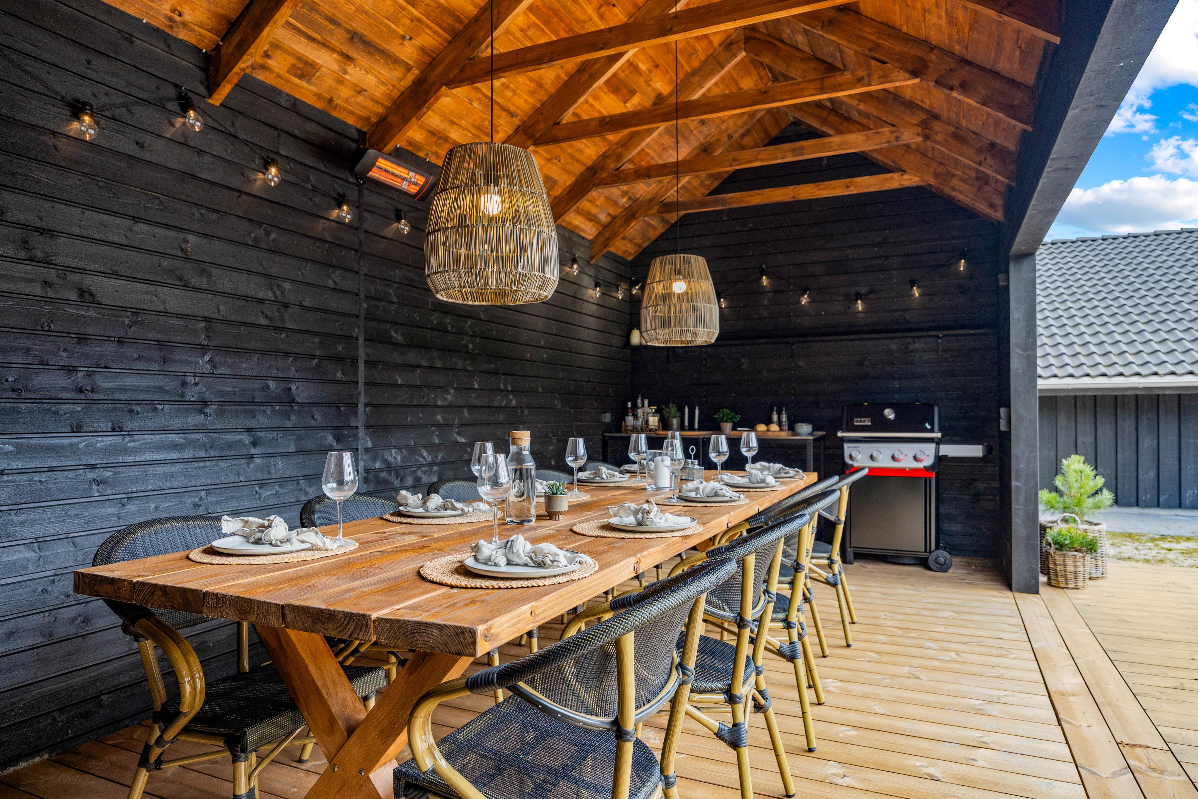 Die überdachte Terrasse von 23 m² mit Terrassenheizung ermöglicht es Ihnen, lange Abende unter freiem Himmel zu genießen – auch wenn der Tau fällt. Hier gibt es auch eine praktische Außenküche und einen Gasgrill, mit dem Sie mühelos köstliche Grillabende zubereiten können. Wenn die Sonne scheint, laden die Liegestühle zum Entspannen ein, und die Außendusche verleiht Ihrem Urlaub im Ferienhaus das richtige Luxusgefühl.