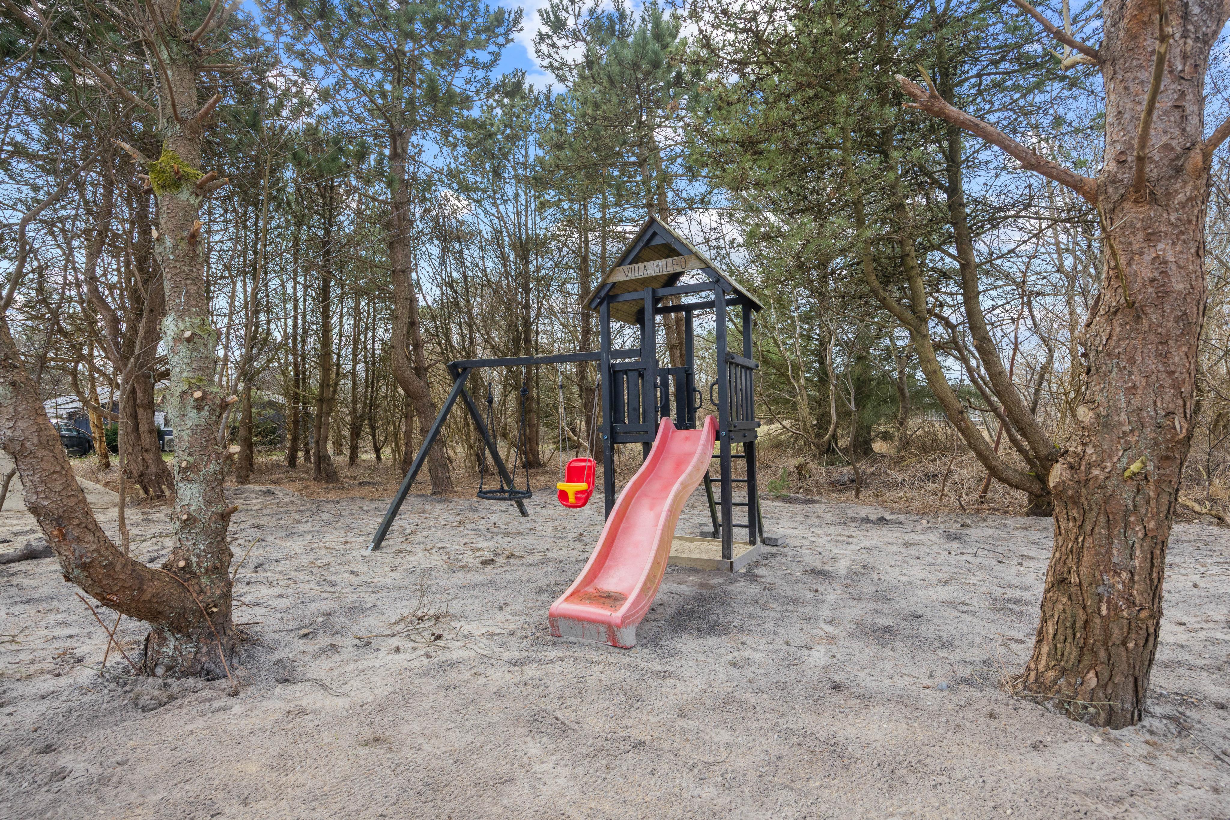 Das große, unverbauten Naturgrundstück von 2379 m² mit vielen Kiefern bietet viel Platz zum Spielen und Toben: Fußballtor, Sandkasten, Feuerstelle, Kletterturm, Rutsche und Schaukeln – ein Paradies für die Kleinsten der Familie.