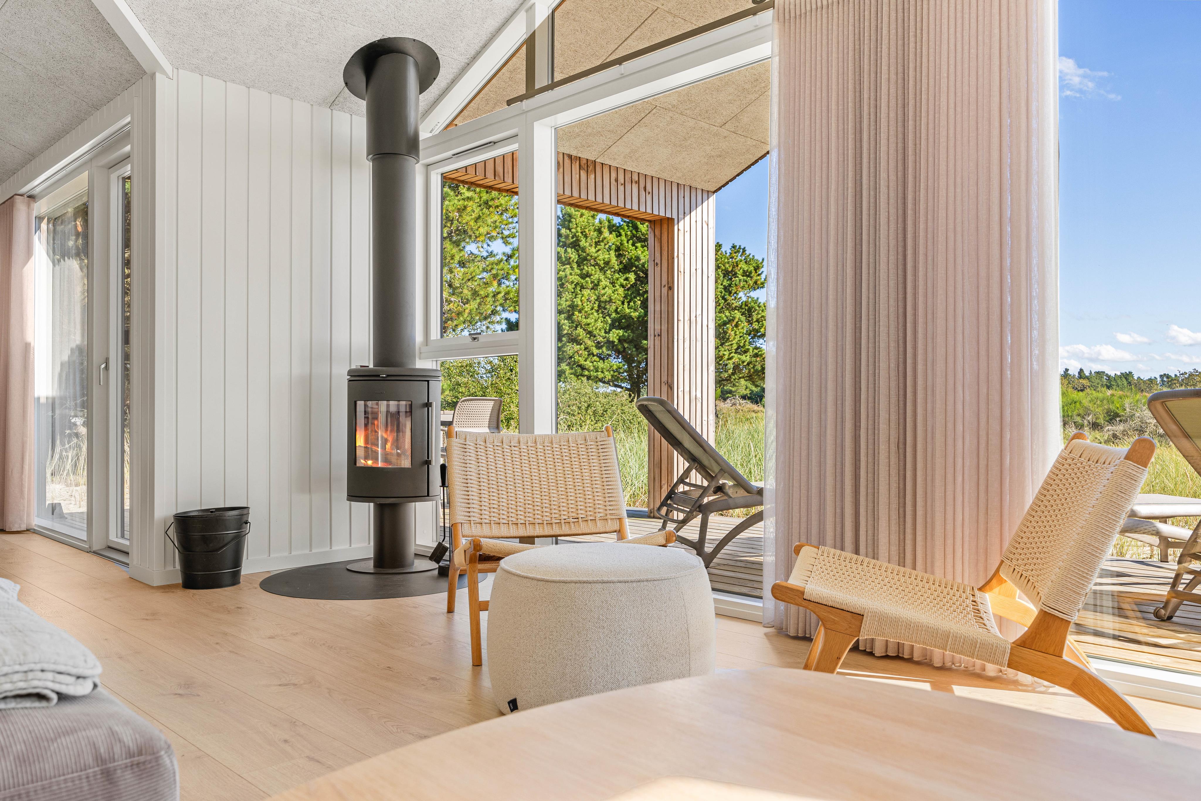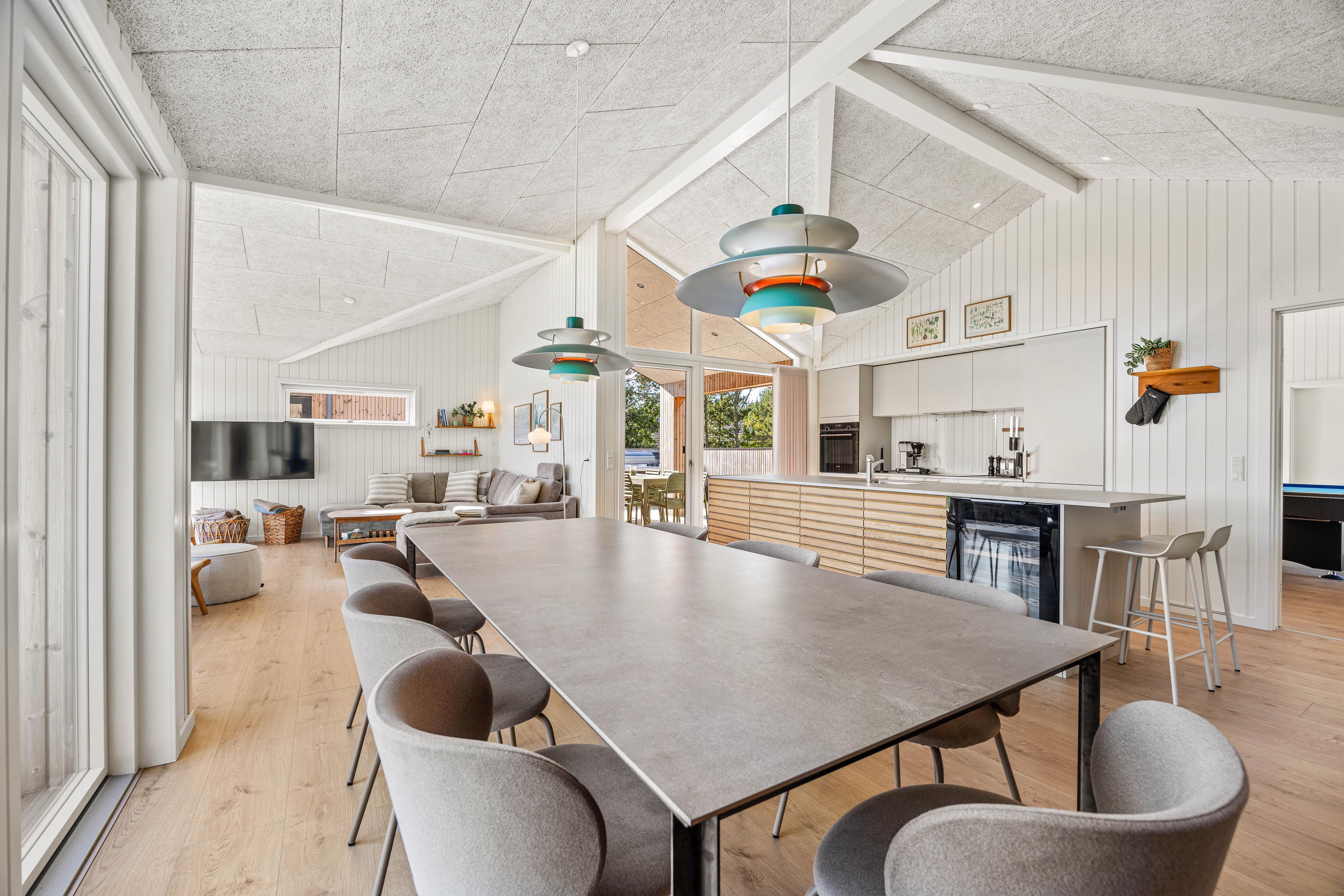 Das Ferienhaus im Gl. MæIkevej 70 ist ideal für einen Urlaub mit zwei Familien oder Freunden. Die durchdachte Aufteilung/Grundriss erlaubt genügend Rückzugsmöglichkeiten und Privatsphäre, wenn es gewünscht ist. Das Haus ist im skandinavischen Stil, mit modernen Designelementen eingerichtet und überrascht mit vielen, schönen Details. Der Wohnbereich, mit moderner Küche und Esstisch wird durch die großen Fensterfronten in ein traumhaftes Licht getaucht. Helligkeit, hohe Holzdecken und der Kaminofen, sorgen für das perfekte Hygge Ambiente. Die neue, moderne Küche hat alles, was ihr braucht, und ist durch einen großen Küchenblock vom Wohnbereich abgetrennt. Auf dem Sofa finden alle Platz zum Entspannen, für einen Filmeabend oder um den schönen Ausblick in die Natur zu genießen. Dazu ein perfekt temperiertes Glas Wein aus dem Weinkühlschrank und die Erholung kann beginnen.
