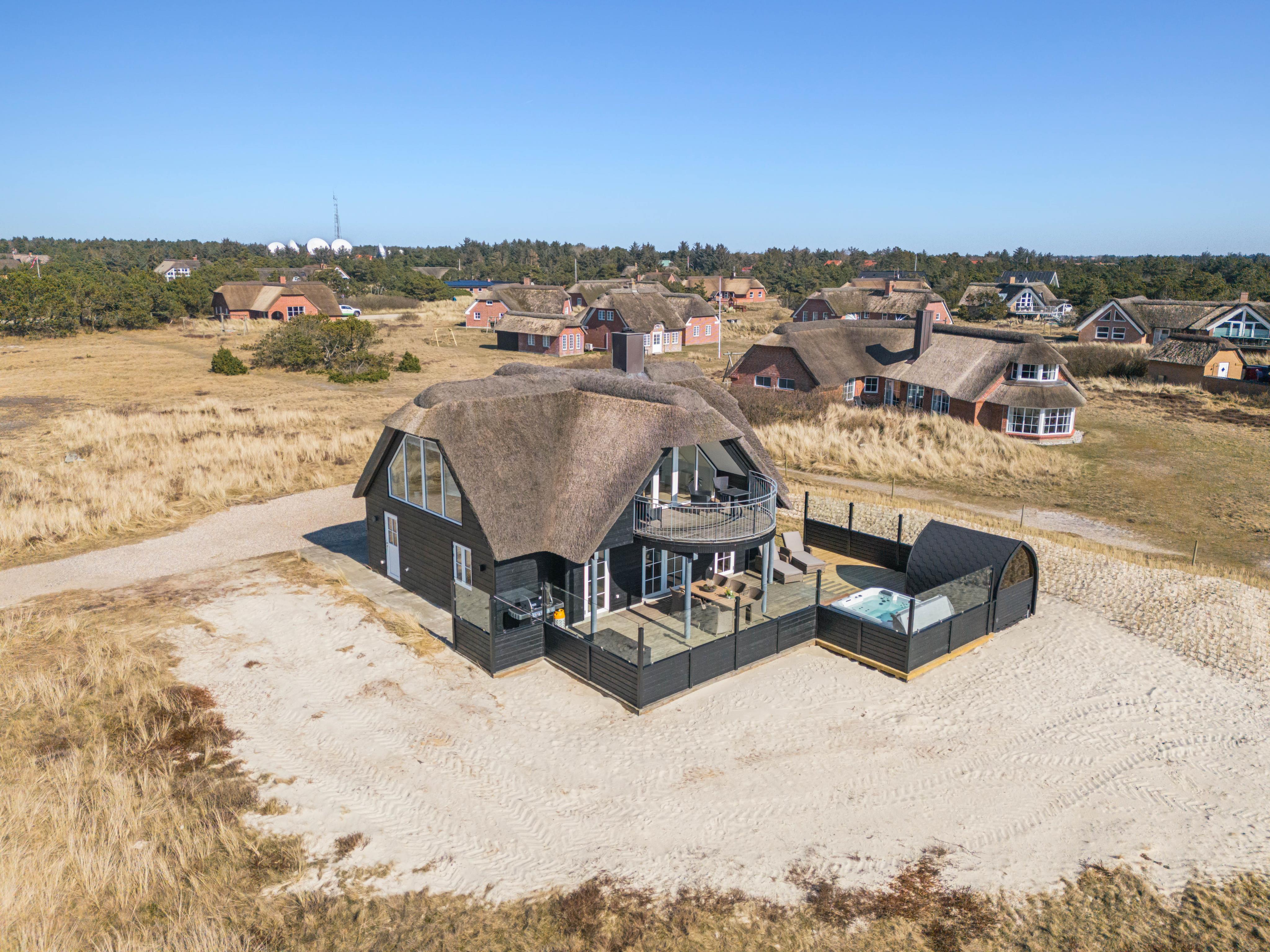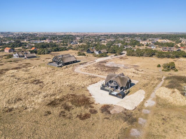Entspannt euch in diesem schönen, klassischen Holzhaus mit Reetdach auf einem großen, offenen Grundstück in der faszinierenden Natur Westjütlands mit 54 m2 Terrassenfläche und 18 m2 überdachter Terrasse direkt am Meer und Saumpfaden und in der Nähe des Leuchtturms von Blåvand.