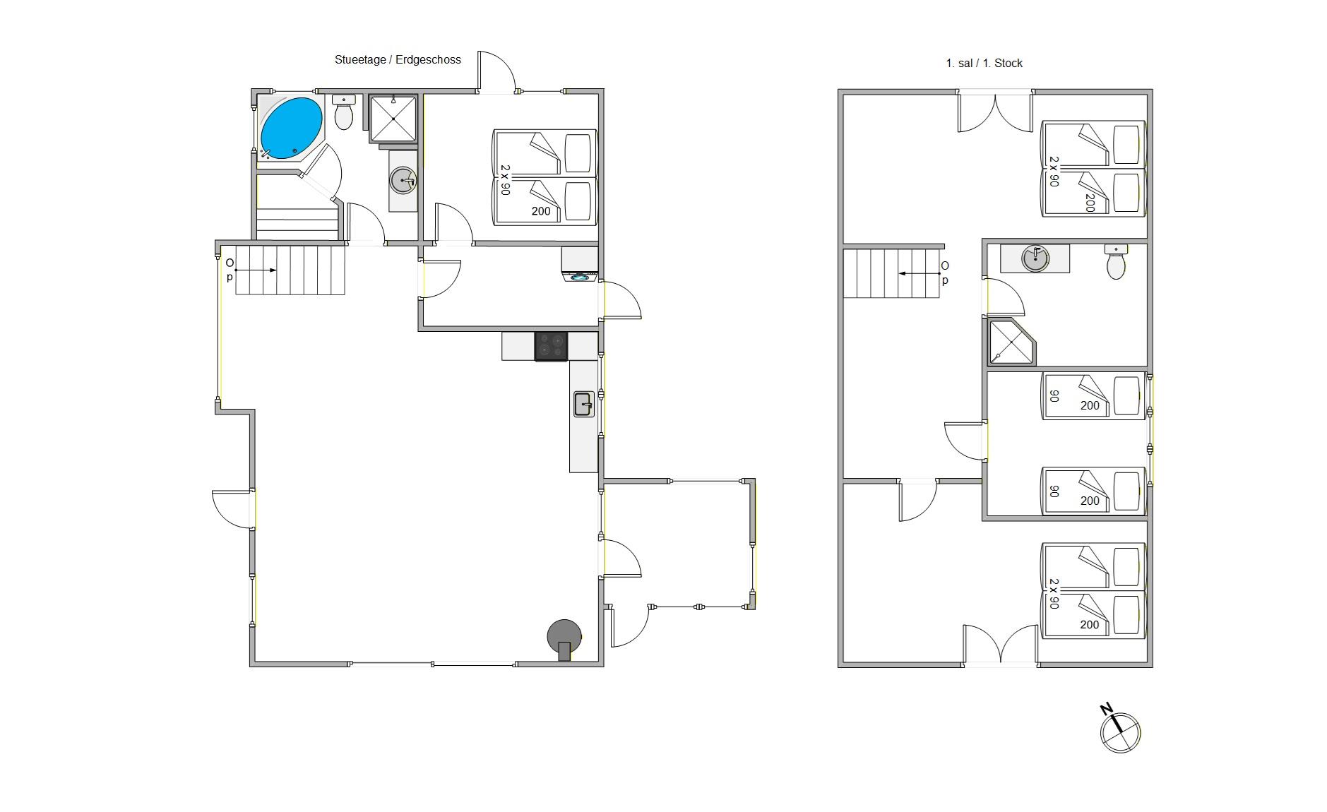 Das Ferienhaus erstreckt sich über 2 Etagen und bietet euch eine durchdachte Raumaufteilung mit viel Platz für die ganze Familie oder eine befreundete Reisegruppe. 3 der 4 Schlafzimmer befinden sich im Obergeschoss, ebenso eines der beiden Badezimmer. Das vierte Schlafzimmer und das zweite Bad liegen im Erdgeschoss. Die Schlafplätze verteilen sich auf 3 Doppelbetten und 2 Einzelbetten. Alle Räume sind hell eingerichtet und schaffen eine angenehme Umgebung zum Entspannen und Ausschlafen.