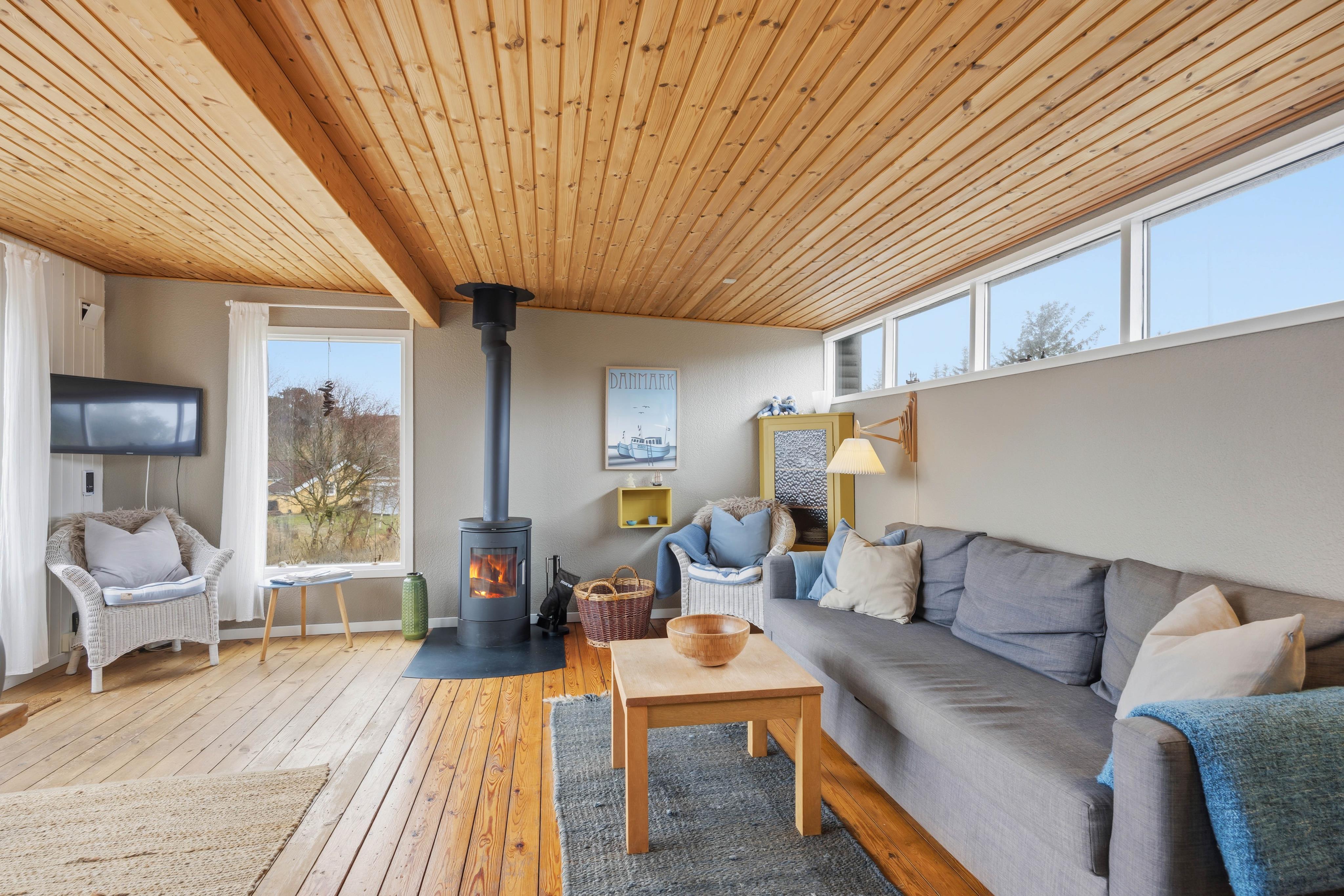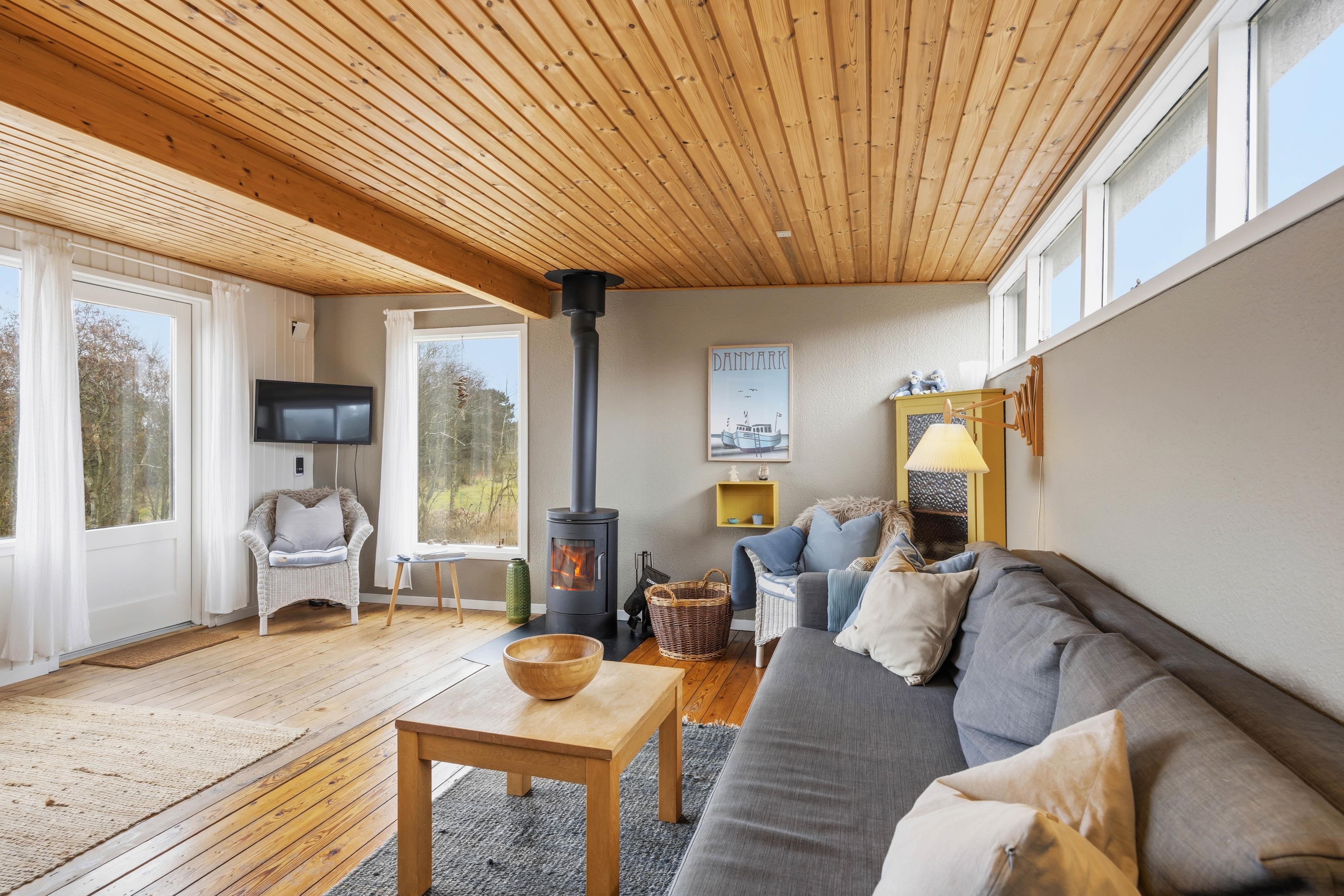 Schon der kleine Treppenaufgang zum Ferienhaus im Store Klit 51 vermittelt das Gefühl, in eine kleine Sommeroase einzutreten. Drinnen erwartet dich ein stimmiger Mix aus Komfort und Funktion. Die offene, kleine, aber feine Küche ist praktisch ausgestattet und bietet dir einen schönen Blick in die Dünen. Der Kaminofen sorgt an kühleren Abenden für wohlige Wärme, während die Wärmepumpe schnell für ein angenehmes Raumklima sorgt. Das lichtdurchflutete und liebevoll eingerichtete Wohnzimmer lädt ebenfalls zu Hygge ein. Mit Chromecast kannst du zudem ganz einfach deine Lieblingsserien oder Musik streamen und den Tag gemütlich ausklingen lassen.