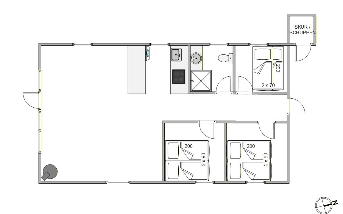 Im Wohnzimmer sorgt der Kaminofen an kühlen Abenden für das gewisse Extra an Ferienstimmung. Dank einer modernen Luft-Luft-Wärmepumpe ist die Temperatur im Ferienhaus immer angenehm und euren Bedürfnissen angepasst. Die Küche ist vollständig ausgestattet und bietet alles, was ihr für die Zubereitung leckerer, hausgemachter Mahlzeiten benötigt – einschließlich Geschirrspüler. Das Badezimmer verfügt über eine Fußbodenheizung, und die drei Schlafzimmer verteilen sich auf zwei Zimmer mit Doppelbetten und ein Zimmer mit Etagenbett, das besonders bei Kindern beliebt ist.
