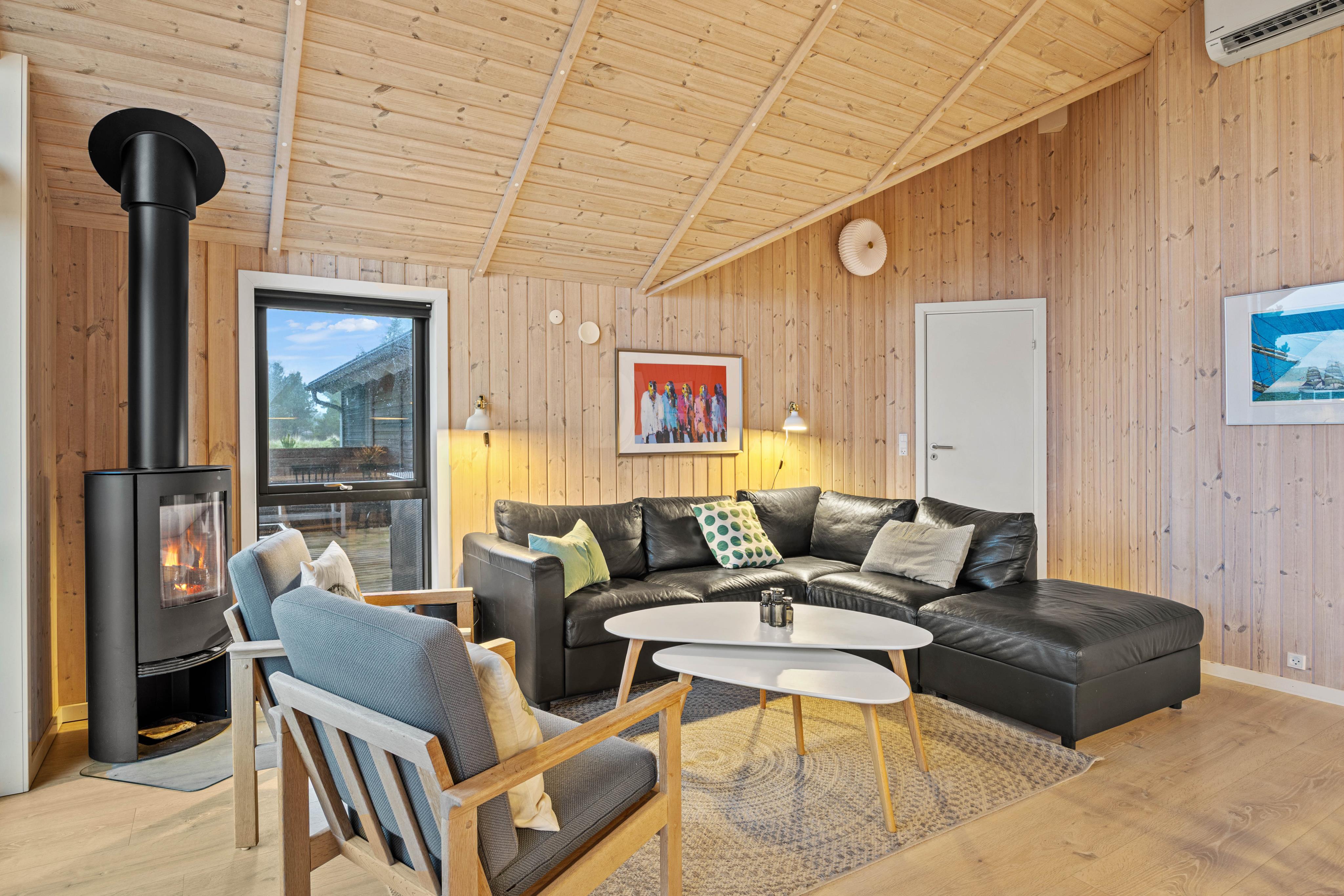 Der einladende Innenbereich im Ferienhaus in Vestermarken 10 verbindet skandinavische Wohnlichkeit mit einer Vielzahl an Annehmlichkeiten. Der Kaminofen bringt eine warme Atmosphäre in den Wohnraum, während die Wärmepumpe und die Fußbodenheizung im Bad für ein angenehmes Raumklima sorgen. Die offene Küche, ausgestattet mit Spülmaschine, bietet euch die Möglichkeit, gemeinsame Mahlzeiten bequem zuzubereiten.