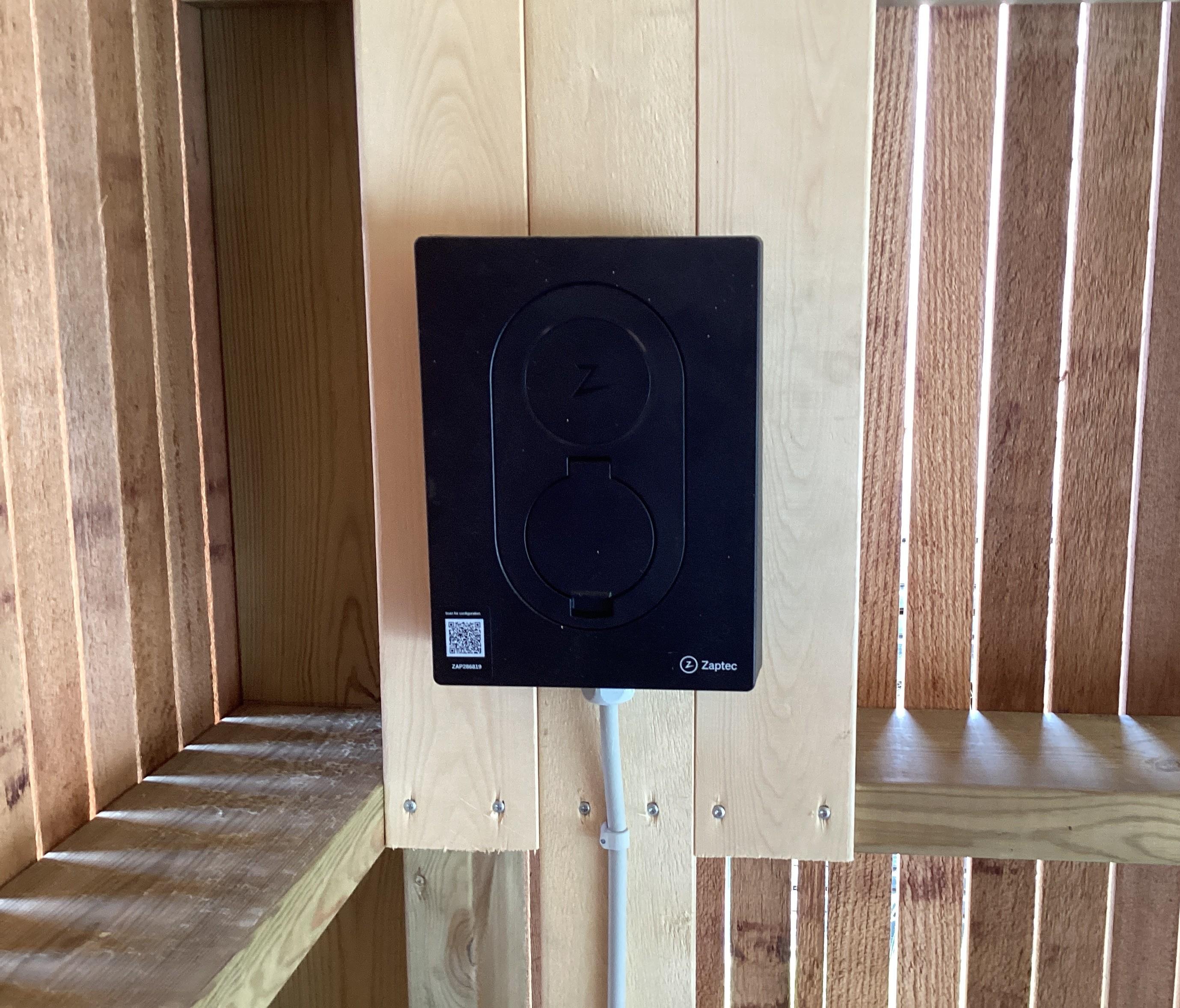 Es gibt eine Ladestation für Elektroautos, Zaptec, Type 2 - Bitte bringt euer eigenes Kabel/Adapter mit.