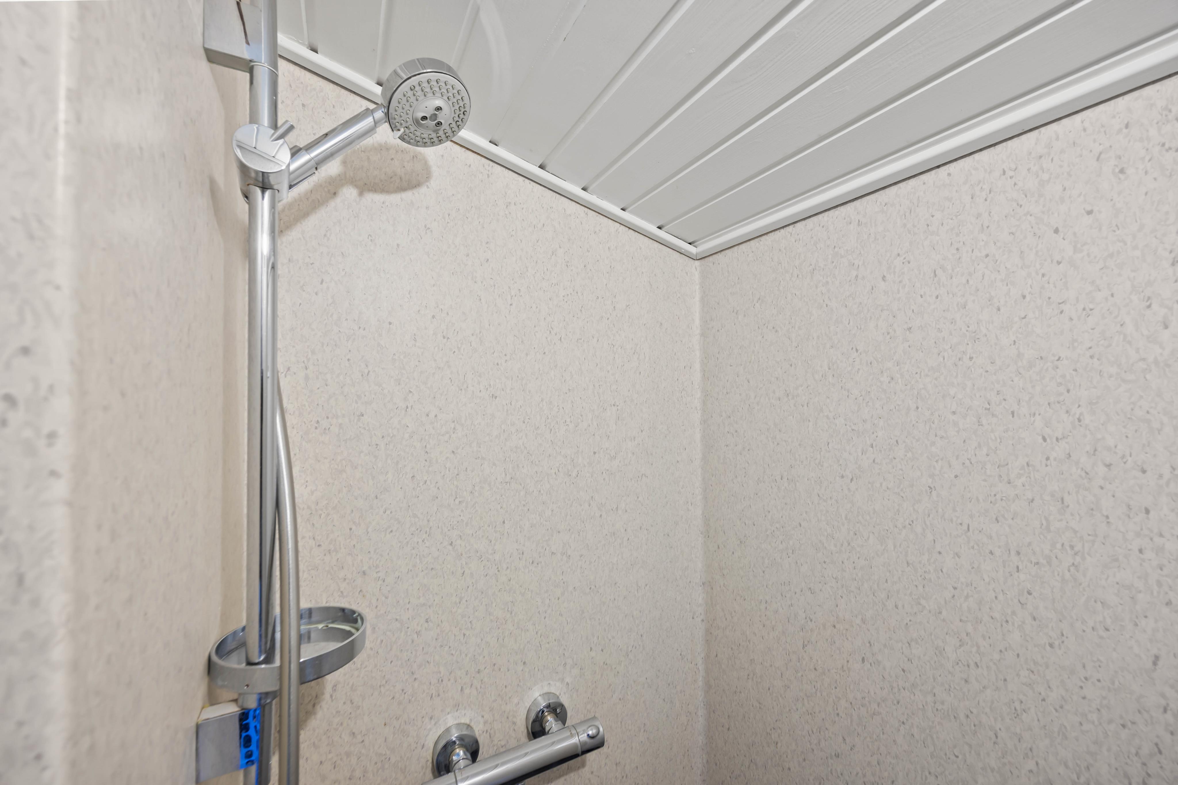 Der Laminatboden verleiht dem Haus eine warme und einladende Atmosphäre. Es gibt ein sehr kleines Badezimmer, das mit einer kompakten Duschkabine (niedrige Höhe) und einem Tageslichtfenster ausgestattet ist. Es handelt sich hier um eine einfache Badlösung.