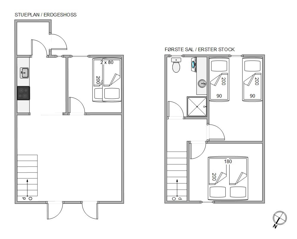In der oberen Etage angekommen, findet ihr zwei weitere Schlafzimmer, eins mit Doppelbett und das andere mit zwei Einzelbetten. Die Schlafzimmer sind beide mit lichtdurchfluteten Velux Fenstern ausgestattet und sehr gepflegt.Außerdem gibt es oben auch das Badezimmer, welches über Duschkabine und Waschmaschine verfügt.