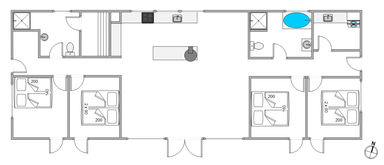 Das moderne Holzhaus verfügt über insgesamt 4 Schlafzimmer mit 2 bequemen Doppelbetten 180x200 cm und 140x200cm und 4 Einzelbetten 80x200cm. Das Ferienhaus verteilt sich auf 142m2, wurde 2003 erbaut und hat Platz für 8 Personen.