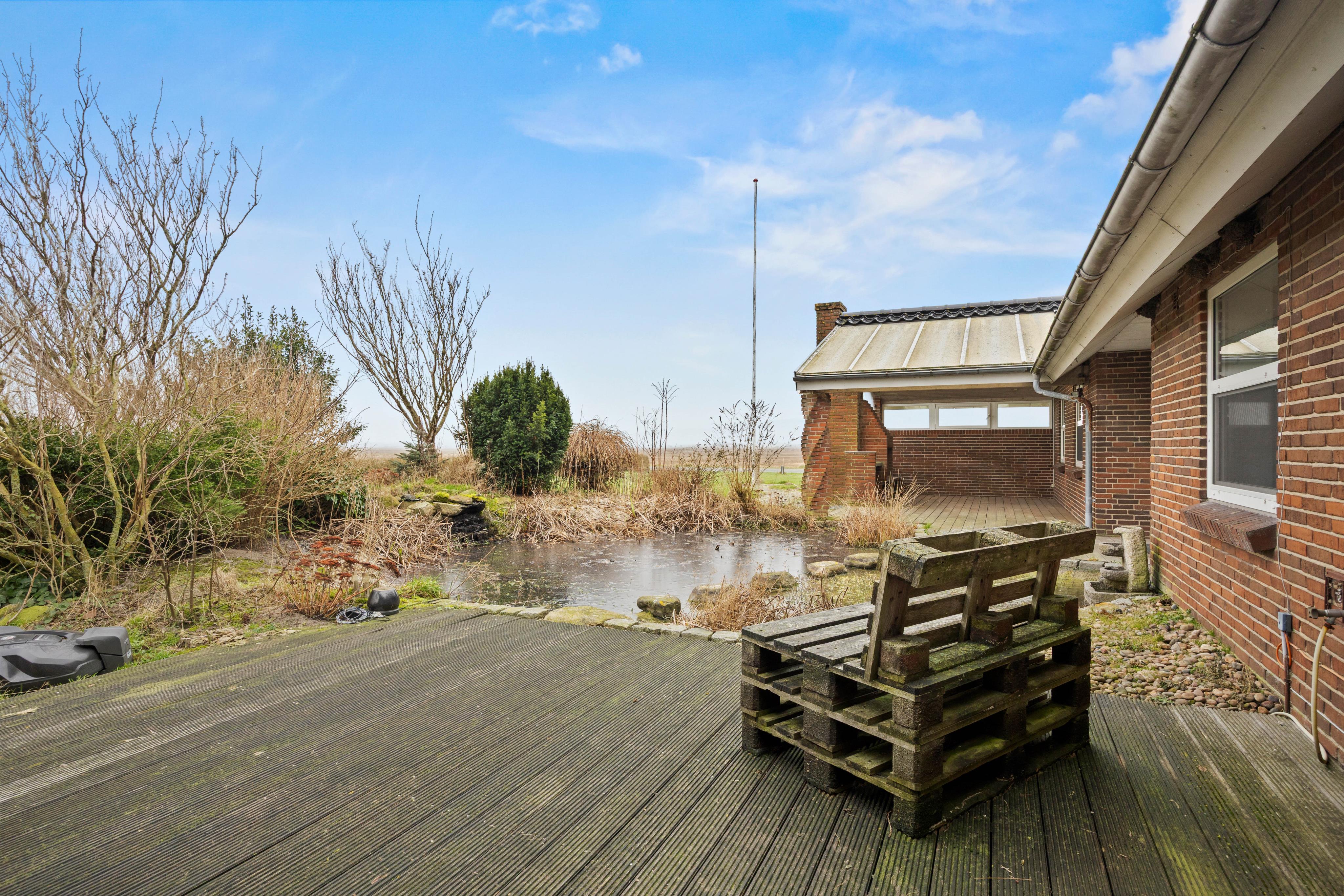 Auf dem 2.000 m² großen Grundstück gibt es viel Platz für Outdoor-Aktivitäten, Spiel und Erholung. Die offene sowie überdachte Terrasse liegt idyllisch an einem kleinen Gartenteich, der zur ruhigen und gemütlichen Atmosphäre beiträgt. Die Terrasse eignet sich hervorragend für Grillabende, und die Gartenmöbel bieten den perfekten Rahmen, um Sonne und Ruhe zu genießen.
