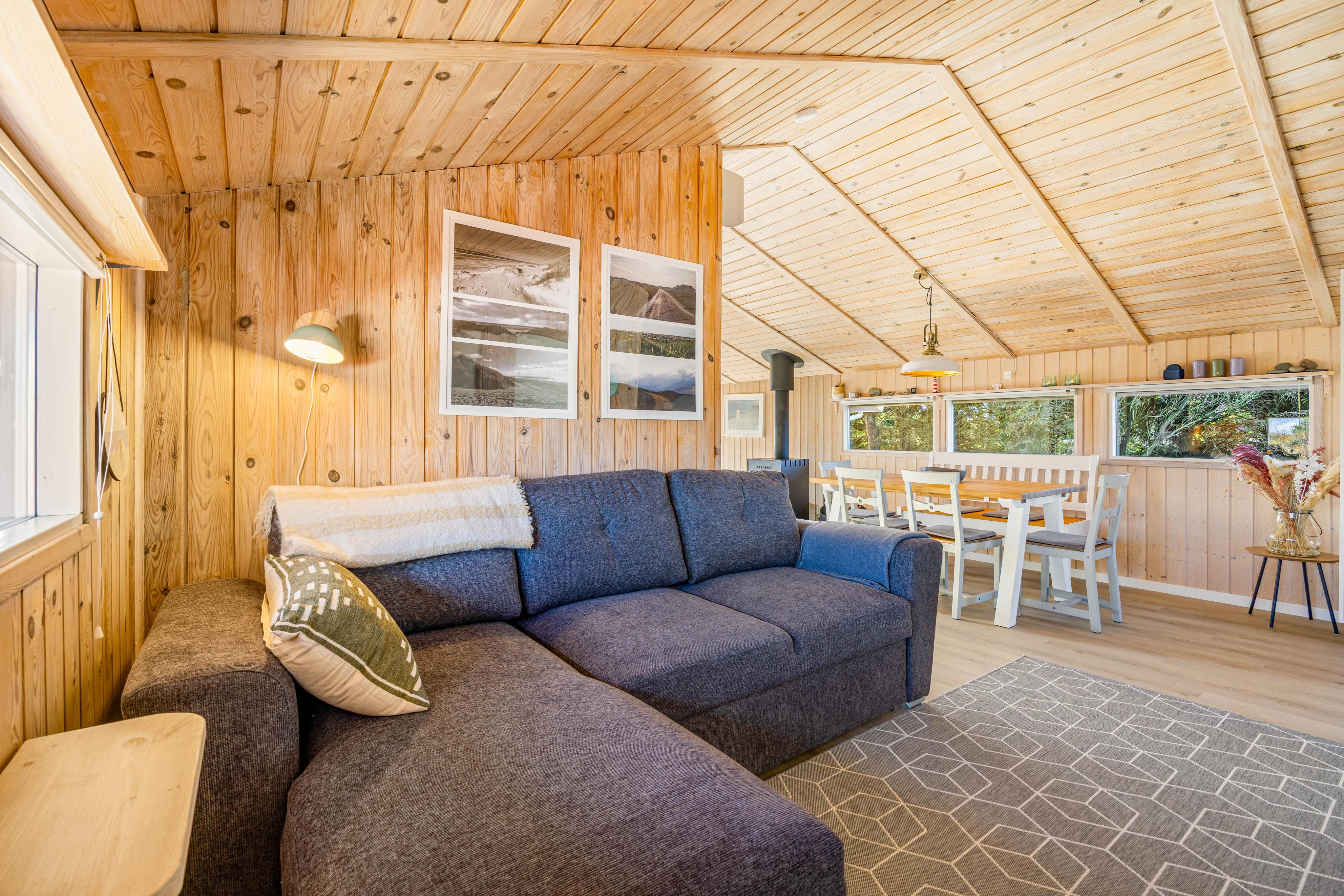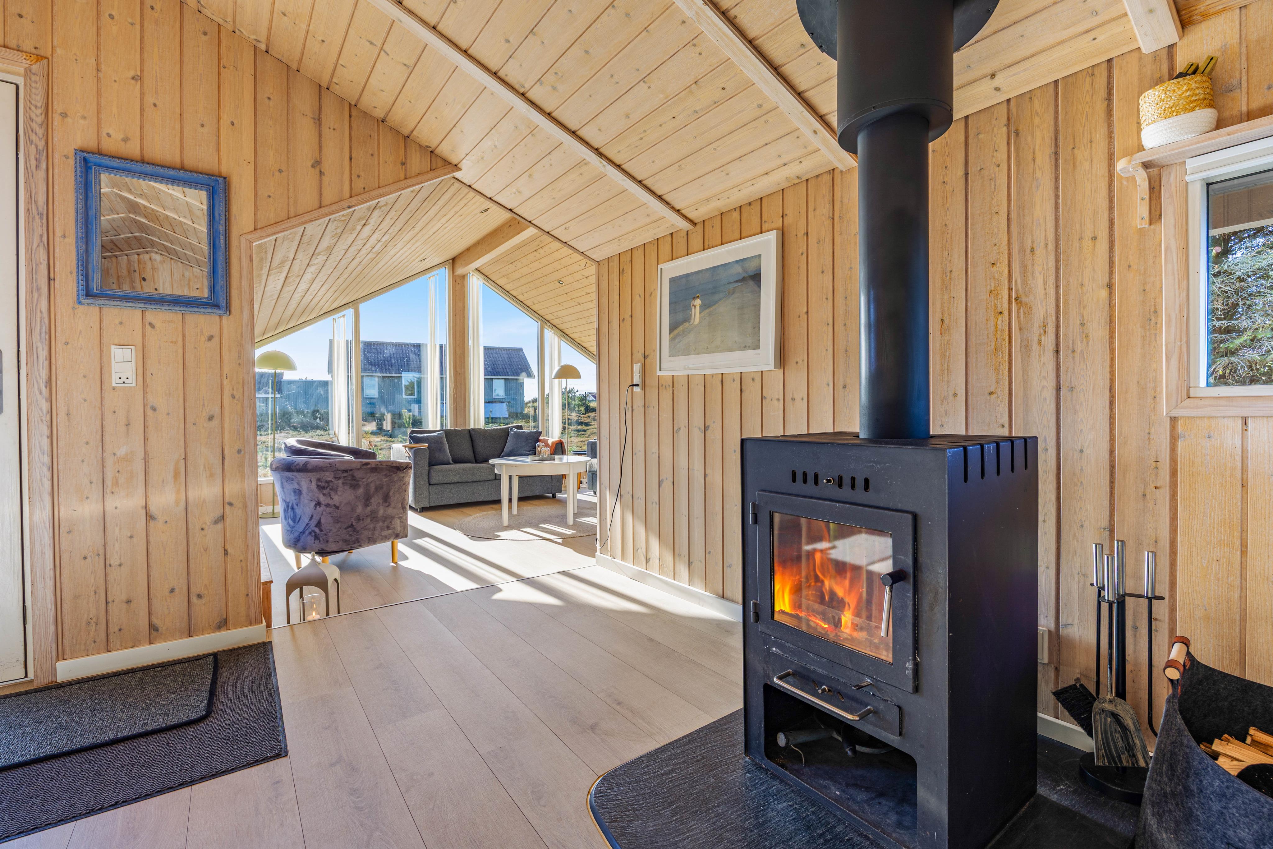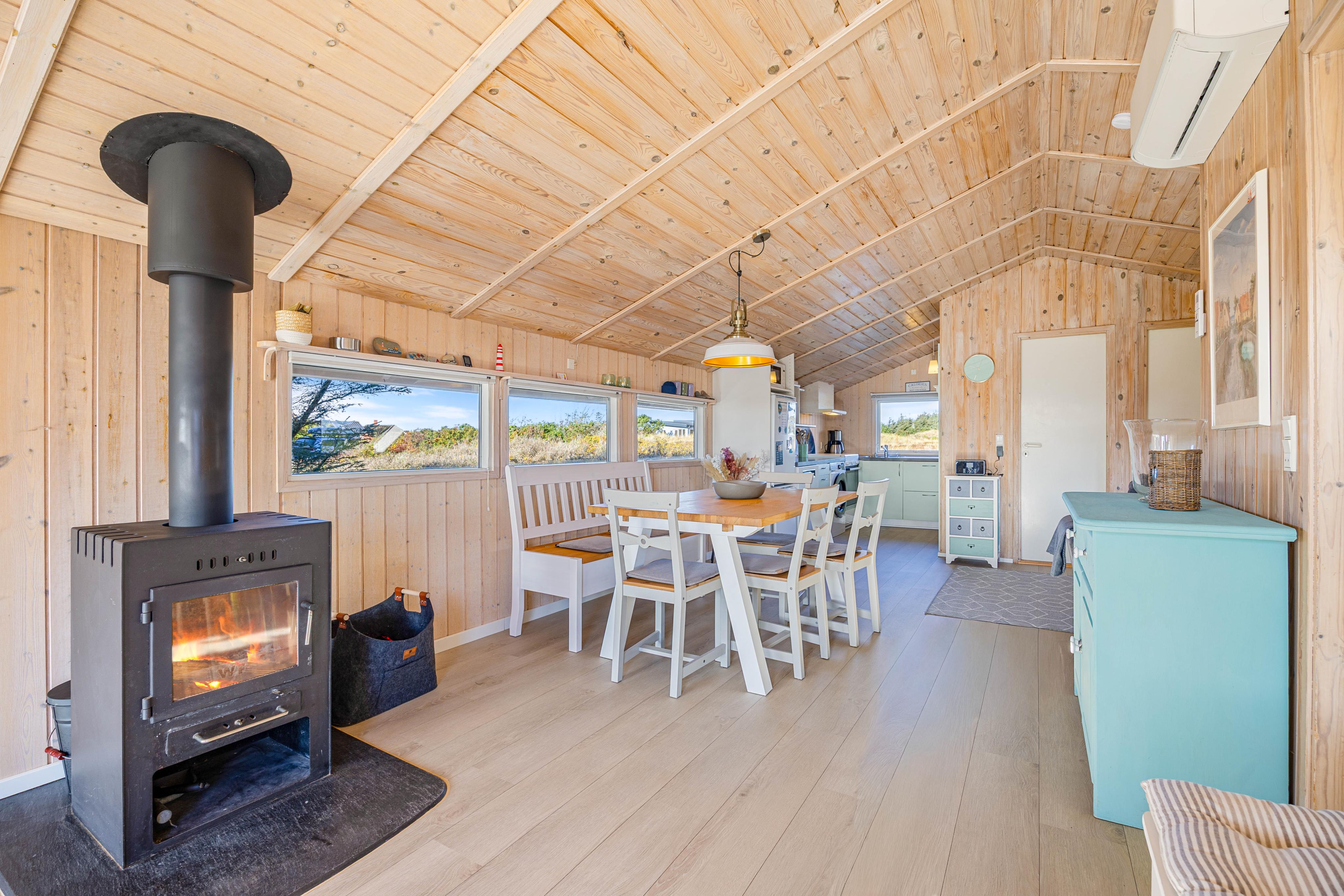 Das charmante Ferienhaus bietet euch eine typische skandinavische Einrichtung mit viel Ferienhaus-Charme. Im Wohnzimmer sorgt ein Kaminofen für wohlige Wärme und eine hyggelige Atmosphäre, gerade an kühleren Abenden. Zusätzlich unterstützt eine Wärmepumpe das Raumklima.