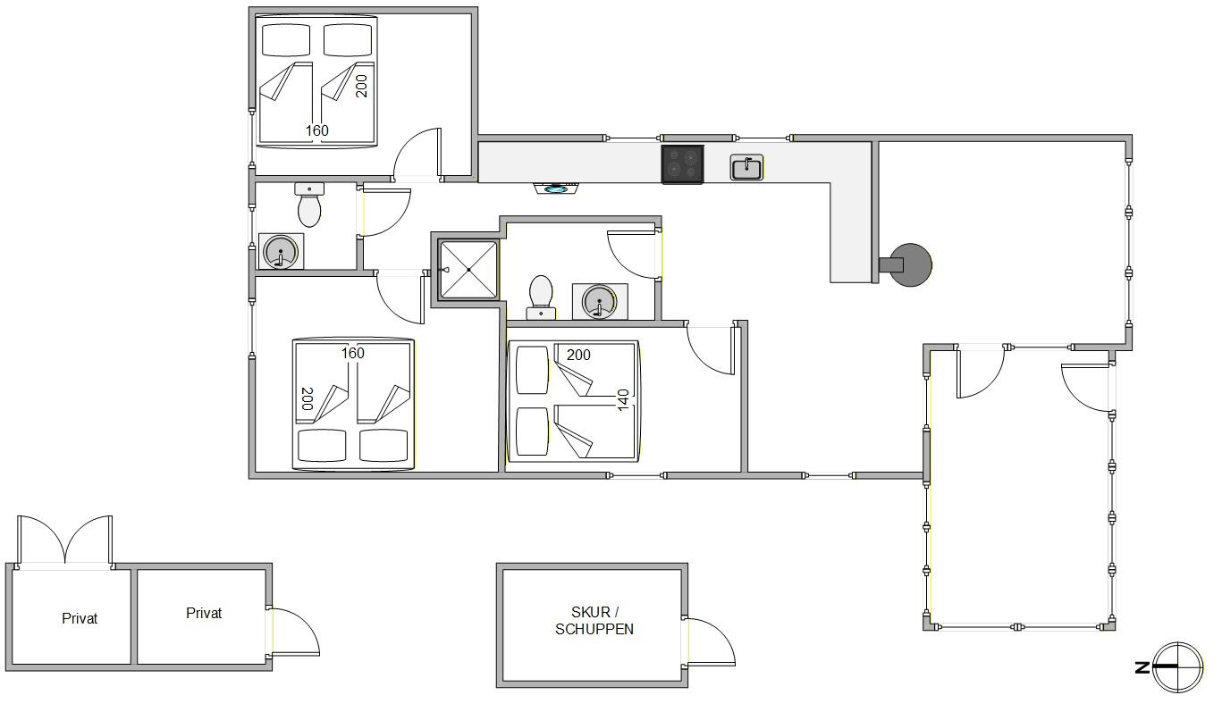 Das Badezimmer ist mit einer praktischen Dusche ausgestattet. Auch eine Waschmaschine und einen Trockner findet ihr im Sommerhus. Familien mit kleinen Kindern werden sich sicherlich über das bereits im Ferienhaus vorhandene Kinderbett und den Hochstuhl freuen. In den drei Schlafzimmern mit bequemen Doppelbetten werdet ihr euch sicherlich gut vom Alltagsstress erholen und könnt entspannt in den nächsten Urlaubstag starten.