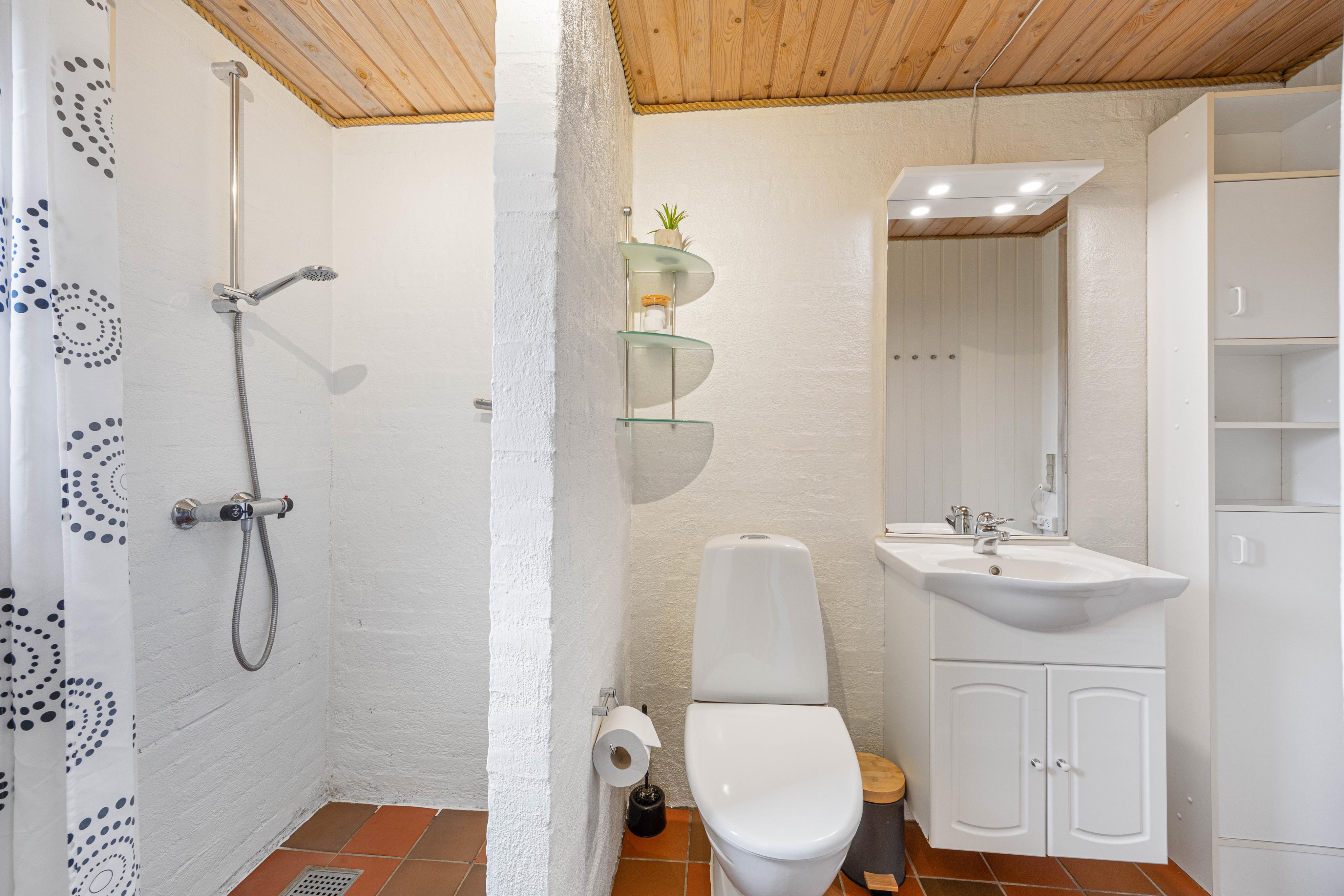 Nach einem Tag an der frischen Westküstenluft lädt das Badezimmer mit Fußbodenheizung und einer Sauna dazu ein, eure Muskeln zu wärmen und vollkommen abzuschalten. Eine kleine Wellnesspause tut gerade nach einem langen Strandspaziergang gut.