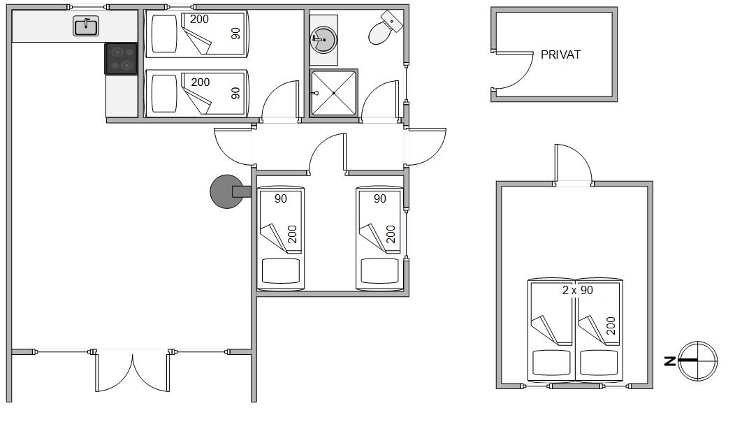 Das Ferienhaus bietet zwei Schlafzimmer, wobei eines mit einem Doppelbett und eines mit 2 Einzelbetten ausgestattet ist. Zwei weitere Schlafplätze findet ihr in dem Nebenhaus, welches mit dem Haupthaus durch eine Terrasse verbunden ist. Das Ferienhaus ist auch innen mit Holz bekleidet und verleiht zusammen mit dem hohen Decken und den sichtbaren Balken dem Haus seinen typischen Ferienhauscharme - Gemütlichkeit wird hier großgeschrieben.