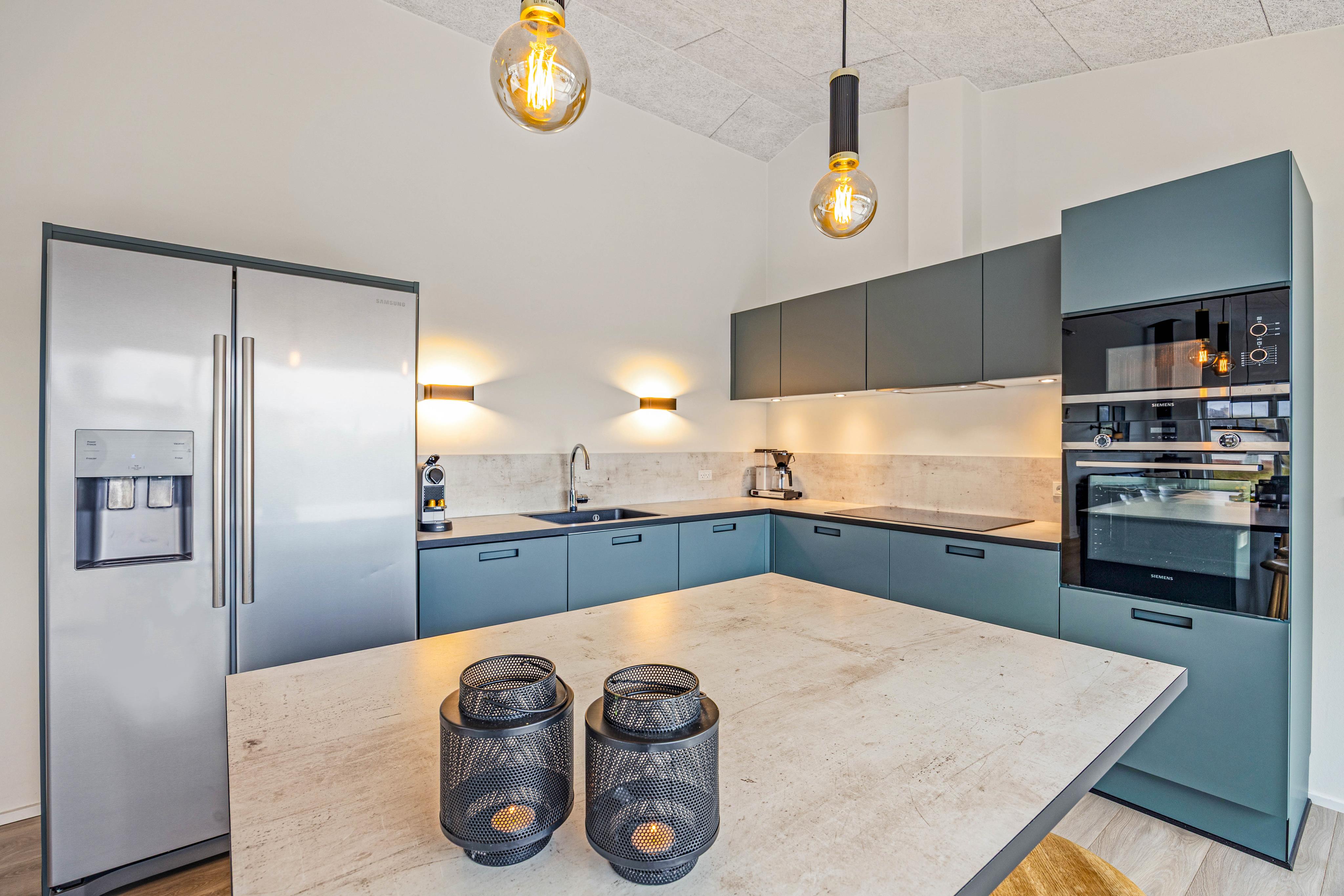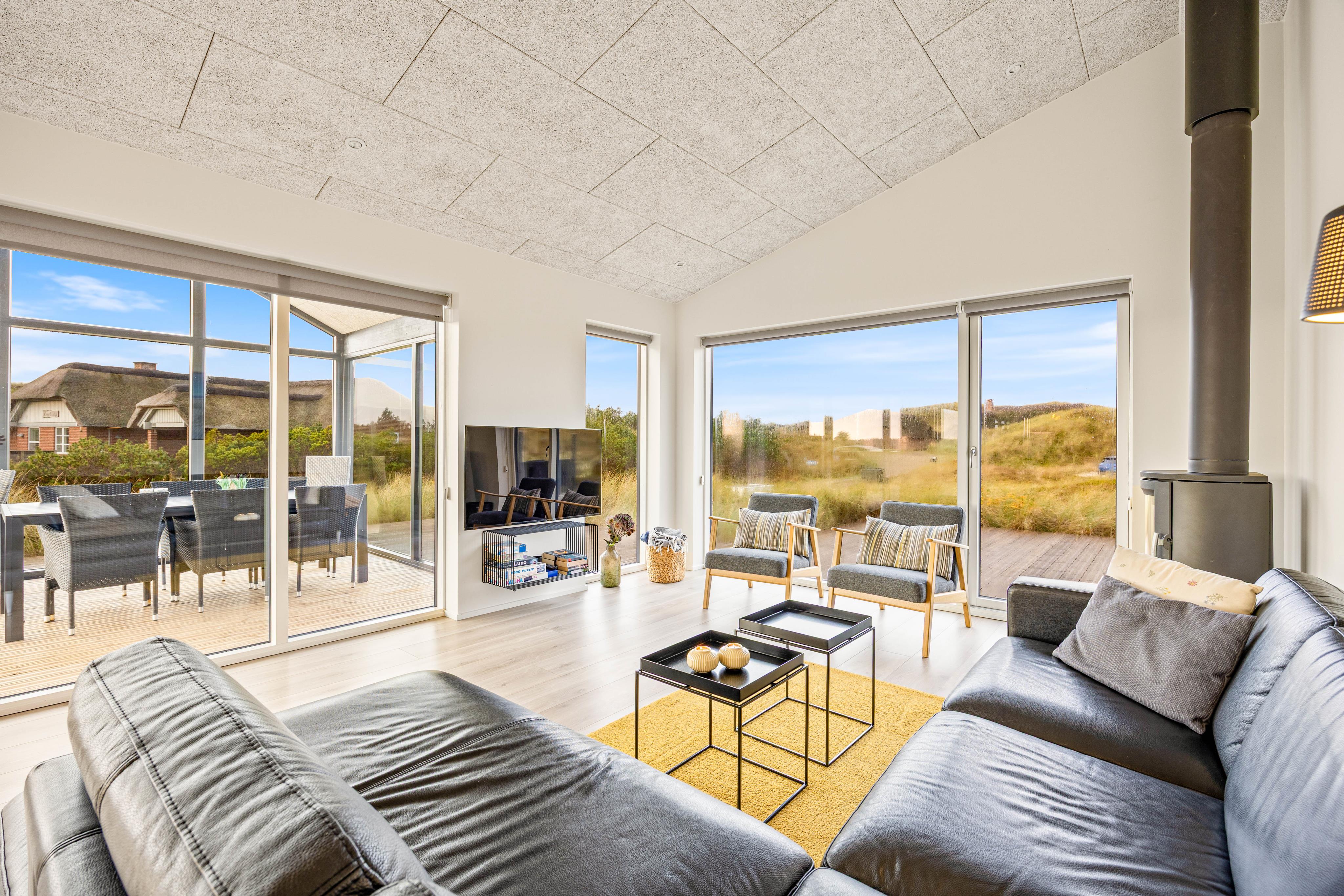 Ganz tolles Ferienhaus! Highlight für uns waren die Badezimmer! Jedes der drei Schlafzimmer hatte sein eigenes Bad, für die Privatsphäre wenn man mit anderen verreist perfekt. Sie sind modern und in ausreichender Größe. Der Whirlpool ist für einen entspannten Abend-Ausklang nur zu empfehlen. Die halb überdachte Terrasse war ein Traum, perfekt um windgeschützt draußen zu Essen, Gesellschaftsspiele zu spielen oder einfach sein Glas Wein am Abend zu genießen. Selbst die Wäsche kann bei Regen dort getrocknet werden. Jedes Zimmer verfügt über einen Fernseher. Die großen Fensterfronten bieten ein tollen Ausblick auf die Dünen/ schöne dänische Landschaft. Als Sonnen-/Sichtschutz sind Rollos vorhanden. Die Küche hat alles was man braucht. Der Kühlschrank ist riesig und macht sogar Eiswürfel.