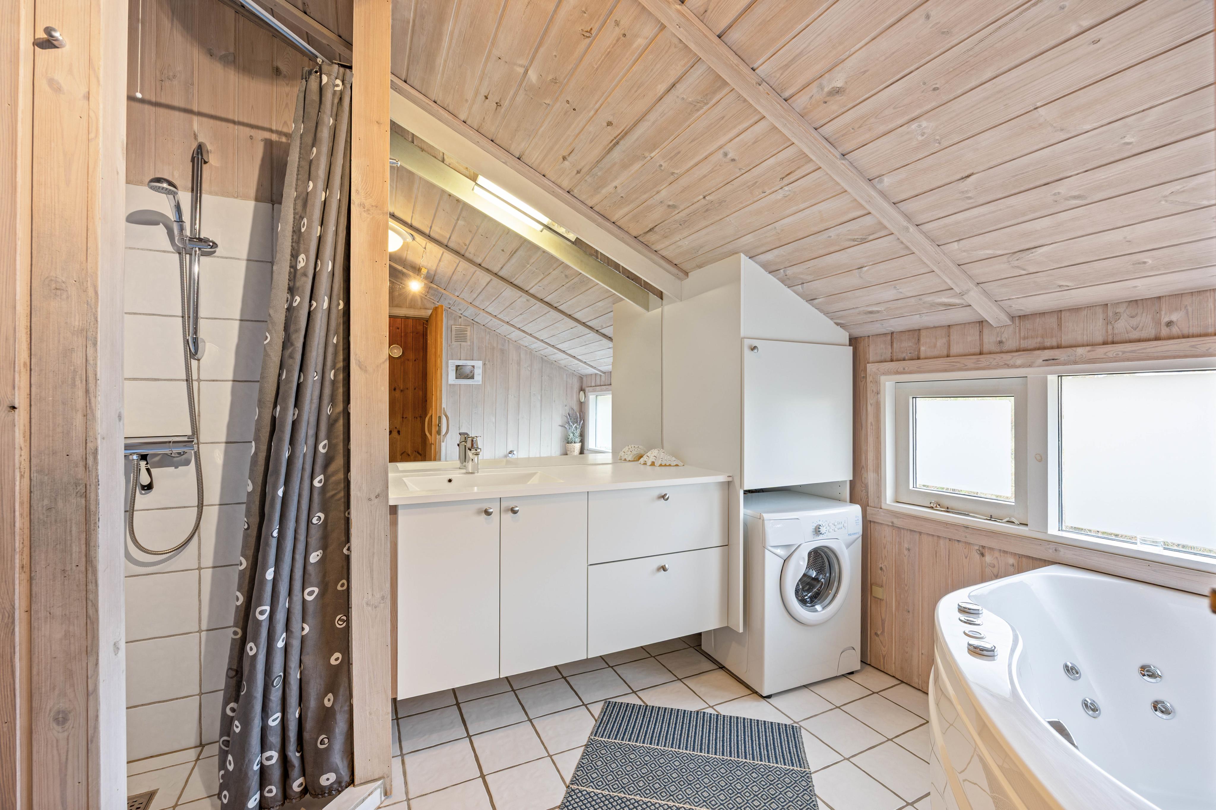 Das Badezimmer ist mit einer Fußbodenheizung ausgestattet, aber für warme Füße sorgen auch der Whirlpool und die Sauna. Hier im Badezimmer könnt ihr richtig schön entspannen nachdem ihr mit den Kindern am Strand getobt habt.