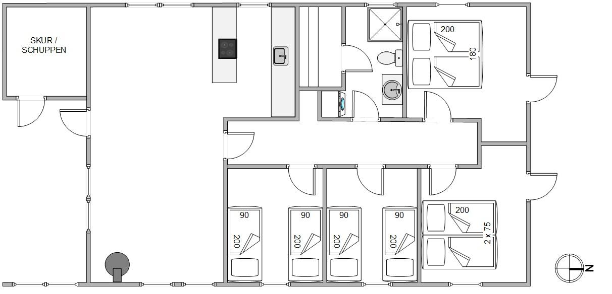 Die Küche ist offen und ihr könnt euch weiterhin mit allen im Haus unterhalten, während das Essen vorbereitet wird. Außerdem habt ihr im Ferienhaus eine Geschirrspülmaschine und eine Waschmaschine, damit ihr euch um nichts mehr Sorgen machen müsst. Für den Schlafkomfort stehen euch 4 Schlafzimmer mit 2 Doppelbetten und 4 Einzelbetten zur Verfügung.