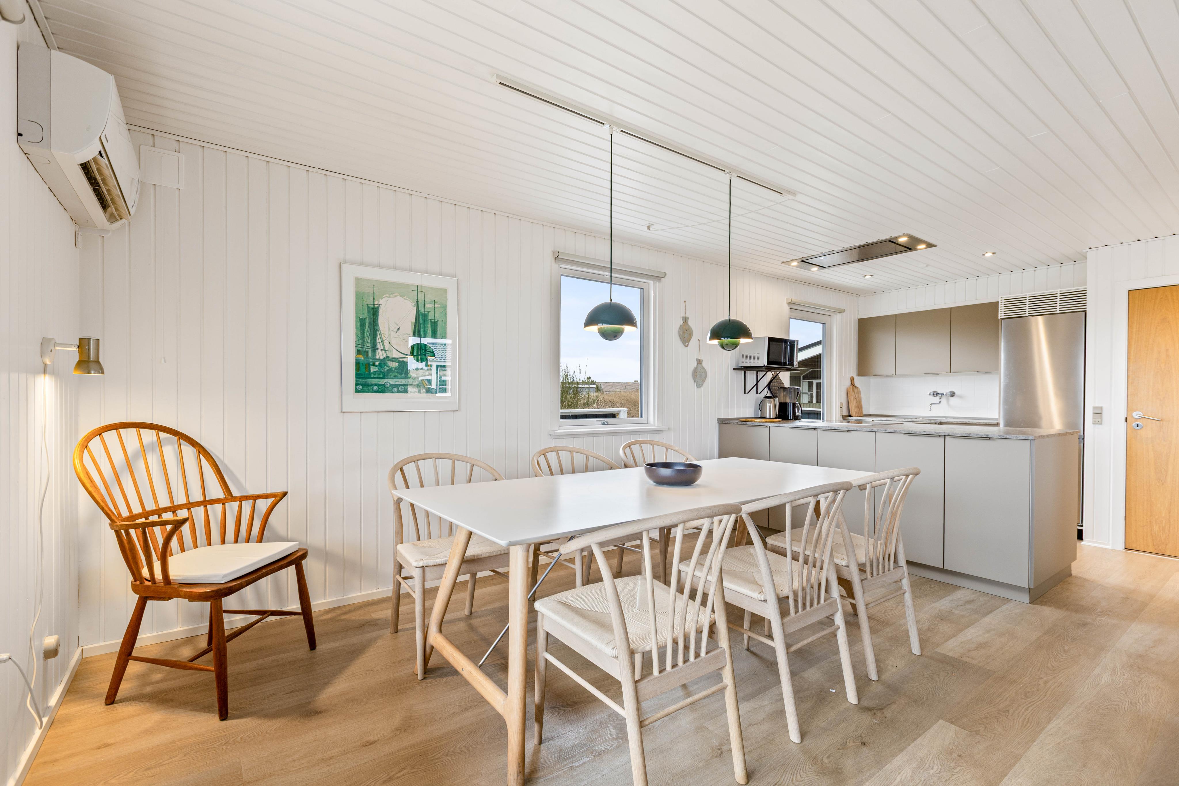 Dieses klassische, dänische Ferienhaus hat eine praktische Aufteilung. Im Wohn-Essbereich findet ihr Platz zum Verweilen und für entspannte Stunden mit eurer Familie. Wie wäre es z. B. mit einem gemeinsamen Spieleabend oder einem spannenden Film? Durch die Aufteilung der Schlafzimmer in eines mit Doppelbett und zwei Zimmer mit jeweils einem Hochbett, hat jedes Kind einen eigenen Schlafbereich.