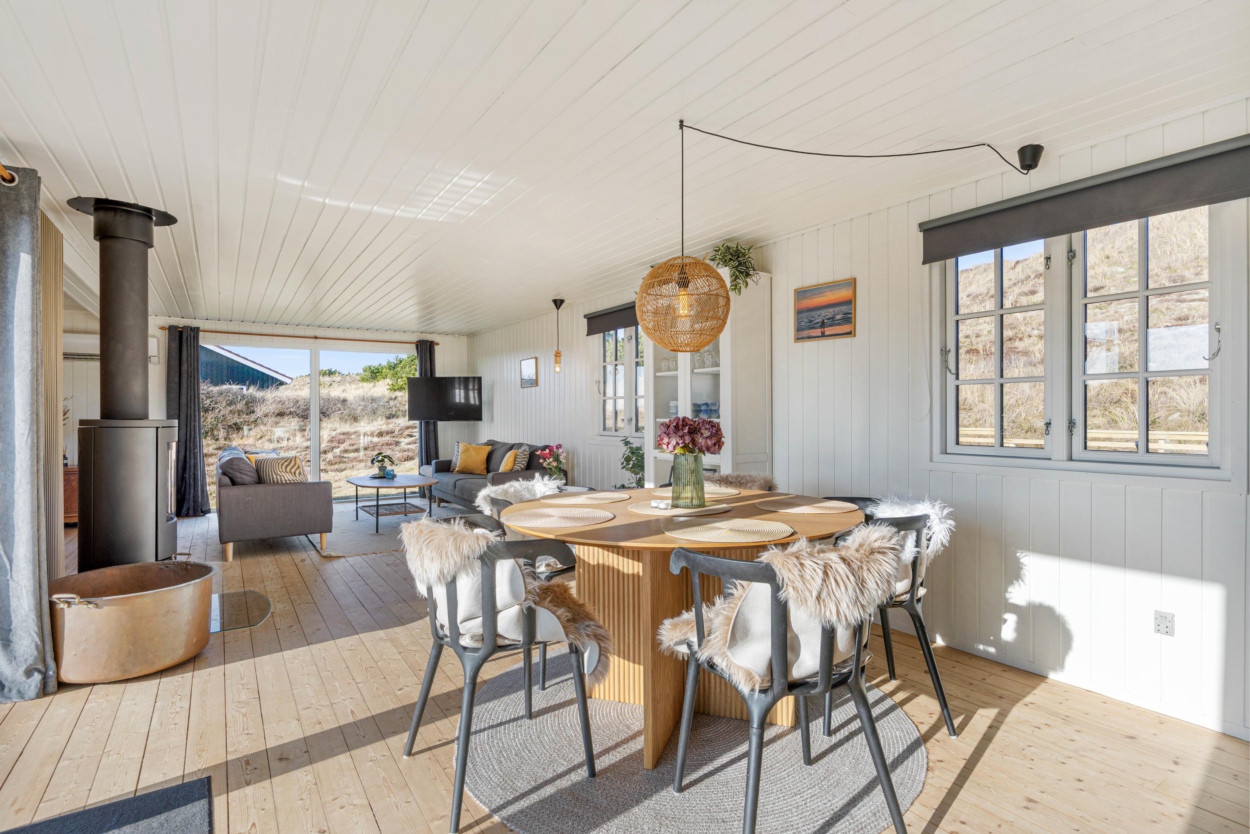 Im Inneren erwartet euch eine durchdachte Einrichtung mit allem, was ihr für einen komfortablen Aufenthalt braucht - eine gut ausgestattete Küche mit Spülmaschine sowie ein gemütlicher Wohnbereich mit Parabolantenne. Eine energiesparende Wärmepumpe und ein Kaminofen sorgen für wohlige Temperaturen. Im Ferienhaus auf Sommervej 42 erwarten euch zudem 3 liebevoll eingerichtete Schlafzimmer, die Raum für bis zu 5 Personen bieten.