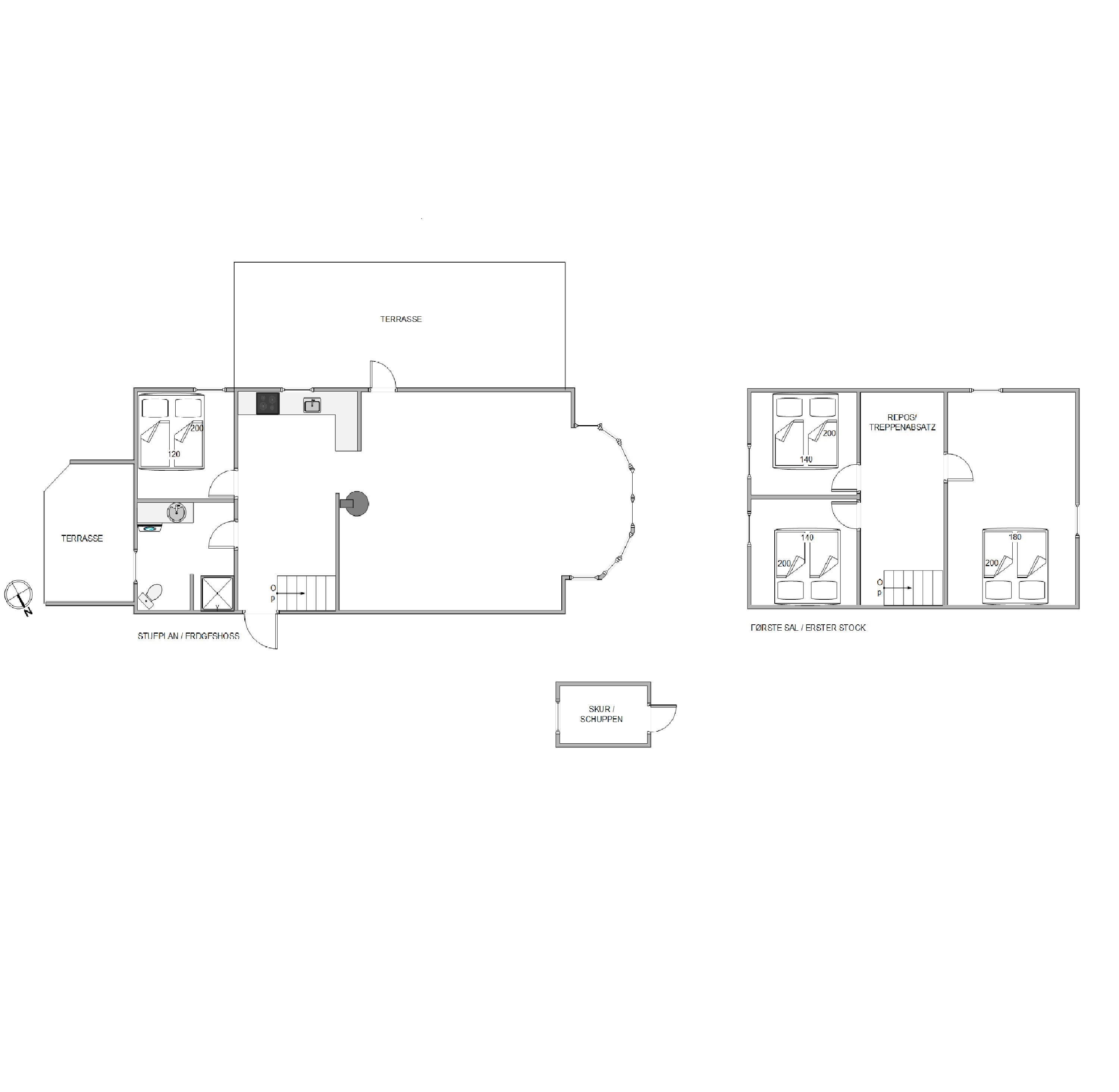 Insgesamt bietet das Ferienhaus Platz für bis zu 6 Personen und die Räumlichkeiten verteilen sich über 2 Etagen. Das Wohnzimmer mit Wintergarten sowie die Küche und das Badezimmer liegen im Erdgeschoss des Hauses. Drei Schlafzimmer, welche jeweils mit Doppelbett (180 cm und 140 cm breit), liegen in der 1. Etage und sind über eine offene Holztreppe zu erreichen.
