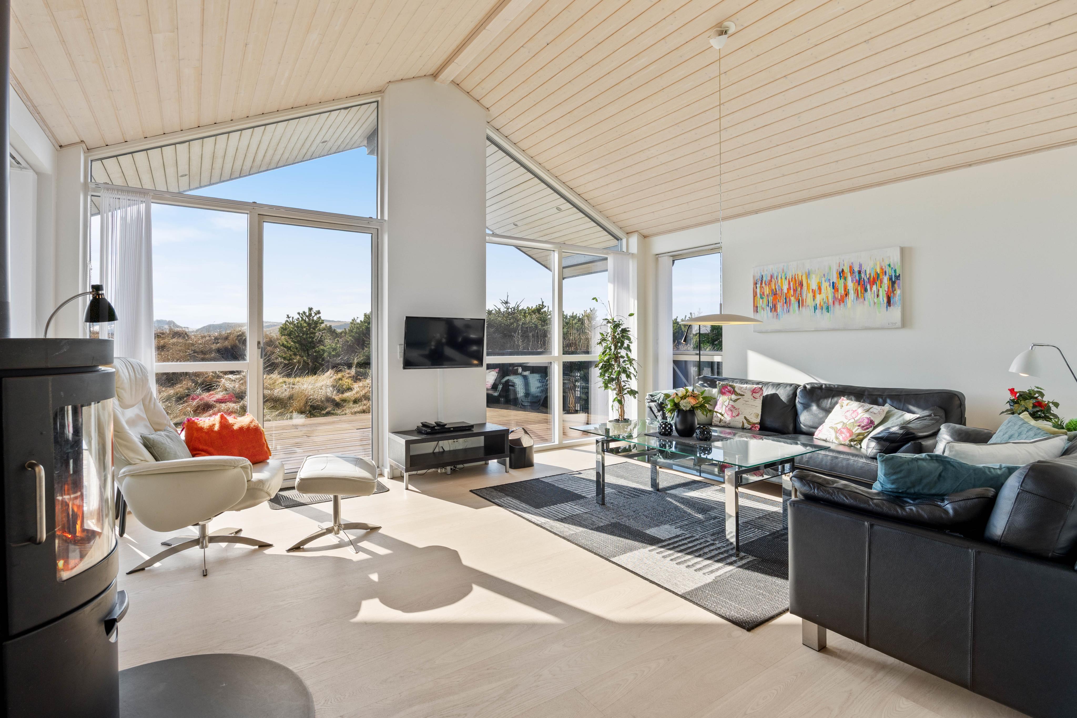 Im Wohnzimmer ist die Decke firsthoch und zusammen mit der großen Fensterfront sorgt sie dafür, dass Ihr mit Geräumigkeit und einer schönen Aussicht über die Naturlandschaft verwöhnt werdet, während der Kaminofen wohlige Wärme und eine gemütliche Atmosphäre verbreitet.