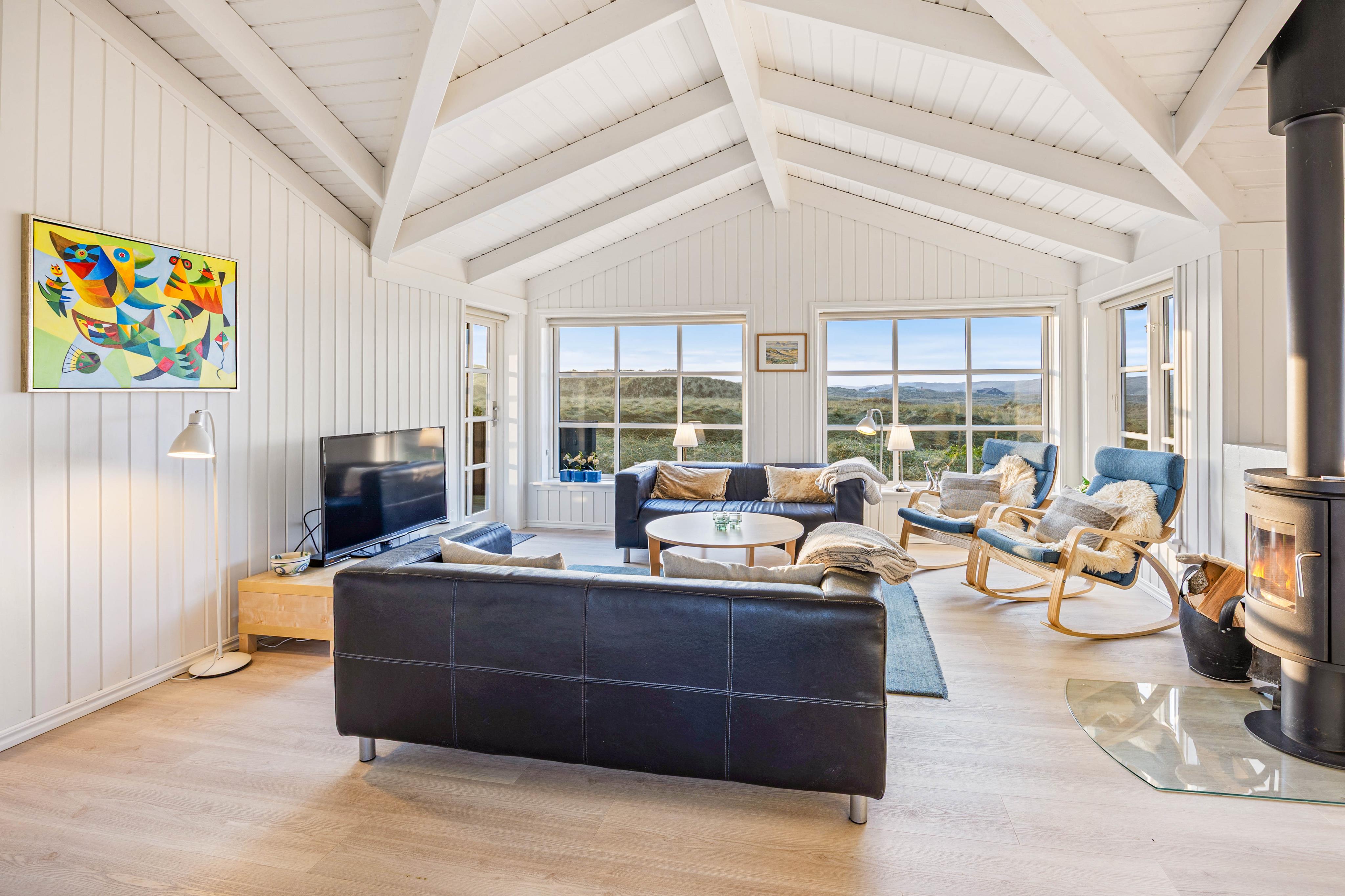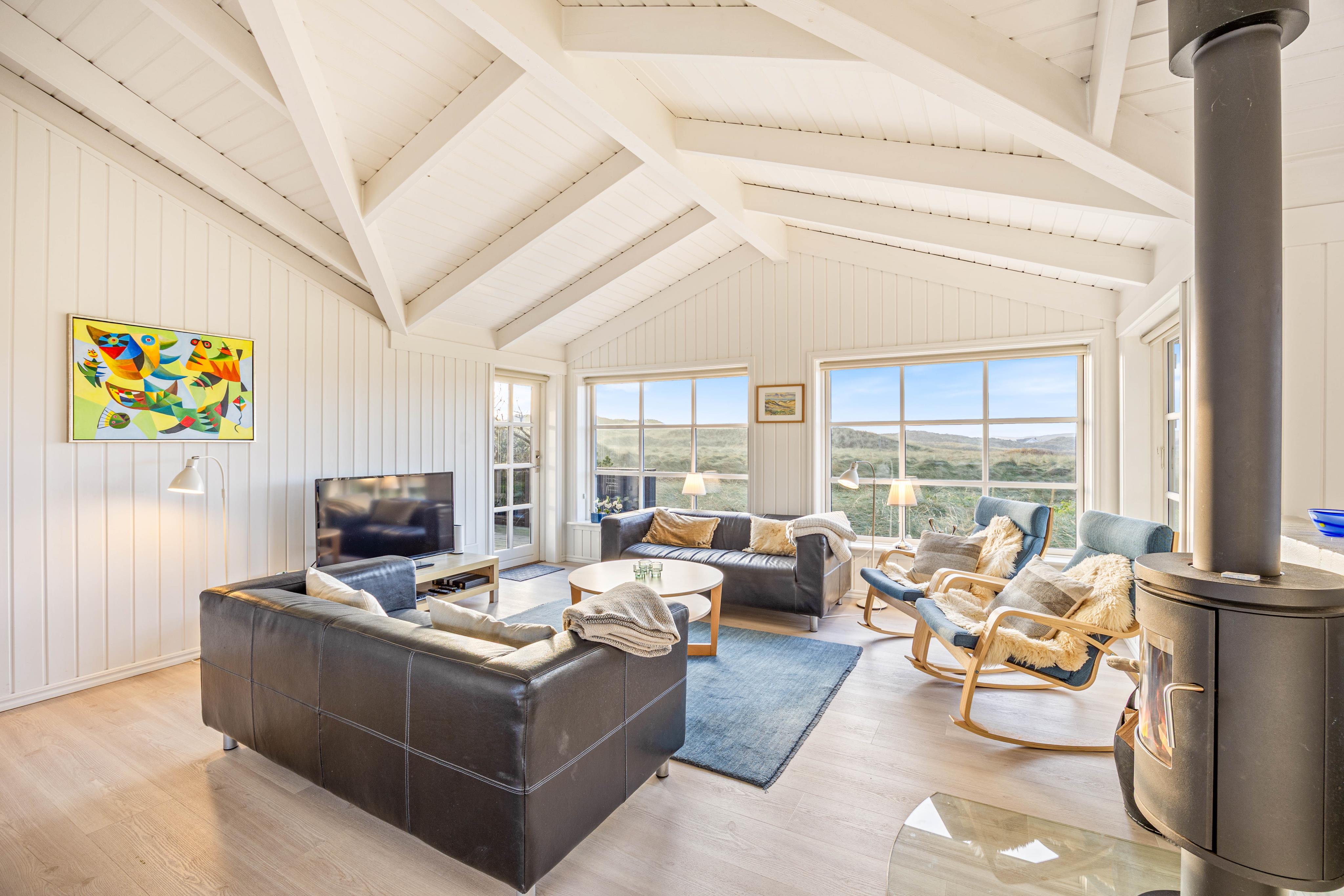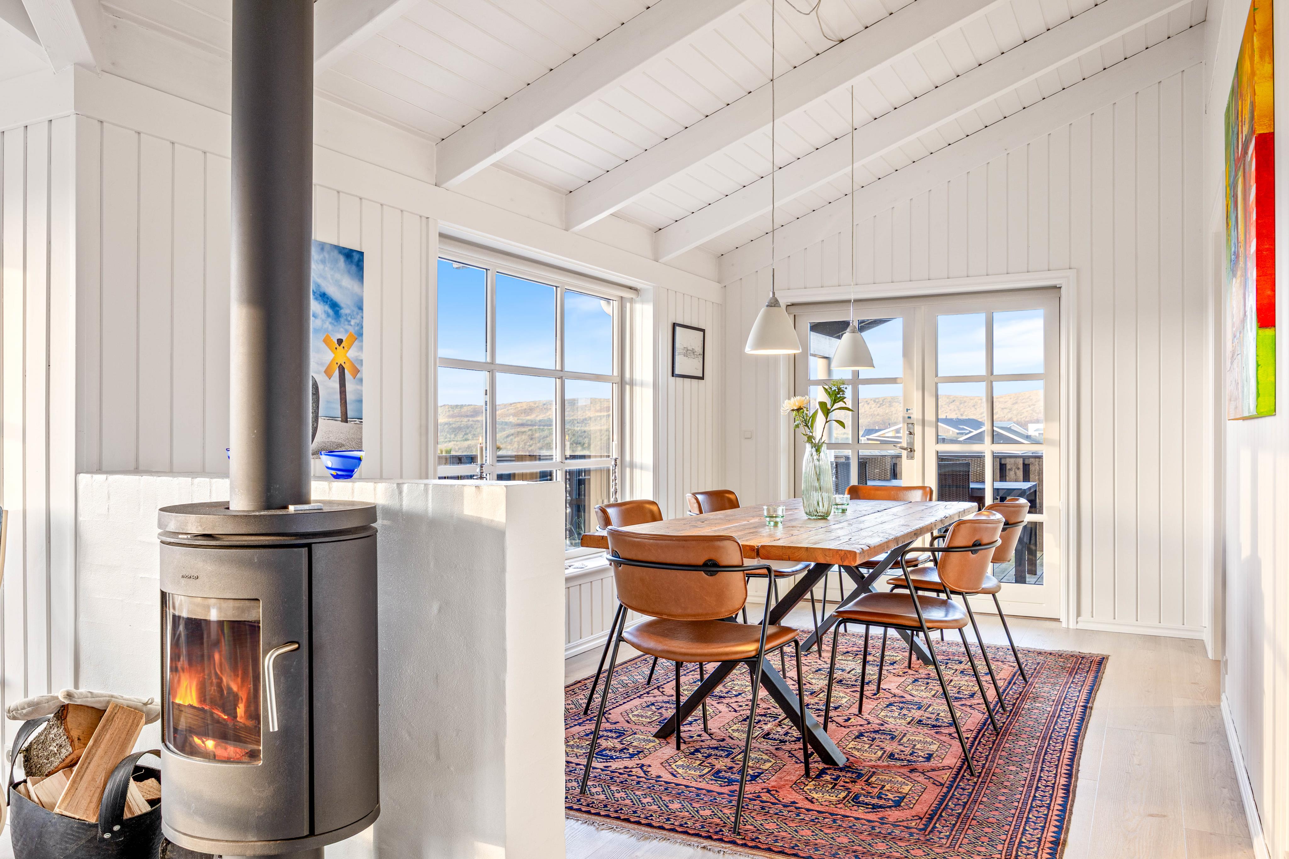 Ein sehr gemütliches und neueres Ferienhaus in Årgab. Das Ferienhaus hat firsthohe, weiße Decken und weiß gestrichene Wänd, zusammen mit der großen Fernsterpartie erscheint das Haus hell und einladend. Die Einrichtung ist sehr geschmackvoll.