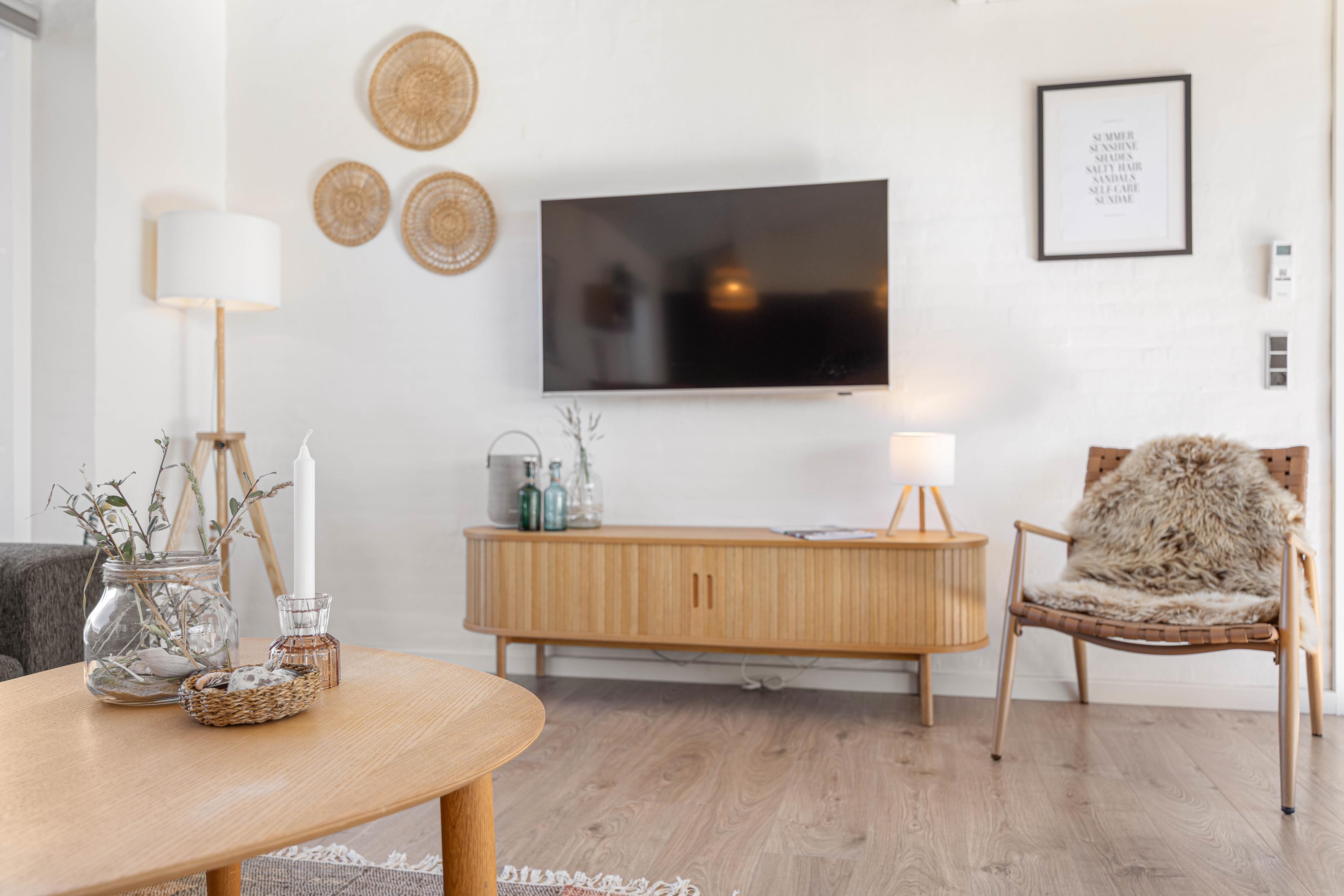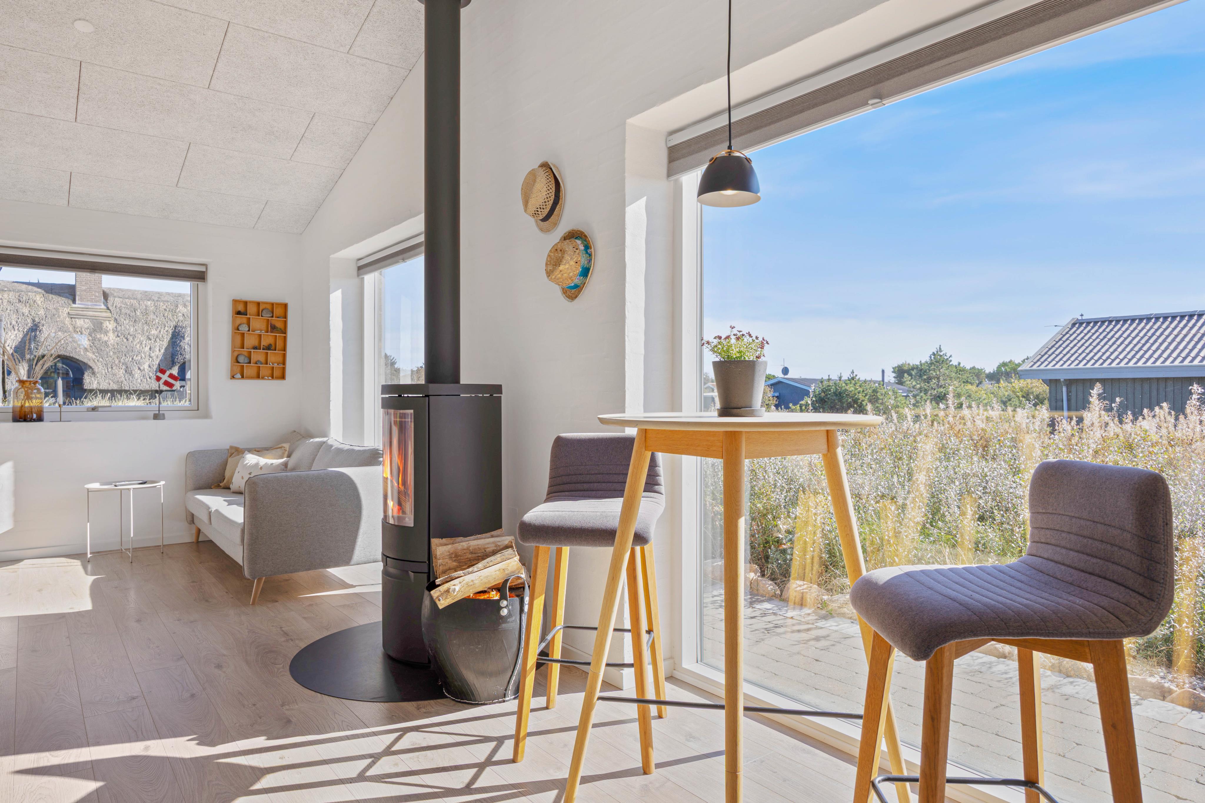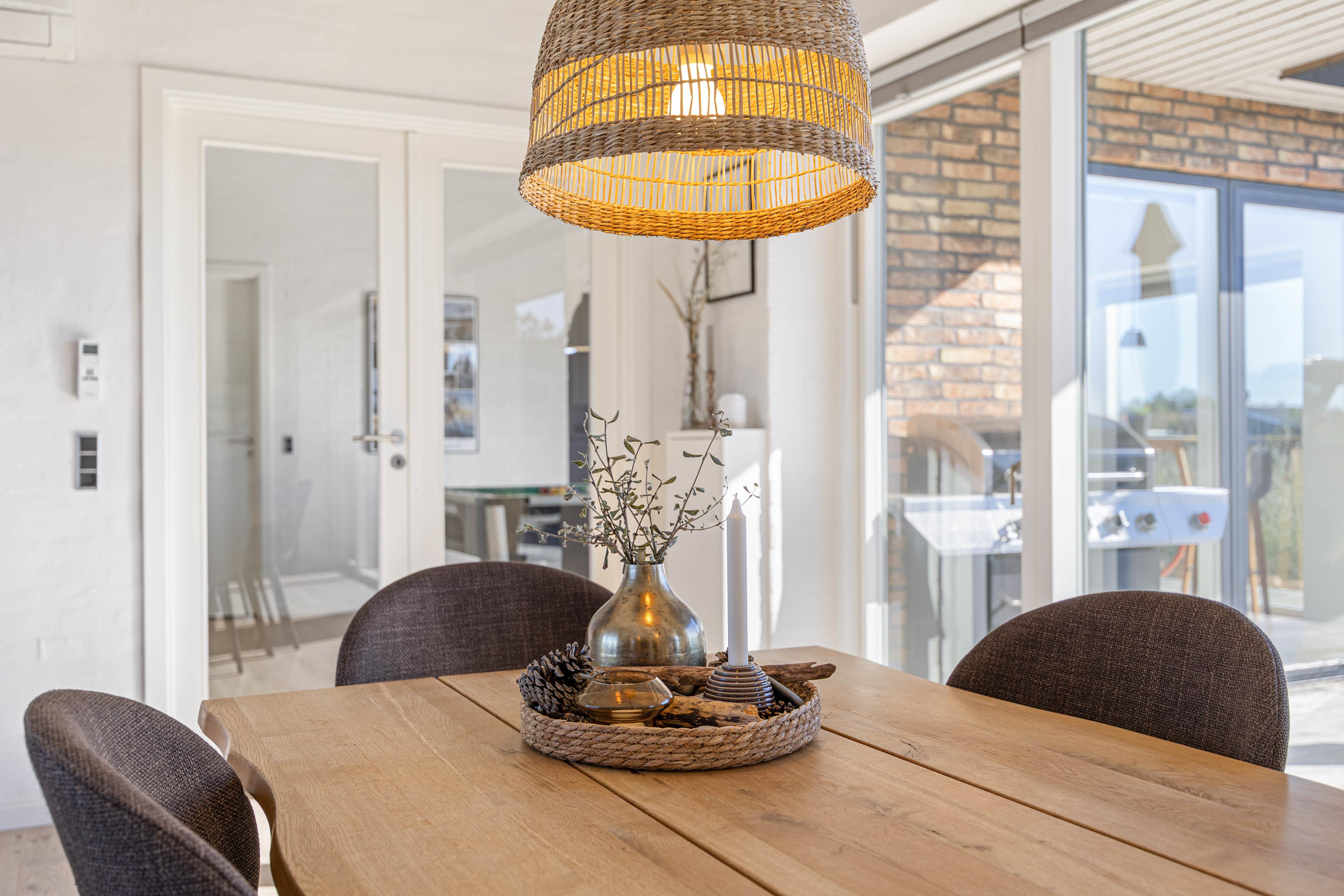 Das Zentrum des Hauses bildet der offene Wohn- und Essbereich, wo ihr es euch alle miteinander gemütlich machen könnt, neue Rezepte ausprobieren oder einfach nur die Beine hochlegen und in einem spannenden Buch lesen. Für besonders gemütliche Abende steht ein Kamin zur Verfügung, welcher für das perfekte Hyggegefühl sorgt. Andernfalls habt ihr aber auch die Möglichkeit, über die Wärmepumpe energiesparend für angenehme Raumtemperaturen zu sorgen.
