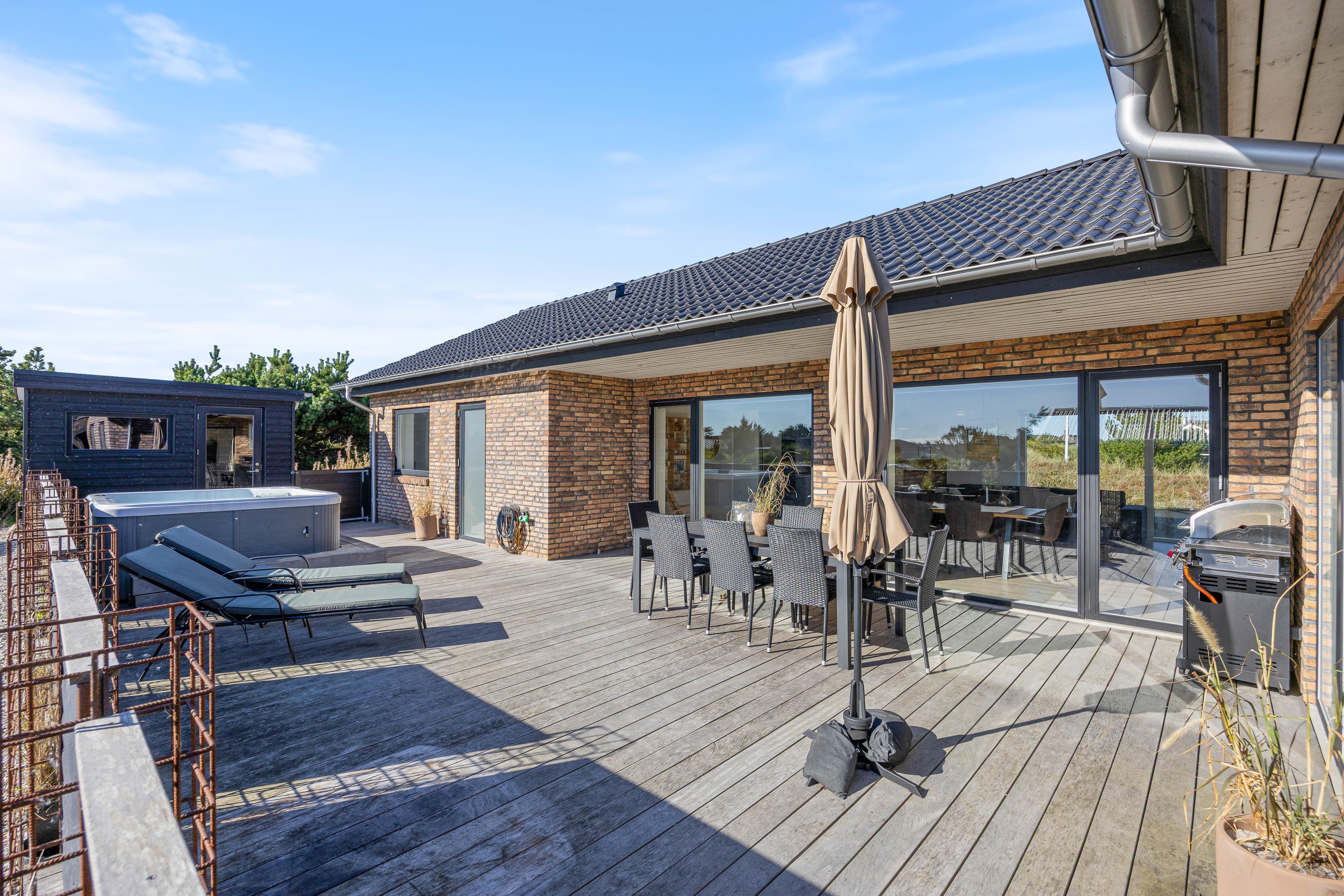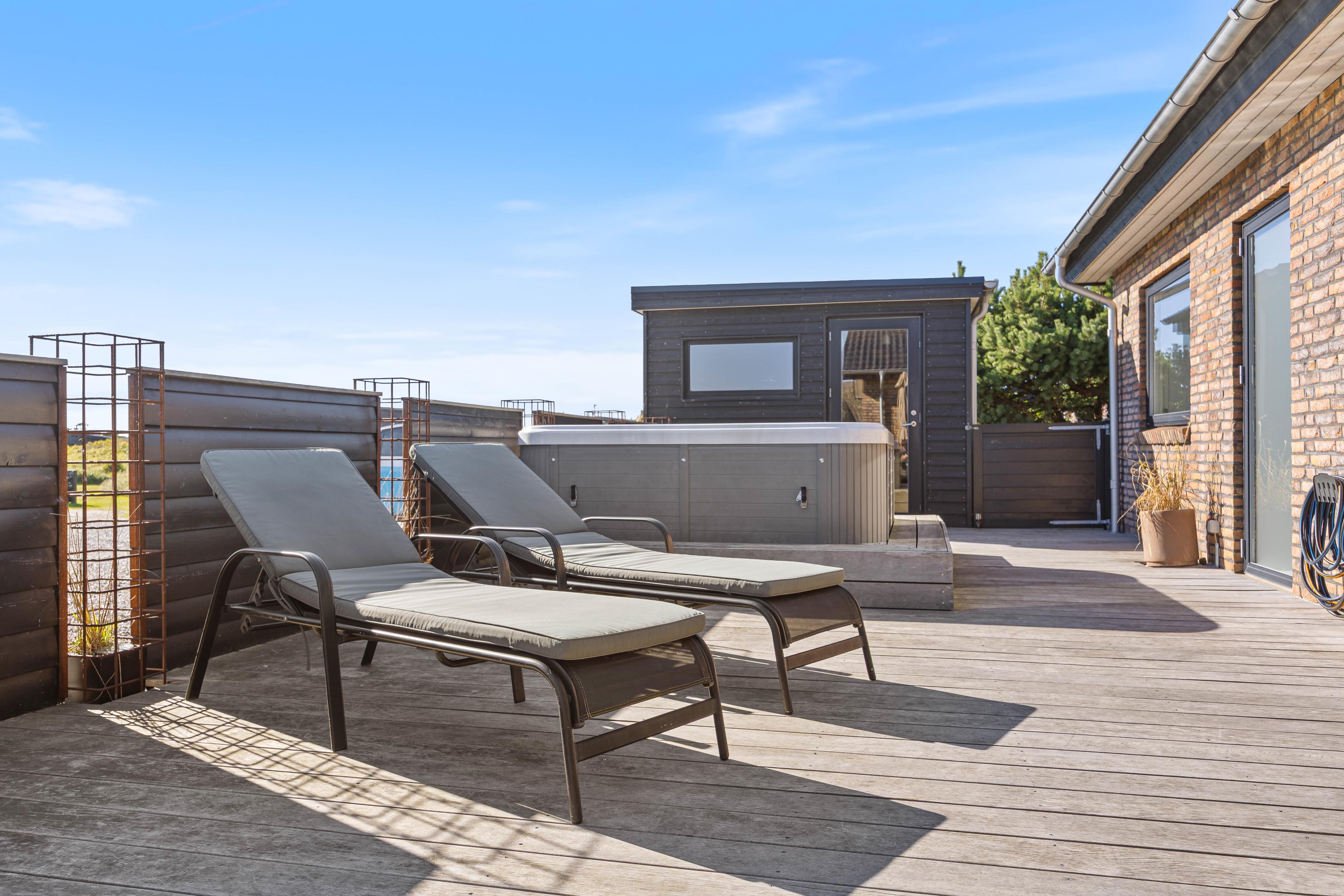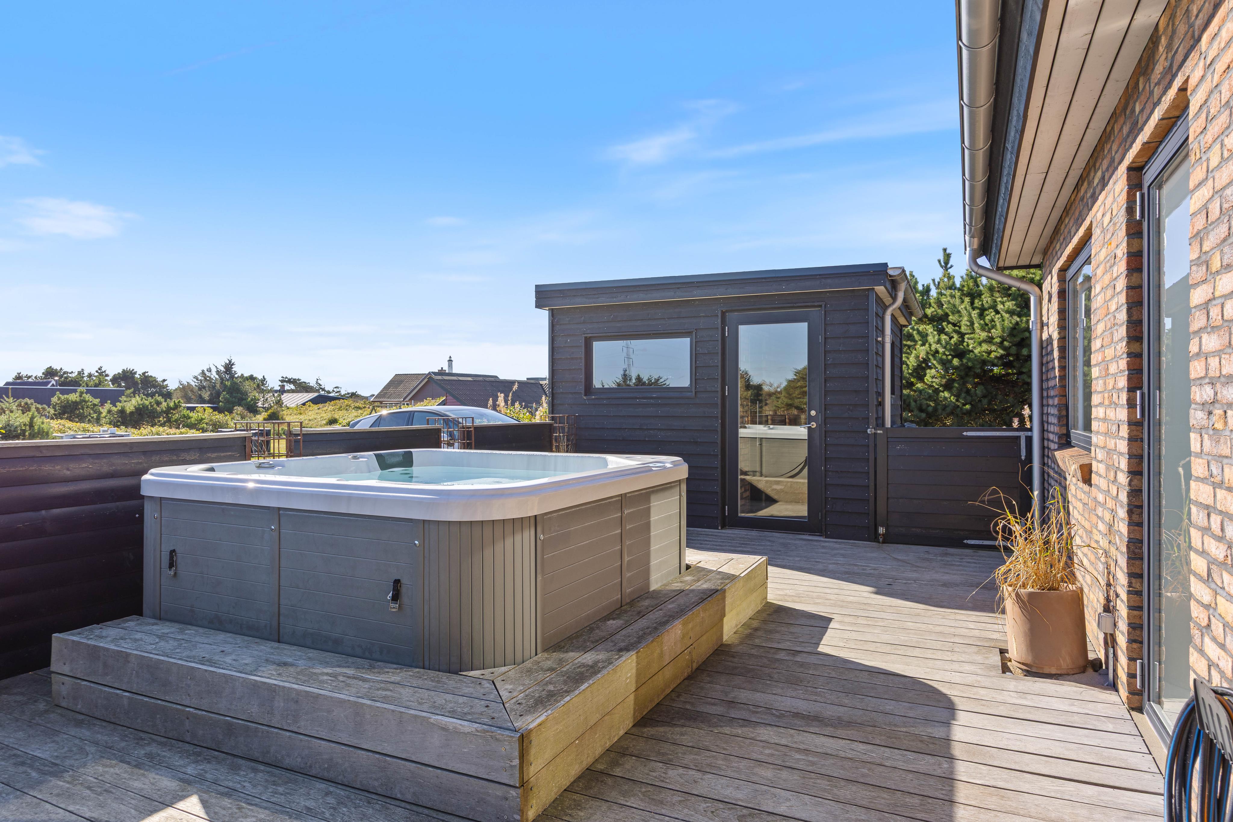 Geschlossene Terrasse mit Außenwhirlpool, Außensauna und Sandkasten