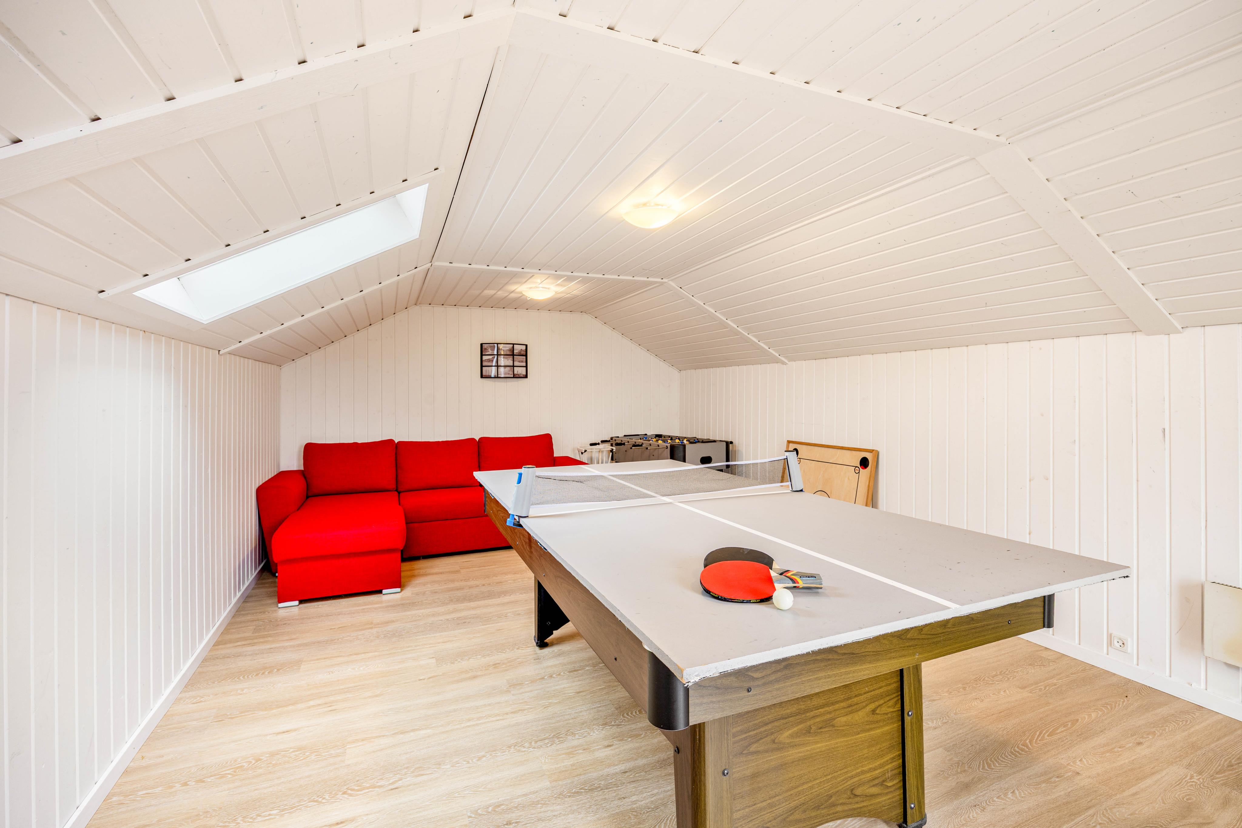 Zusätzliche zu dem Wohnbereich und den 3 Schlafzimmern mit insgesamt 7 Betten gehört zu diesem Ferienhaus ein Nebengebäude mit dem Aktivitätsraum. Dies ist ein wahres Spielparadies, wo ihr eure Kräfte bei Billard, Tischfussball oder auch Tischtennis messen könnt. Während einige vielleicht lieber im Wohnzimmer hoch konzentriert ihre Lieblingsserie schauen wollen, können sich andere hier austoben, ohne mit ihrem Gejubel für Unruhe zu sorgen. Es gibt also genügend Freiraum für alle.